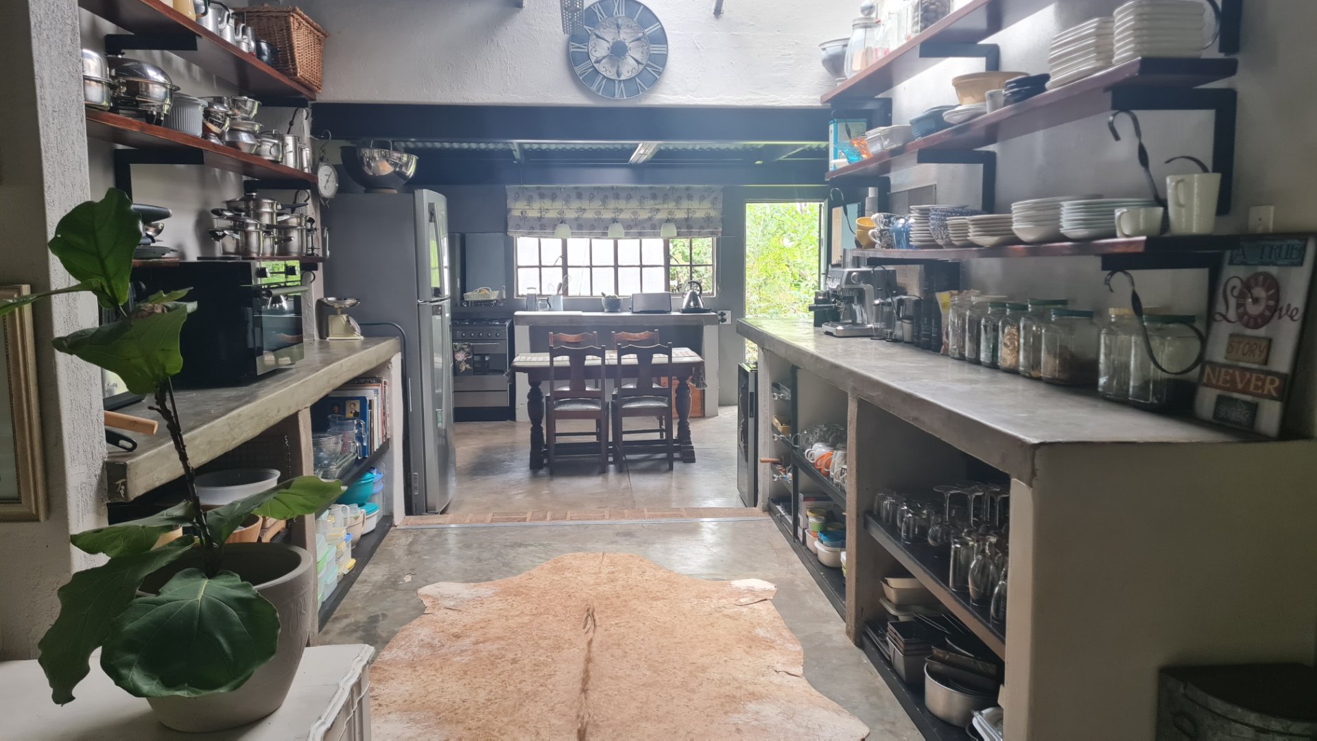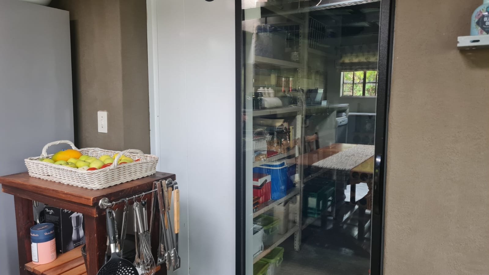 The kitchen is open plan with a large walk in fridge.