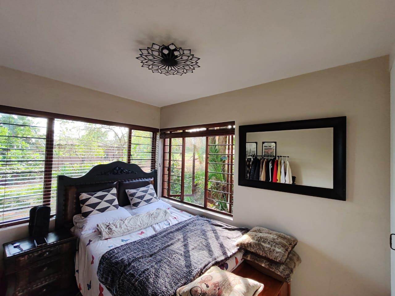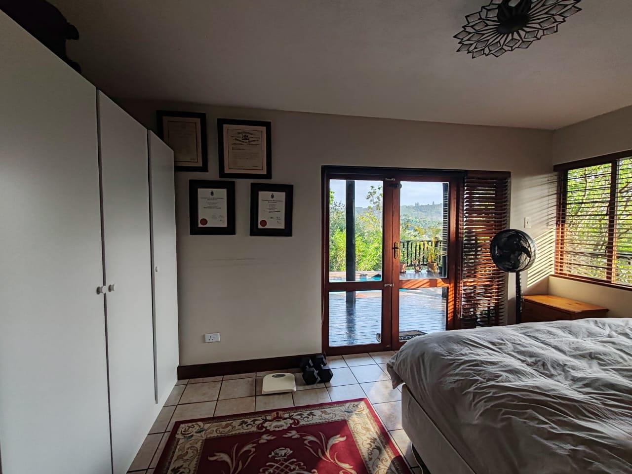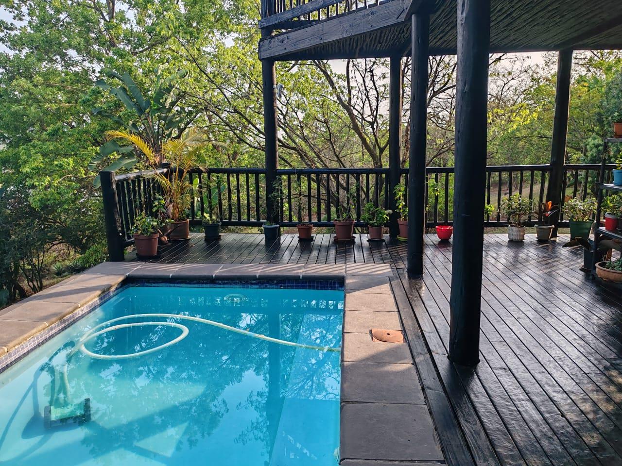 A huge open plan kitchen and living area with a cosy fireplace flows seamlessly onto the covered wooden veranda with a Built-in braai, heated sparkling pool and breathtaking view over the Da Gama dam. Beautiful, lush trees surround the entire reserve.