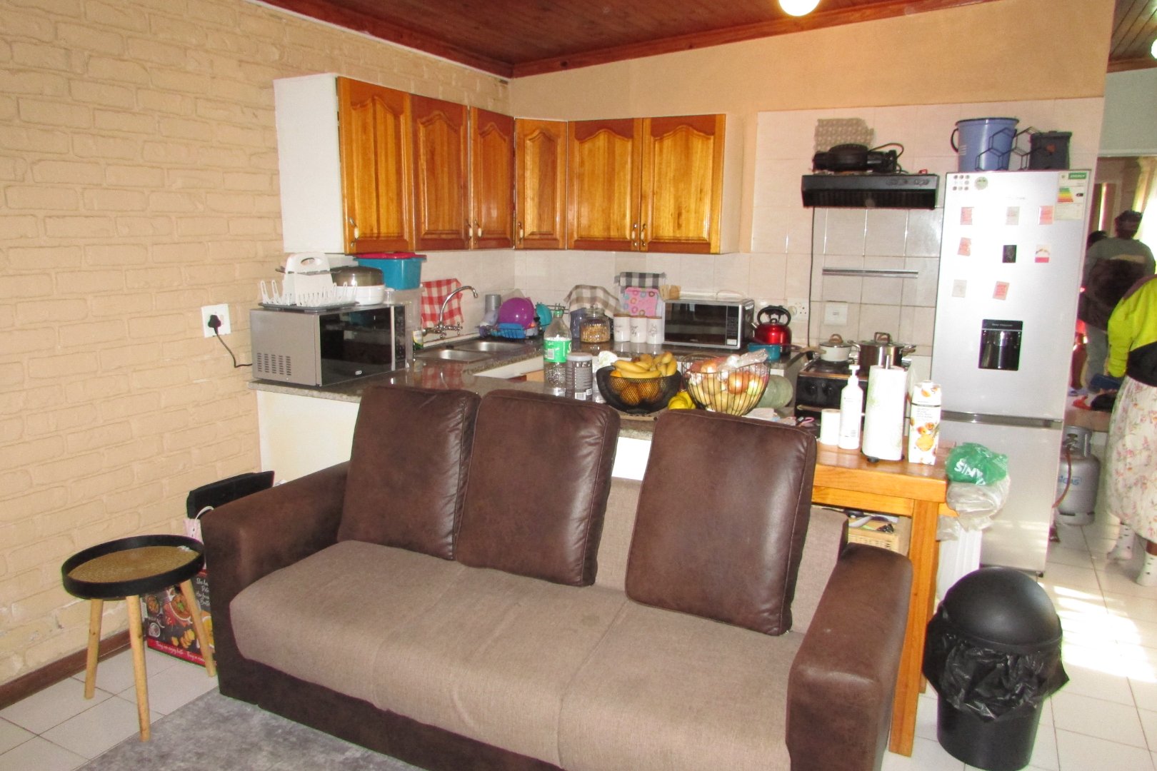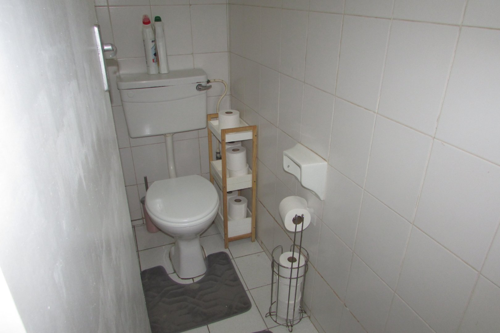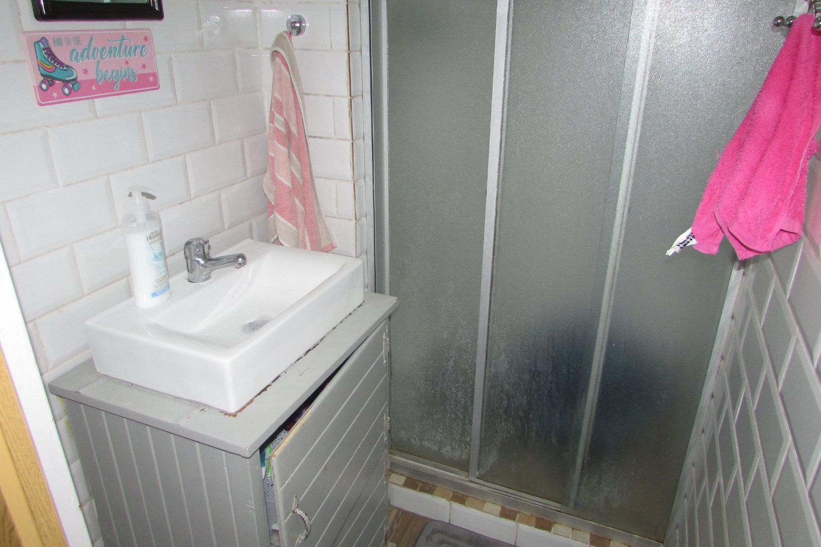Single bathroom with shower and basin, and a separate toilet. Open plan kitchen and living area.