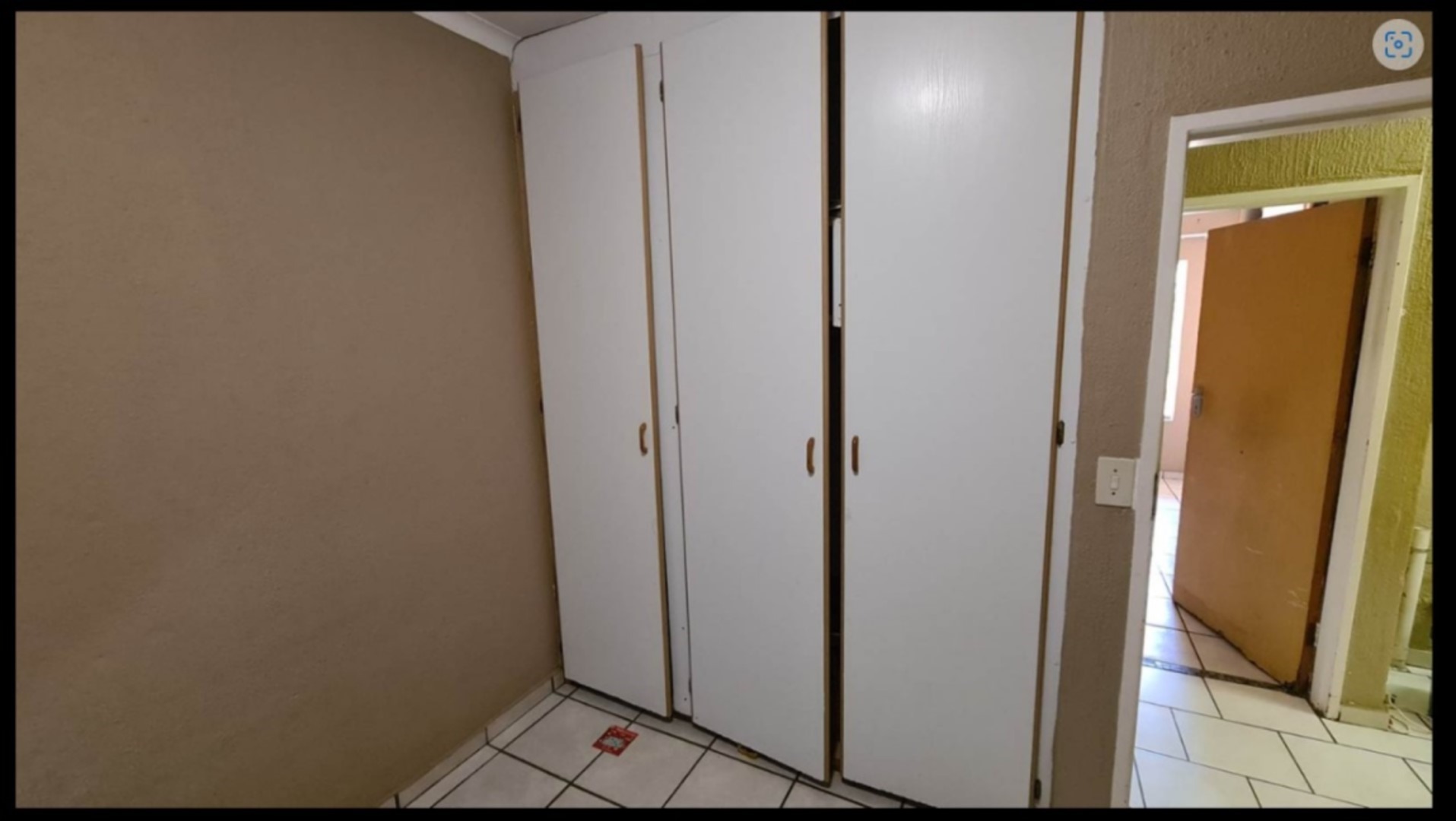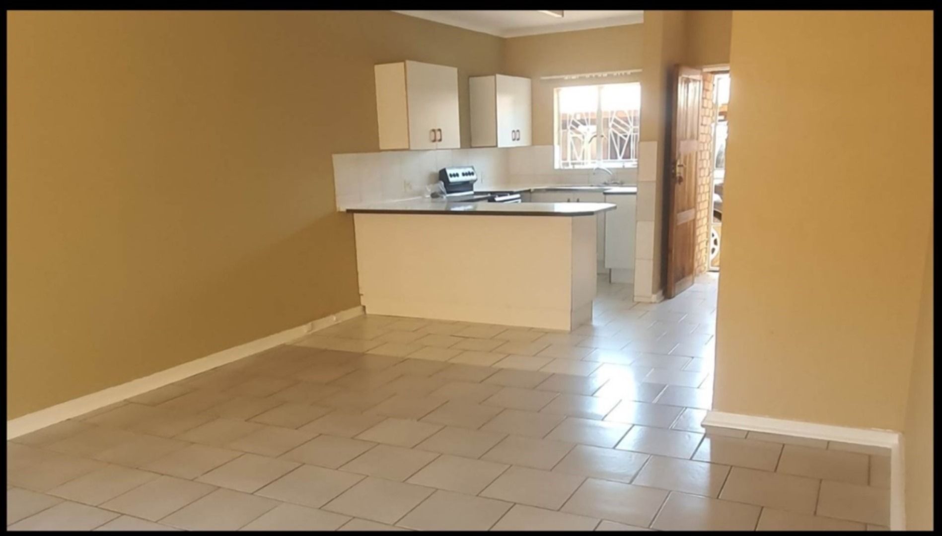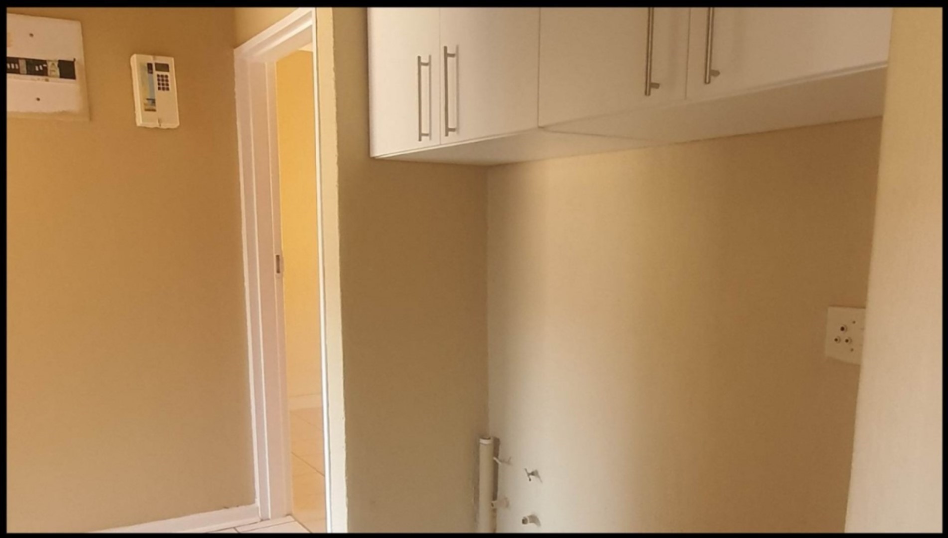 Features: Two bedrooms, a full bathroom, an open living area, and a laundry-like passage with connections for a washing machine and extra cupboard space.