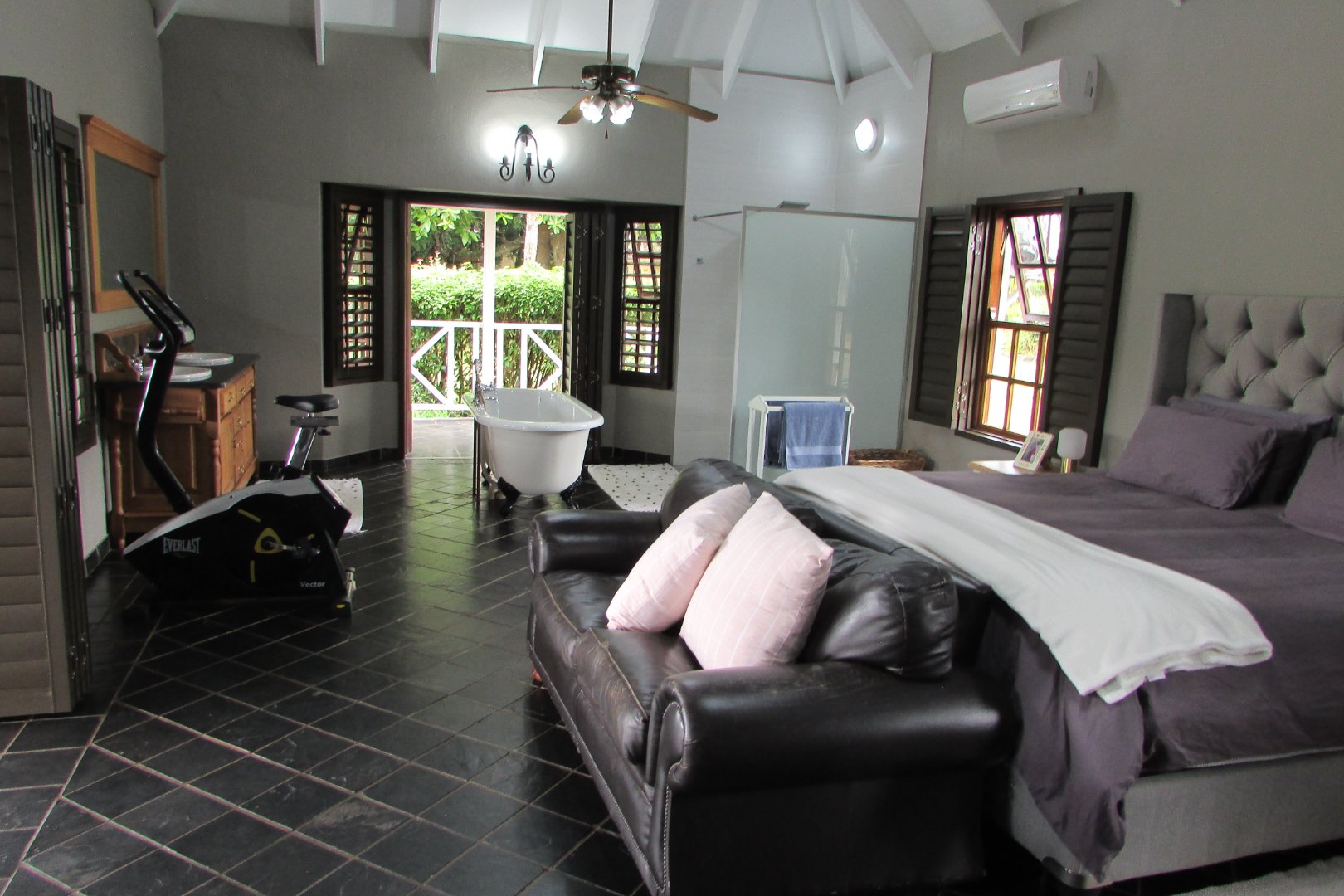 Main en-suite bedroom with open-plan bath & shower, walk-in closet, 2 air conditioners & private balcony