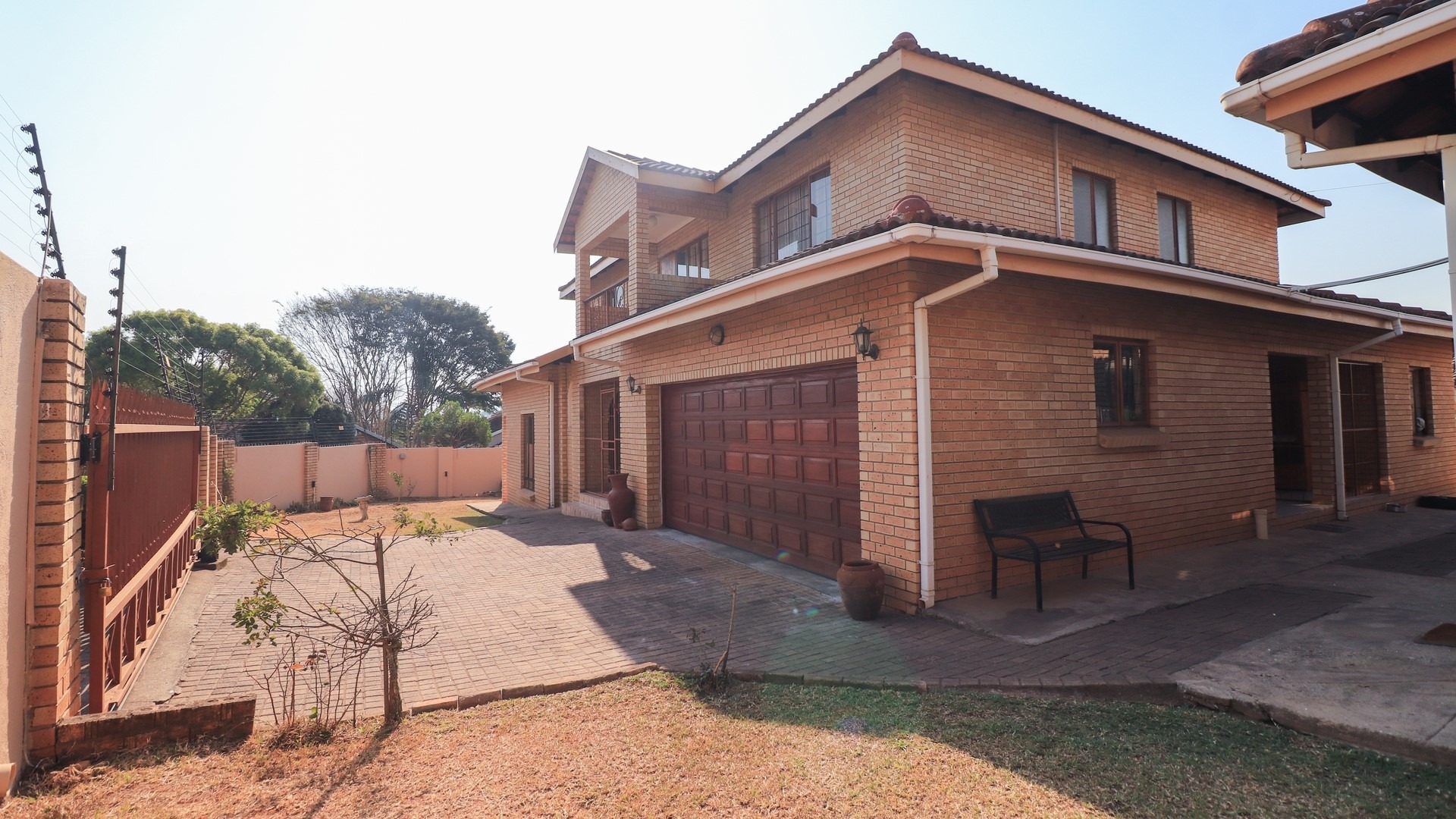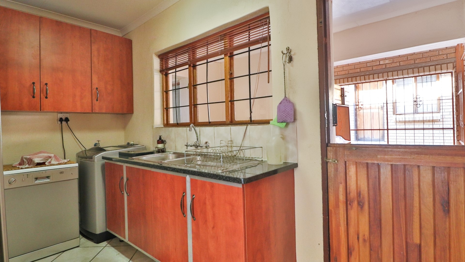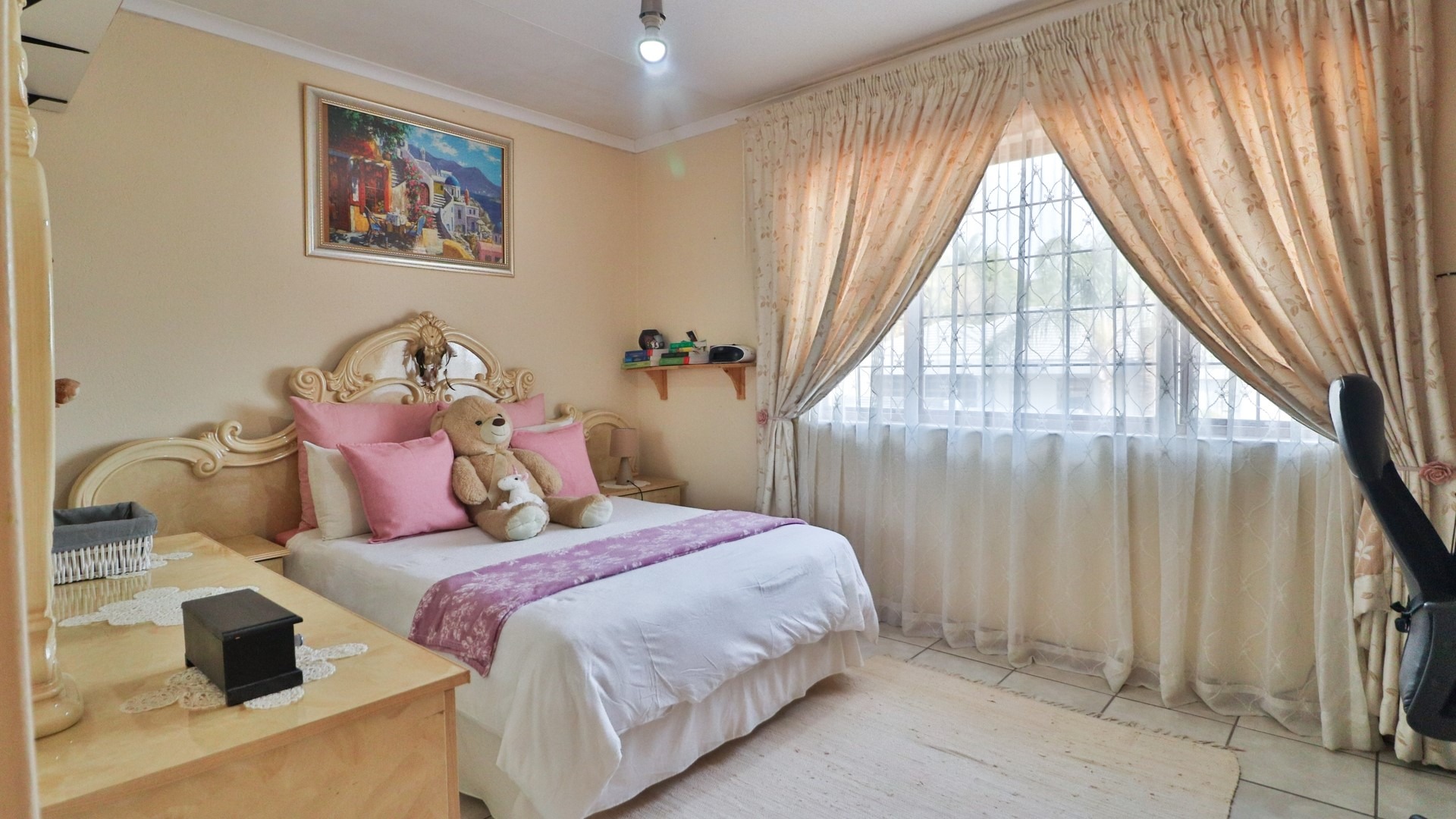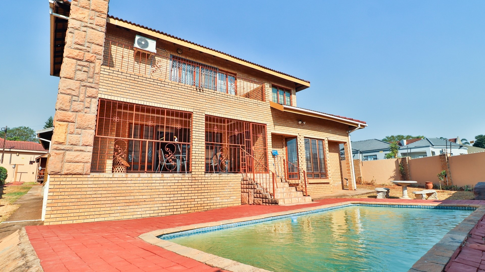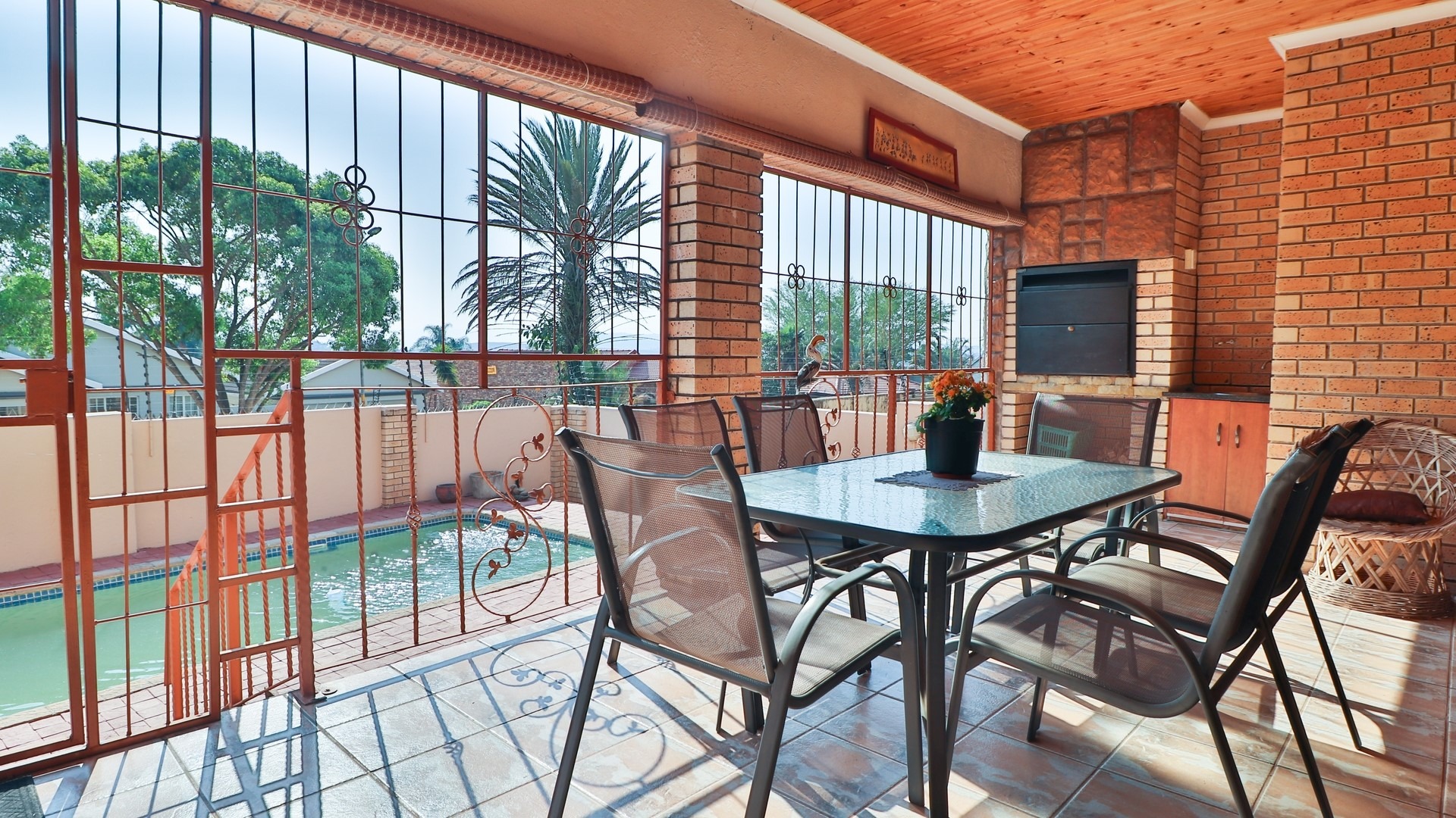The heart of the home is the modern kitchen, featuring sleek black granite countertops, a breakfast nook, and ample storage with a scullery/laundry and pantry. The dining room opens up to an enclosed patio with a built-in braai, overlooking the pool and garden, perfect for entertaining.
