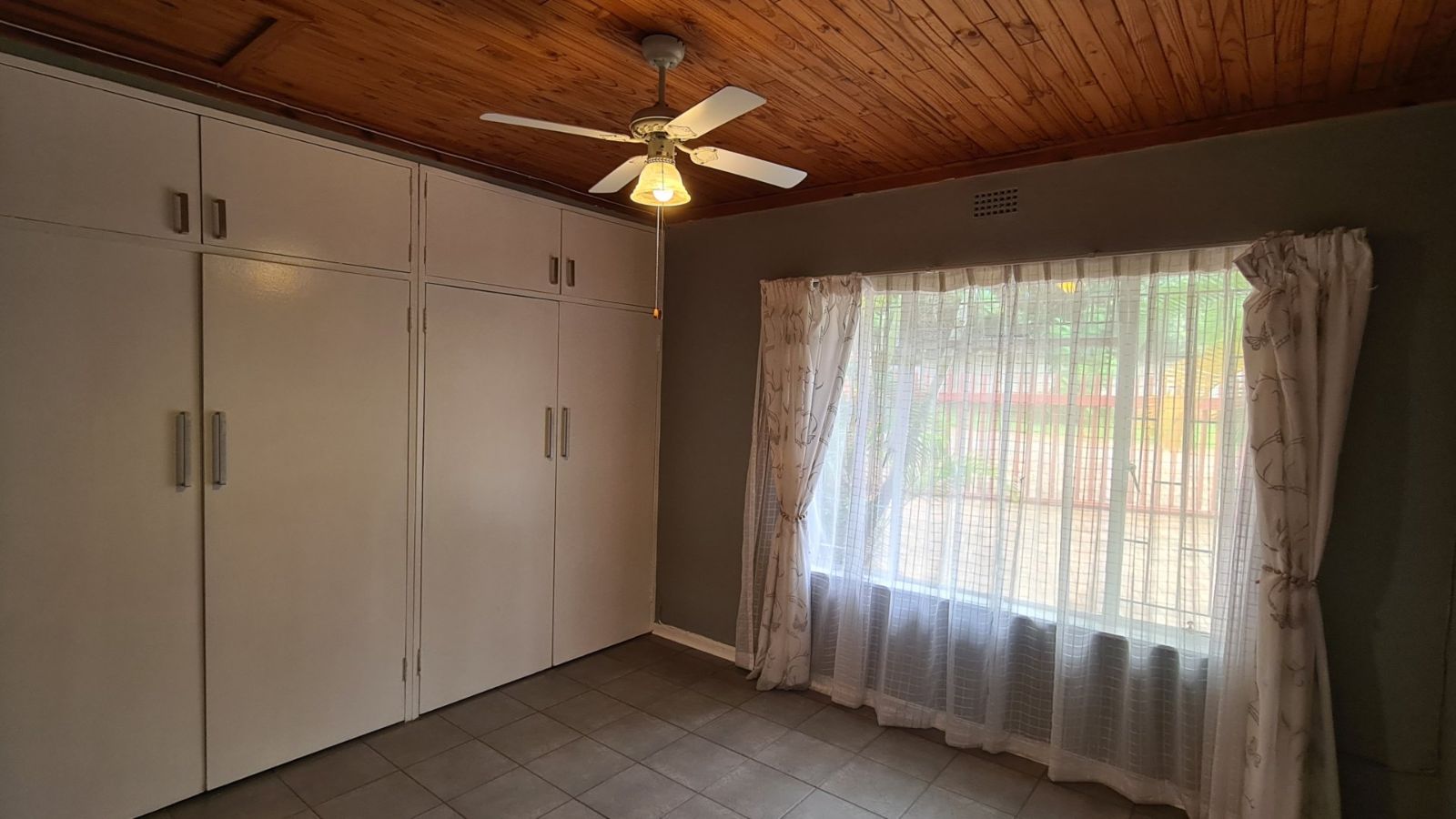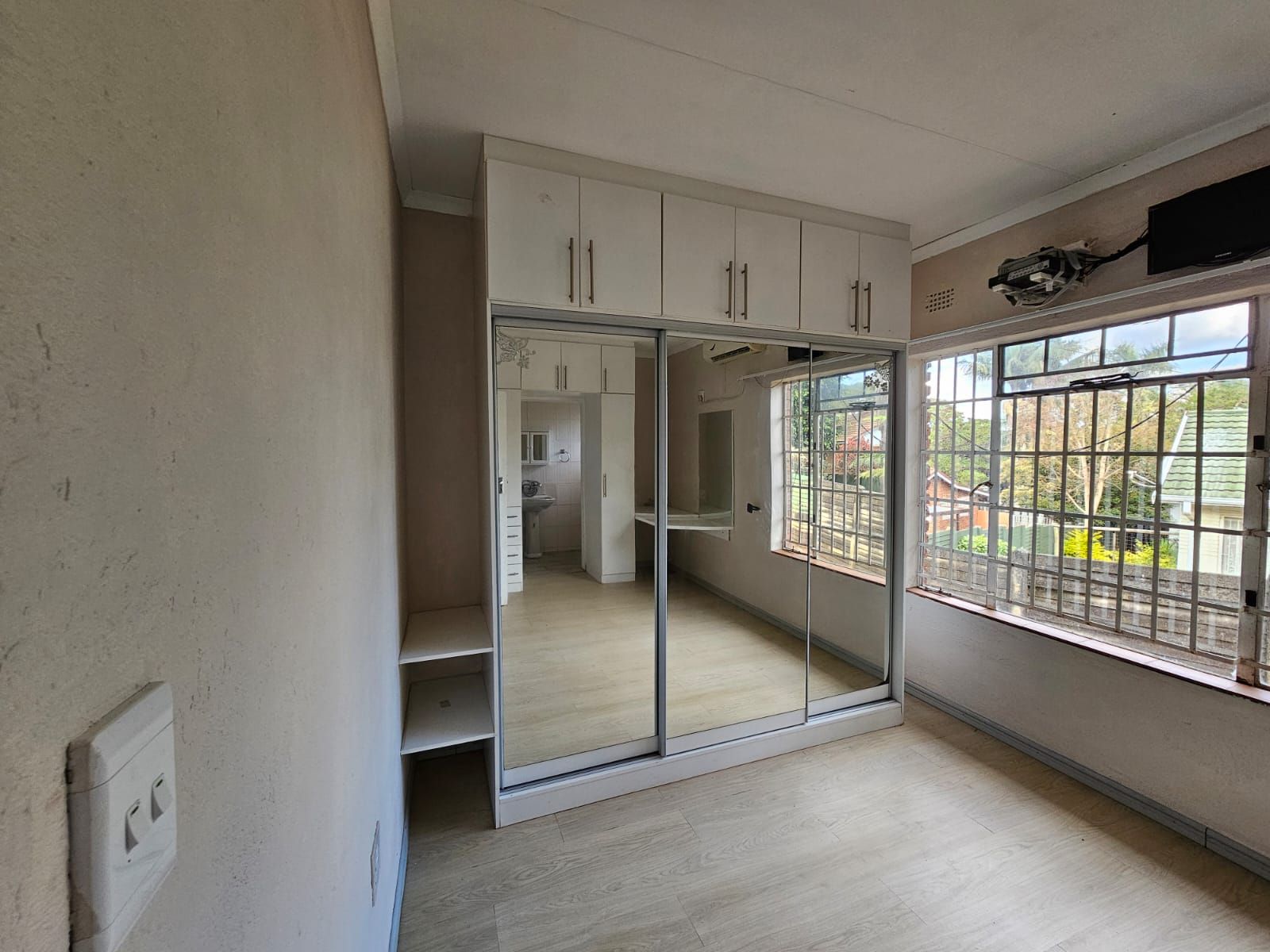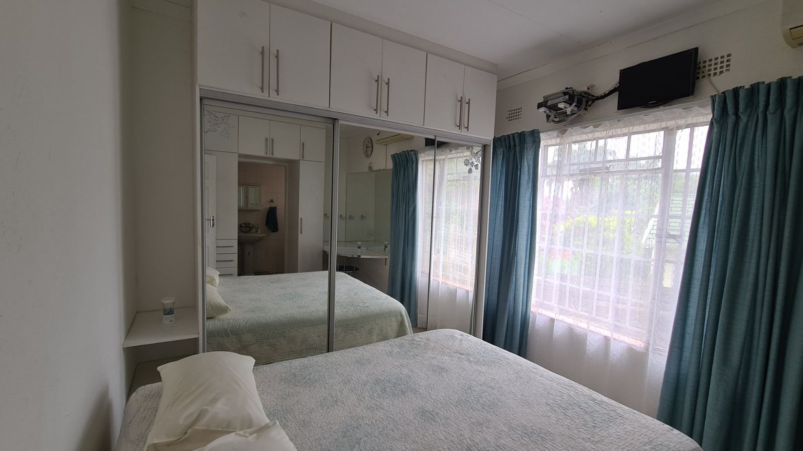 Well sized bedrooms with built-in cupboards and large windows, offering views of the garden.