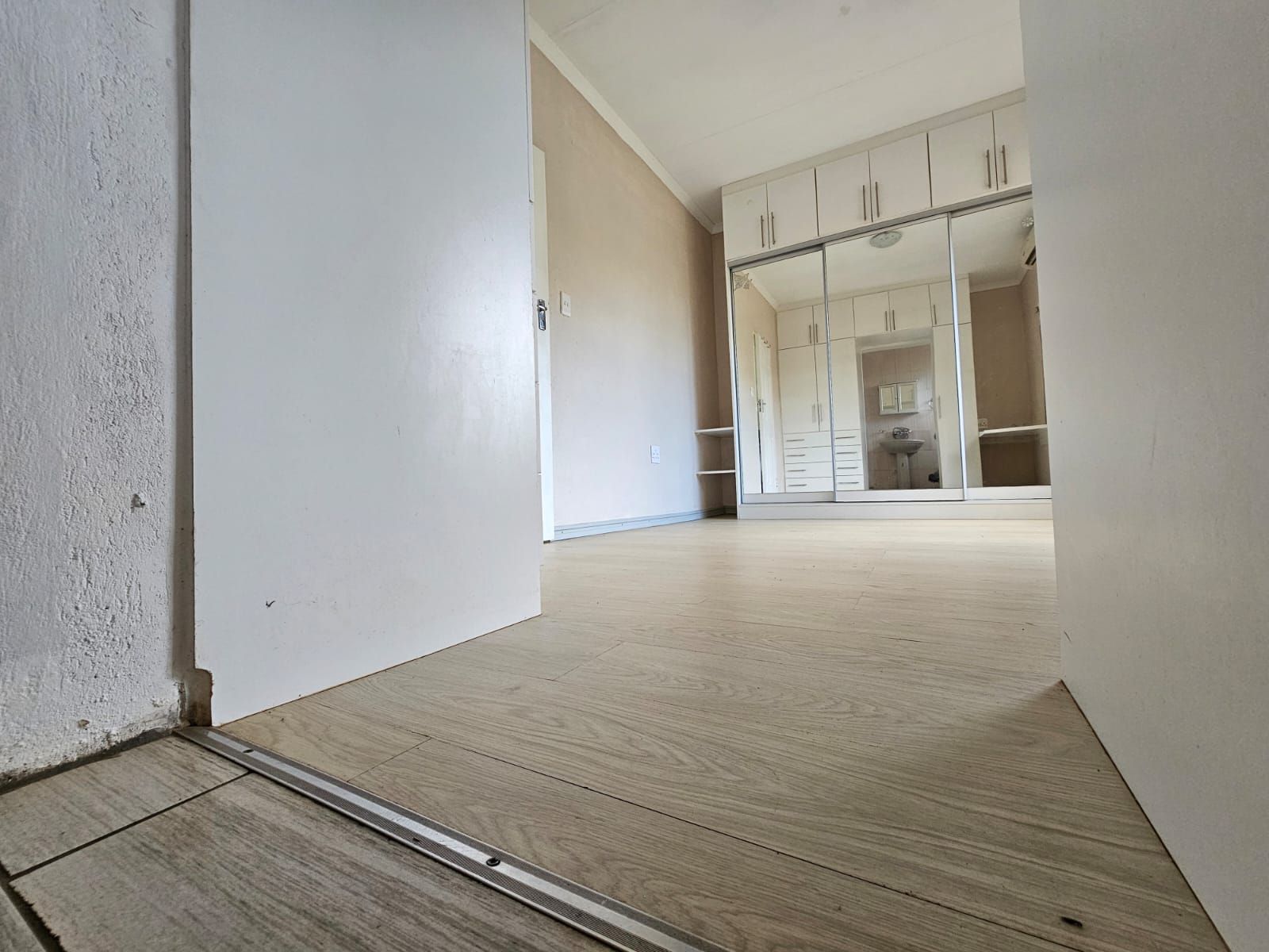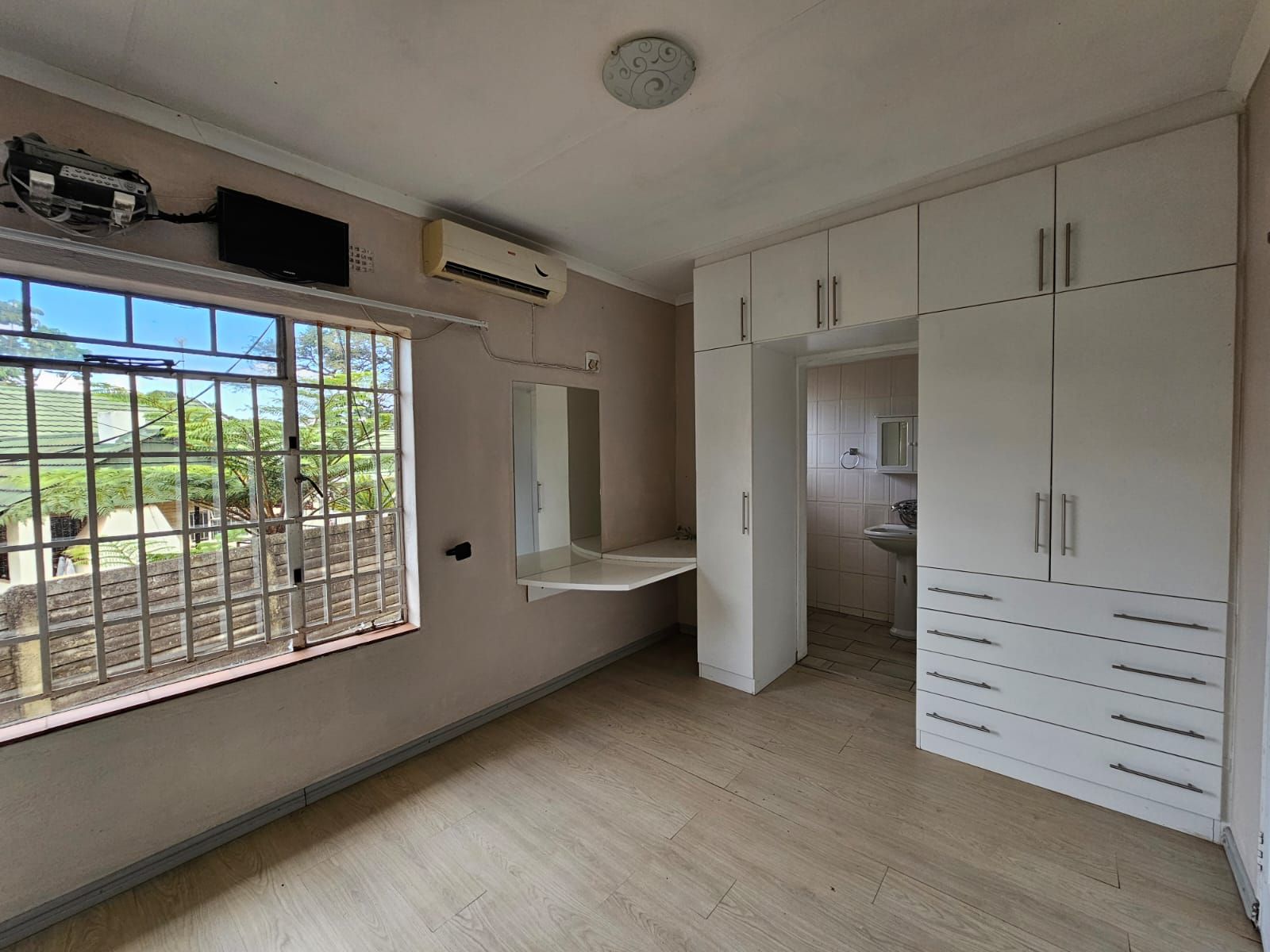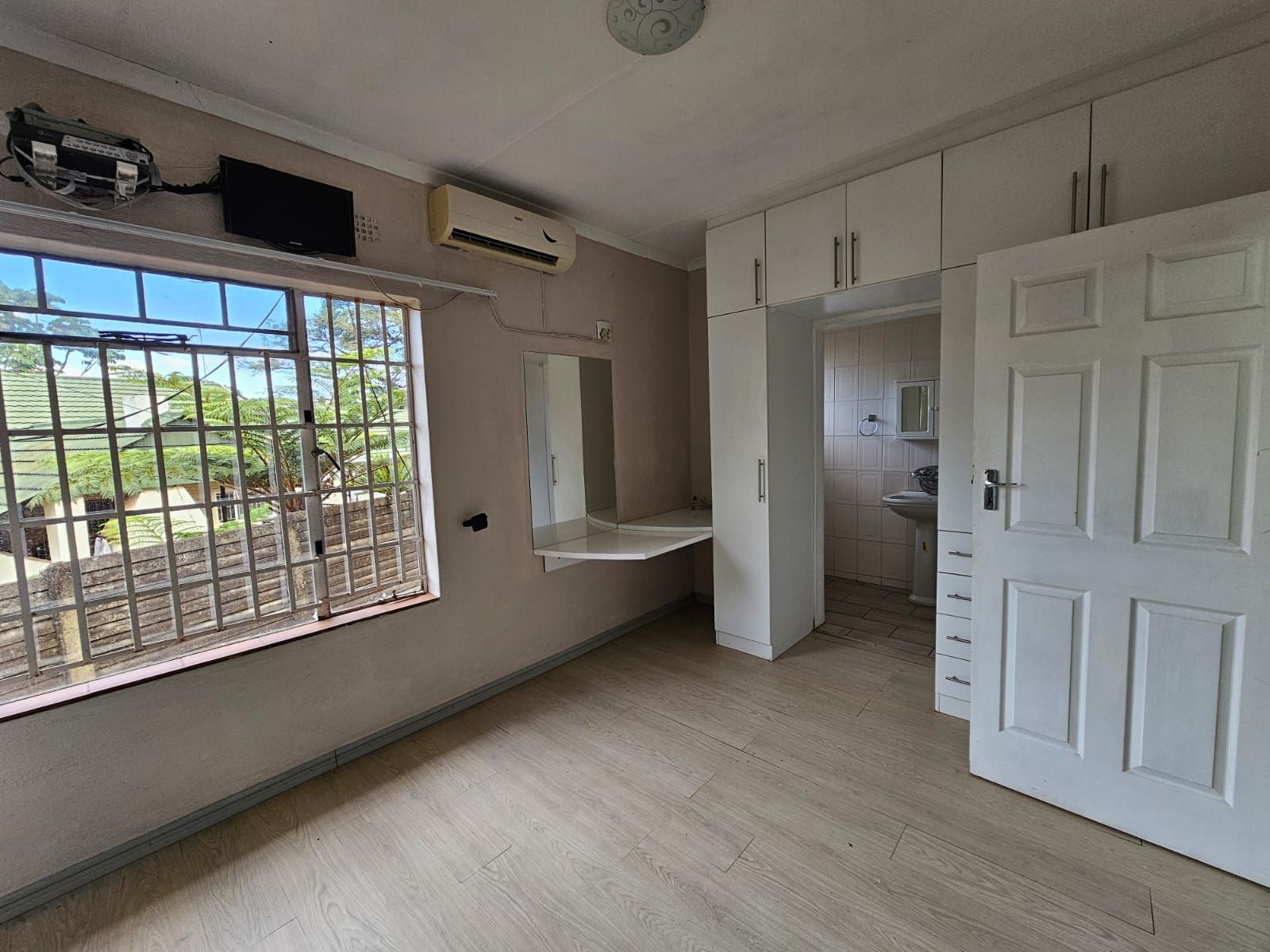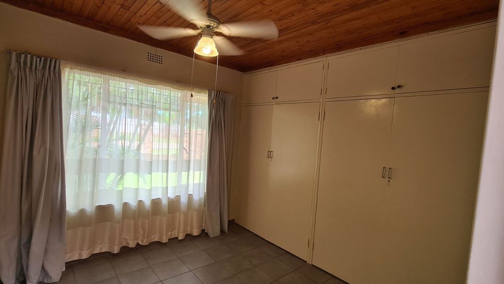 Well sized bedrooms with built-in cupboards and large windows, offering views of the garden.
