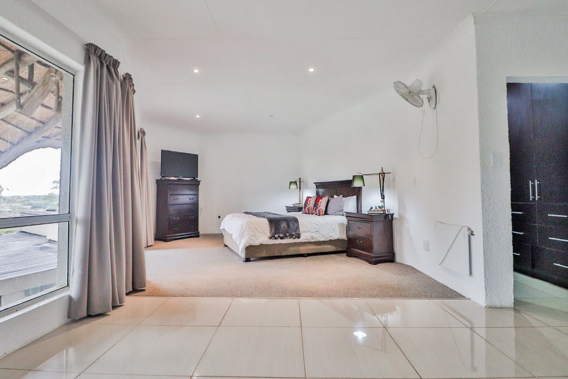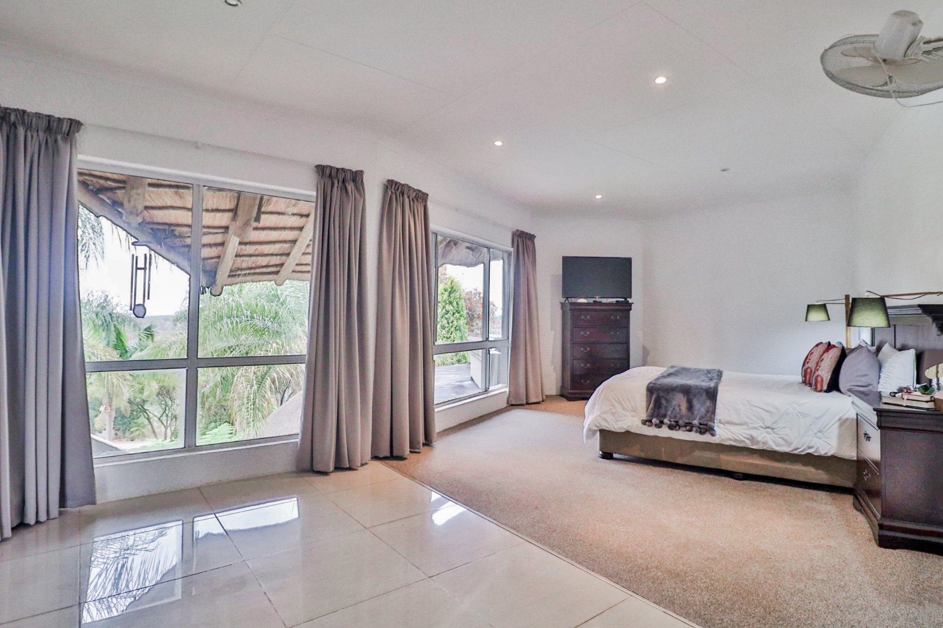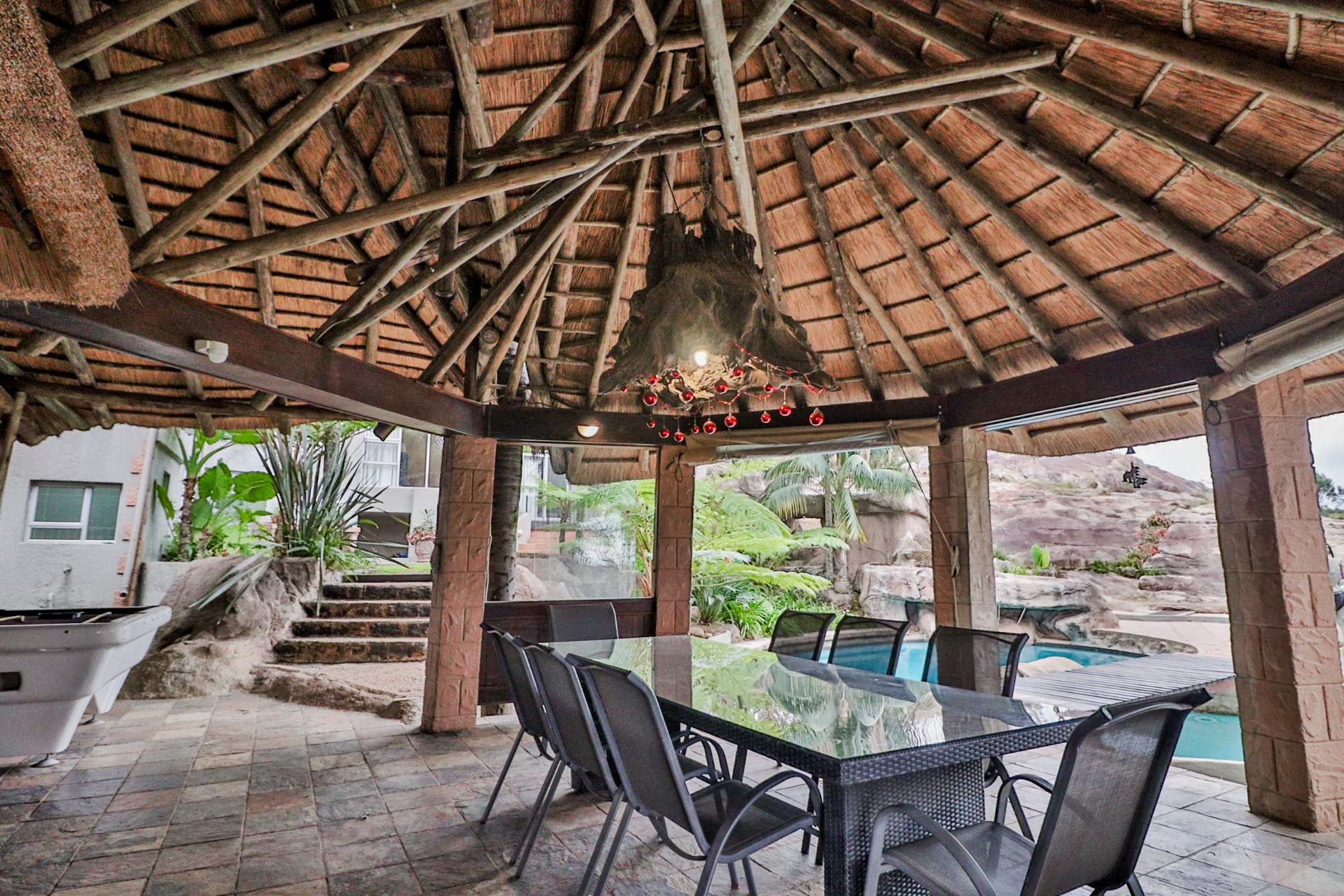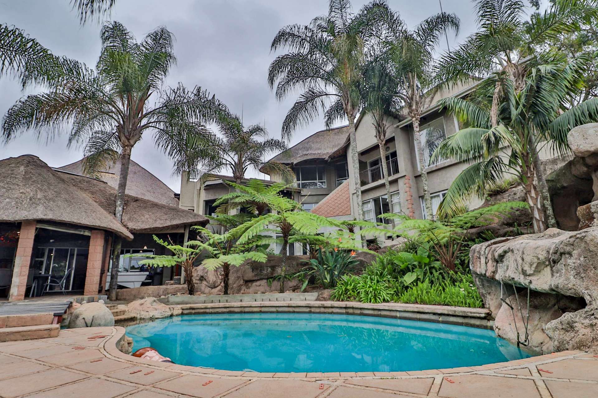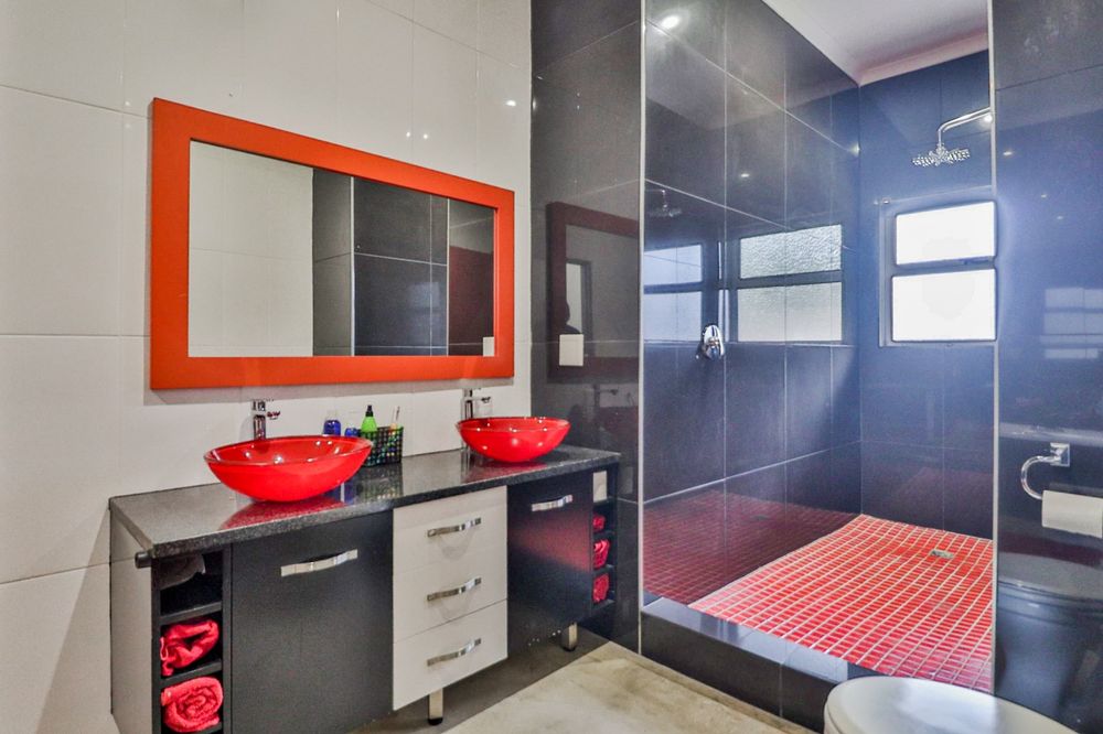 The main house welcomes you with an inviting foyer that leads to different areas. The spacious kitchen includes a lock-up pantry, scullery, breakfast nook, and granite countertops. There is a TV lounge with a gas fireplace, a dining room, and a small entrance hall. Bedroom one is currently being used as a hair salon, with enough space for a lounge area, dressing room, and an en-suite bathroom. Bedroom two includes a dressing room and an en-suite bathroom with a double basin, bath, shower, and toilet. Bedroom three has built-in cupboards and an en-suite bathroom with a toilet, shower, bath, and basin. Bedroom four features built-in cupboards, a patio, lounge area, and an en-suite with a shower, basin, and toilet. Bedroom five has a dressing room and an en-suite bathroom with a double basin, shower, toilet, and bath. This room can serve as a third flat, with its own entrance, kitchenette, guest toilet, dining room, and lounge overlooking the swimming pool.