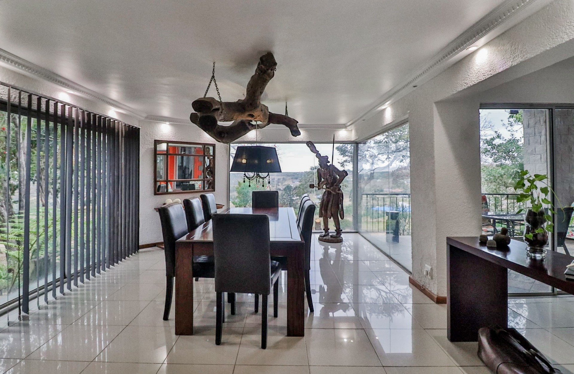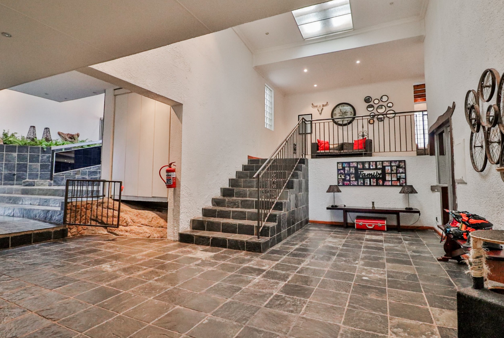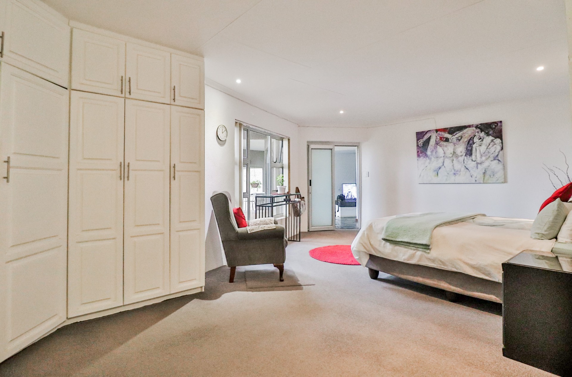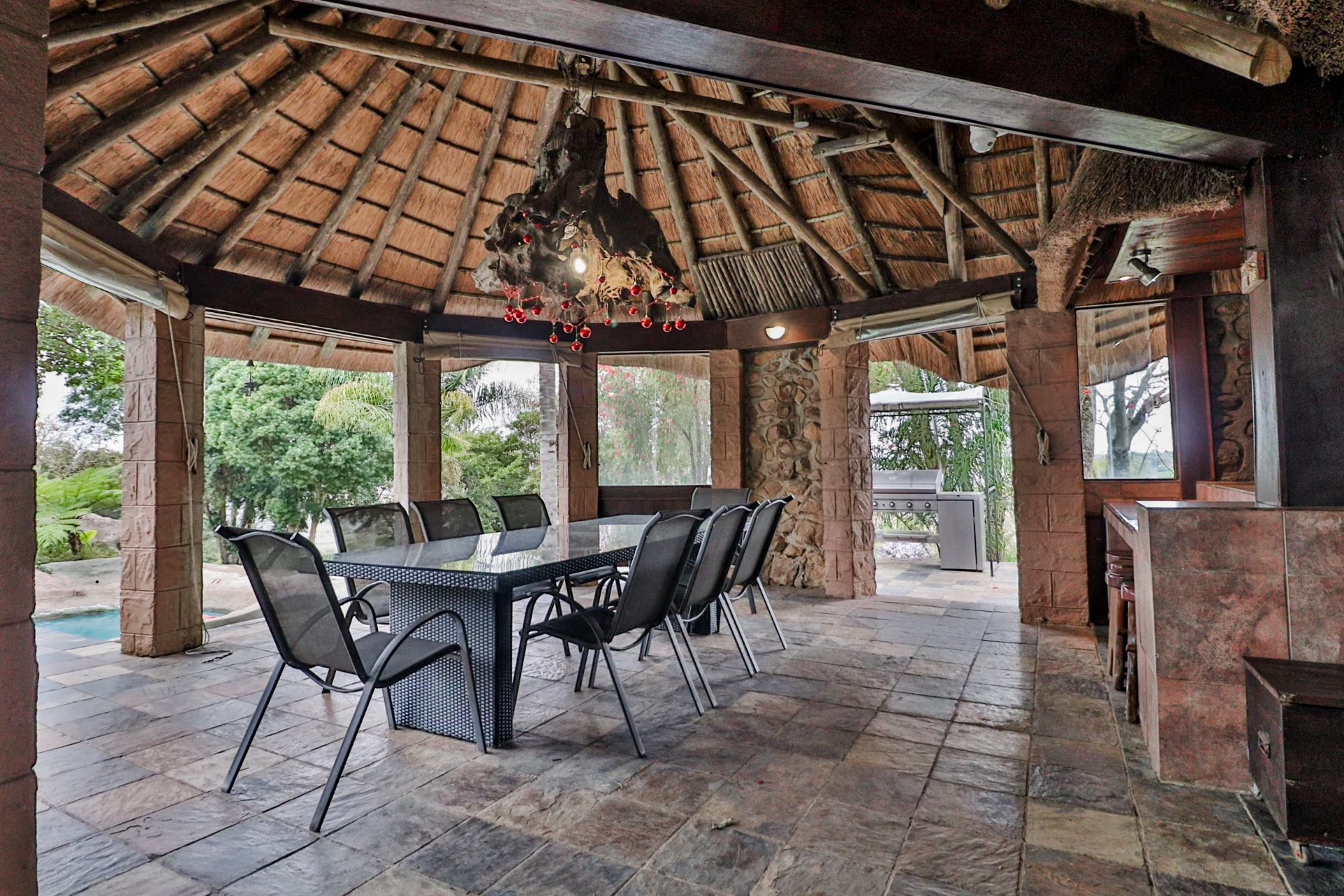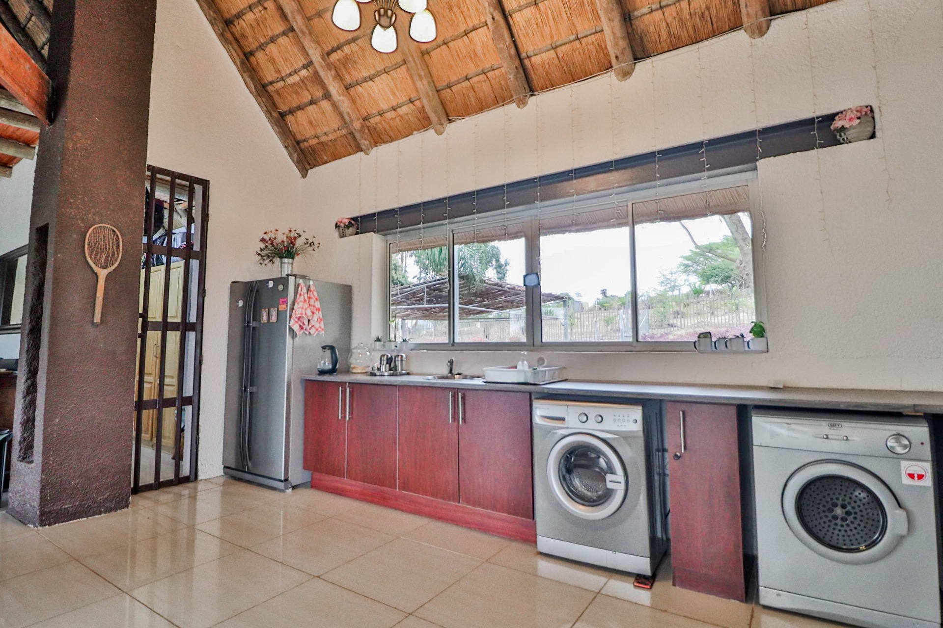 The main house welcomes you with an inviting foyer that leads to different areas. The spacious kitchen includes a lock-up pantry, scullery, breakfast nook, and granite countertops. There is a TV lounge with a gas fireplace, a dining room, and a small entrance hall. Bedroom one is currently being used as a hair salon, with enough space for a lounge area, dressing room, and an en-suite bathroom. Bedroom two includes a dressing room and an en-suite bathroom with a double basin, bath, shower, and toilet. Bedroom three has built-in cupboards and an en-suite bathroom with a toilet, shower, bath, and basin. Bedroom four features built-in cupboards, a patio, lounge area, and an en-suite with a shower, basin, and toilet. Bedroom five has a dressing room and an en-suite bathroom with a double basin, shower, toilet, and bath. This room can serve as a third flat, with its own entrance, kitchenette, guest toilet, dining room, and lounge overlooking the swimming pool.