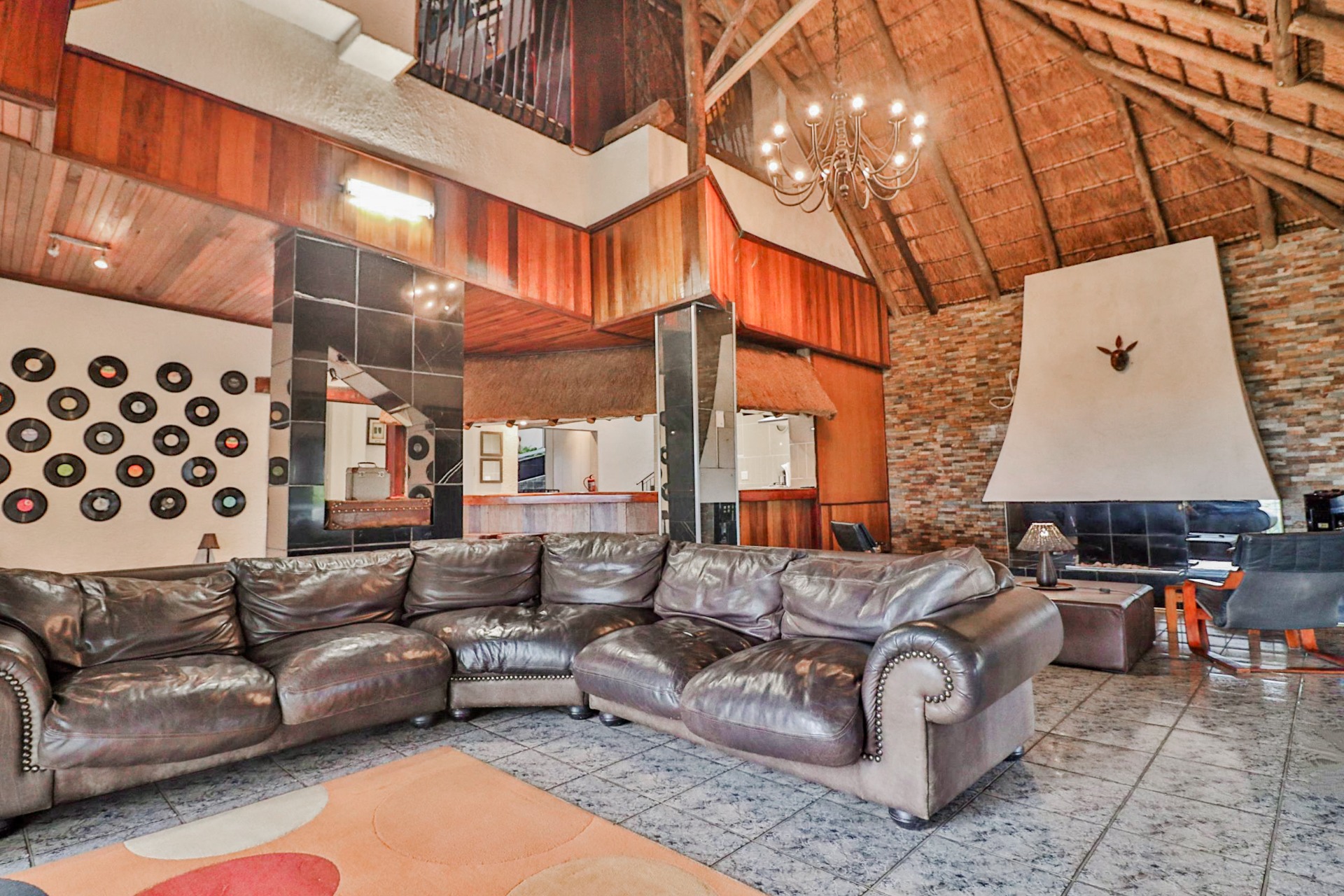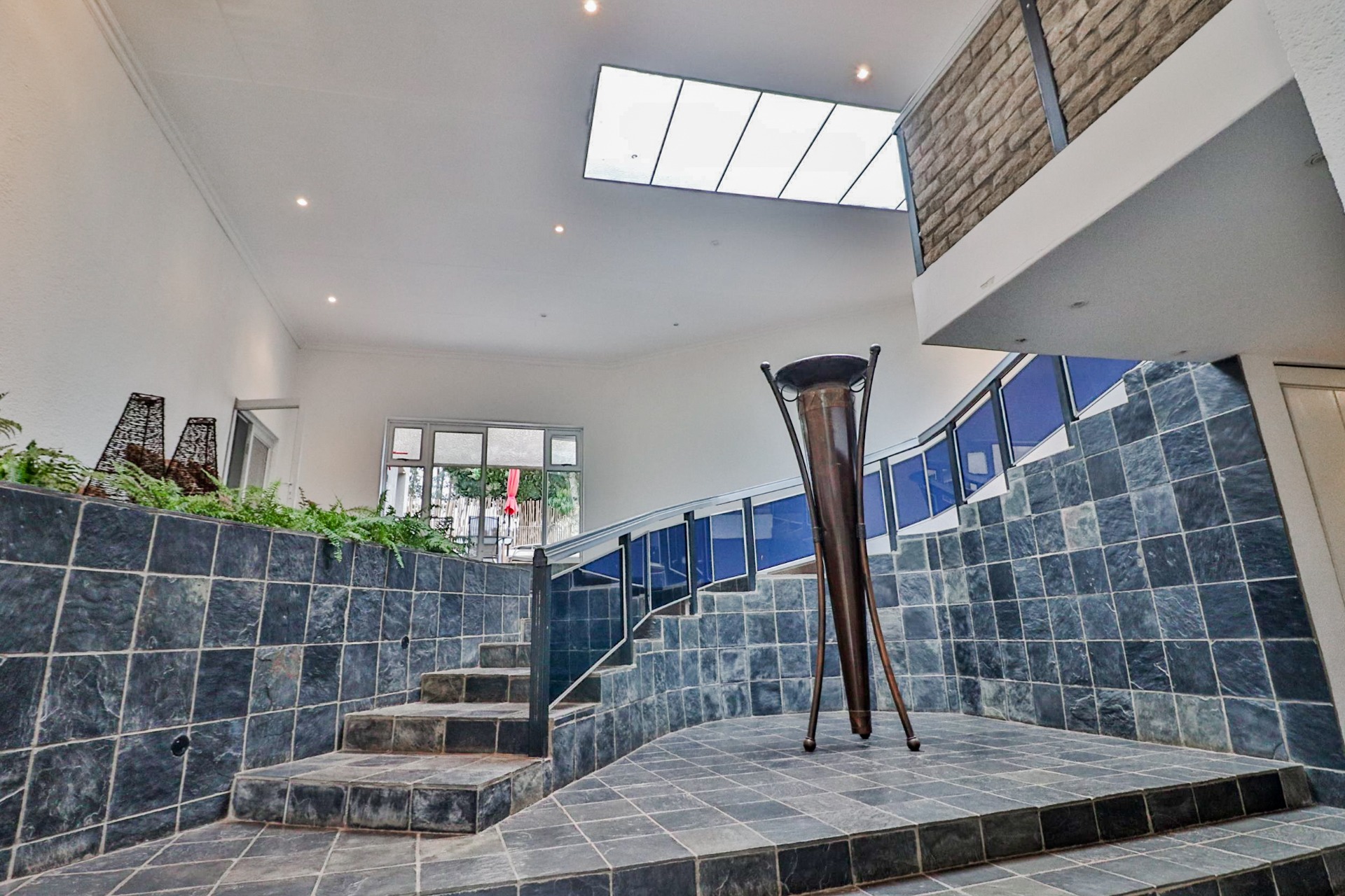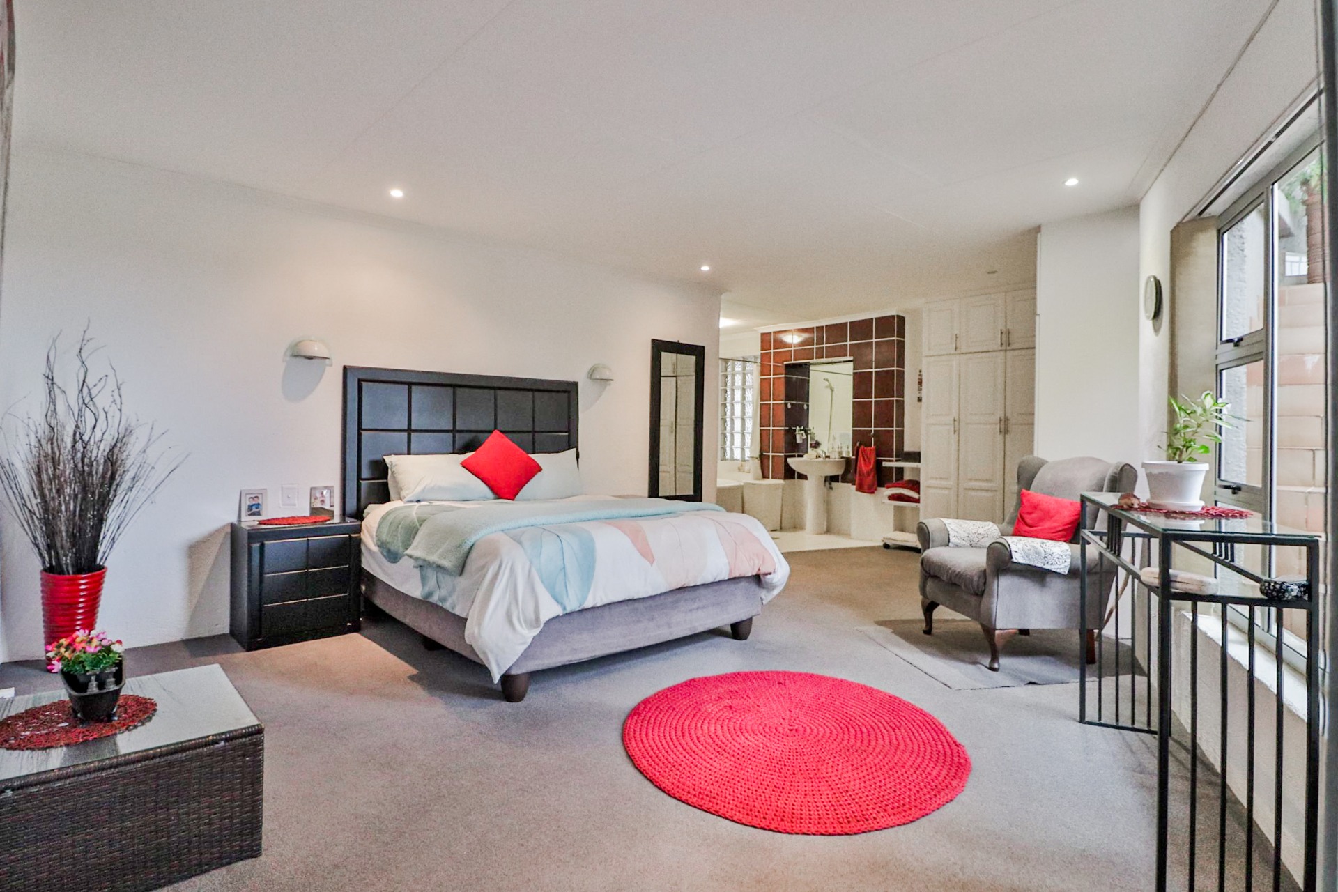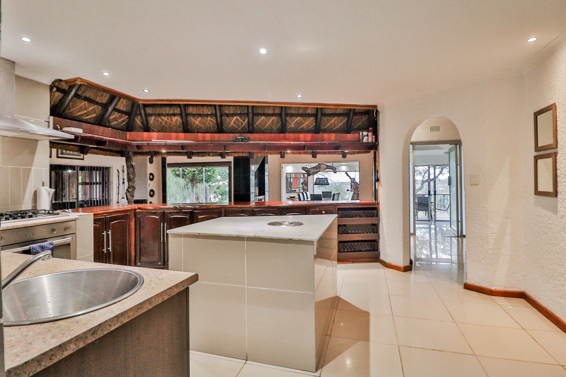 The main house welcomes you with an inviting foyer that leads to different areas. The spacious kitchen includes a lock-up pantry, scullery, breakfast nook, and granite countertops. There is a TV lounge with a gas fireplace, a dining room, and a small entrance hall. Bedroom one is currently being used as a hair salon, with enough space for a lounge area, dressing room, and an en-suite bathroom. Bedroom two includes a dressing room and an en-suite bathroom with a double basin, bath, shower, and toilet. Bedroom three has built-in cupboards and an en-suite bathroom with a toilet, shower, bath, and basin. Bedroom four features built-in cupboards, a patio, lounge area, and an en-suite with a shower, basin, and toilet. Bedroom five has a dressing room and an en-suite bathroom with a double basin, shower, toilet, and bath. This room can serve as a third flat, with its own entrance, kitchenette, guest toilet, dining room, and lounge overlooking the swimming pool.