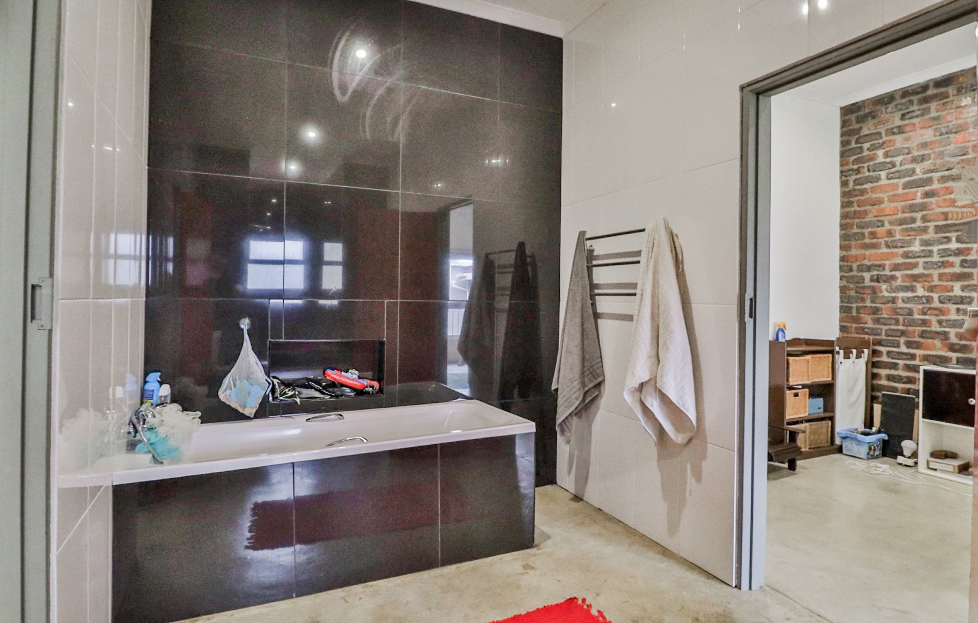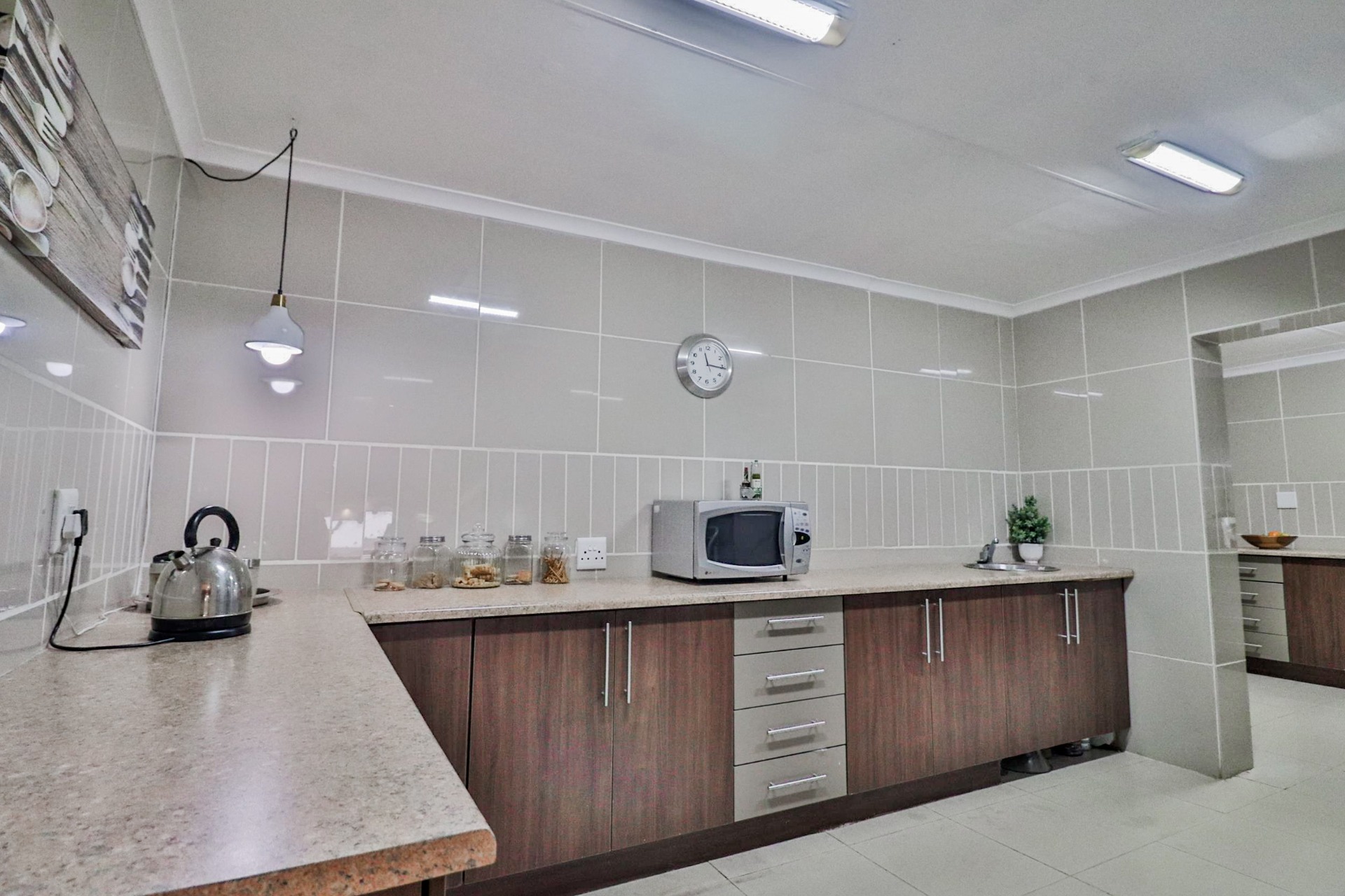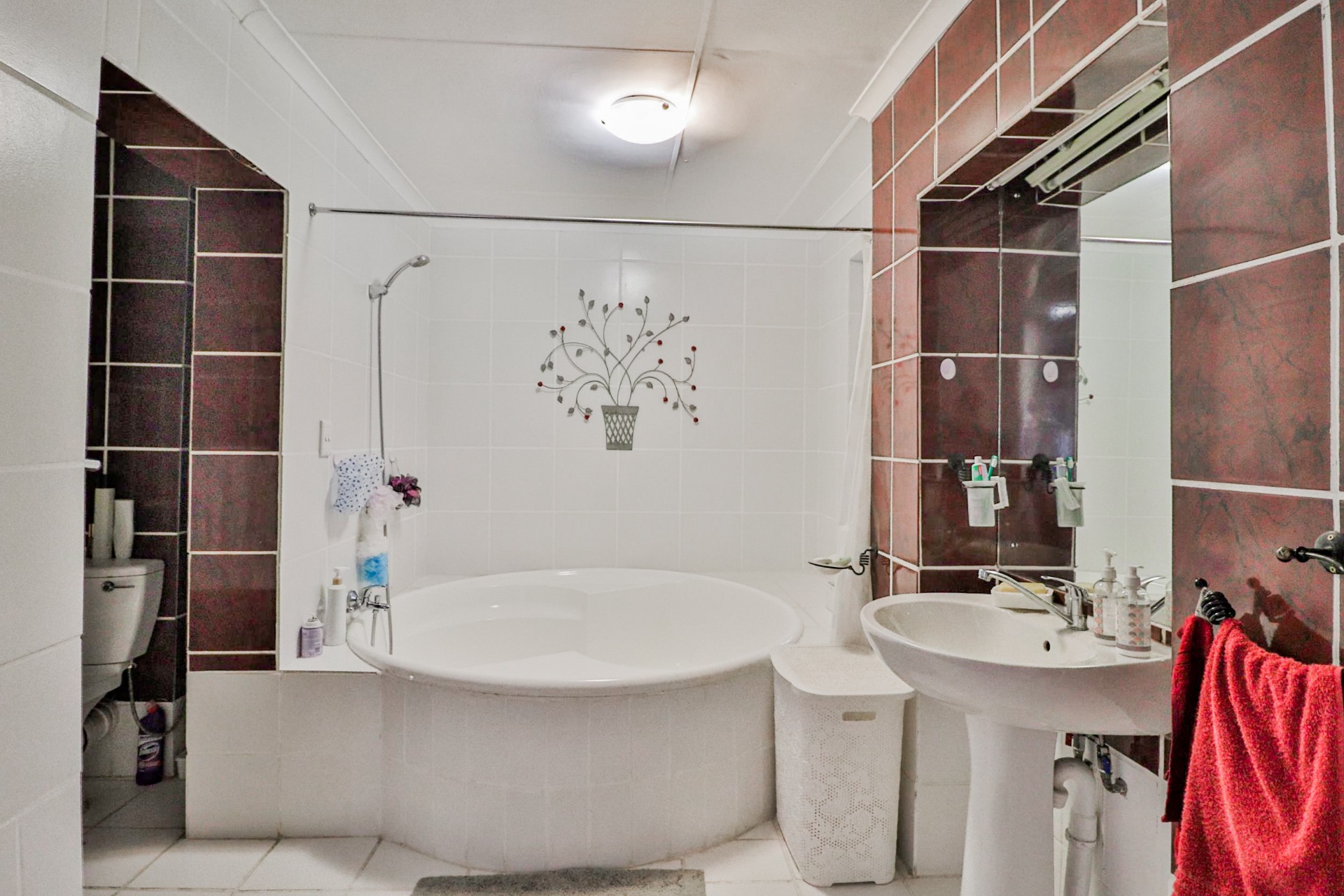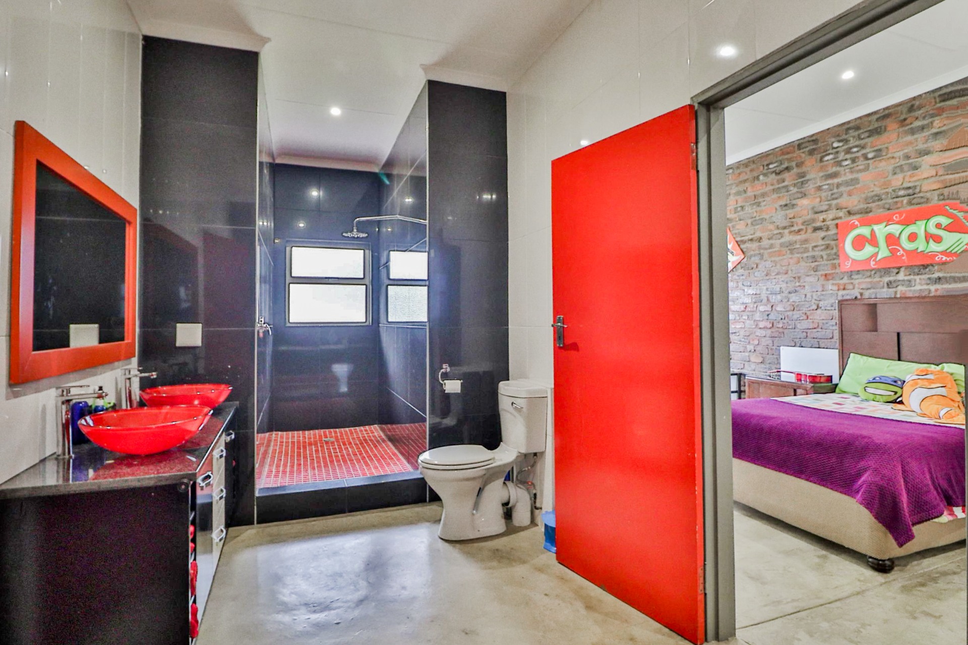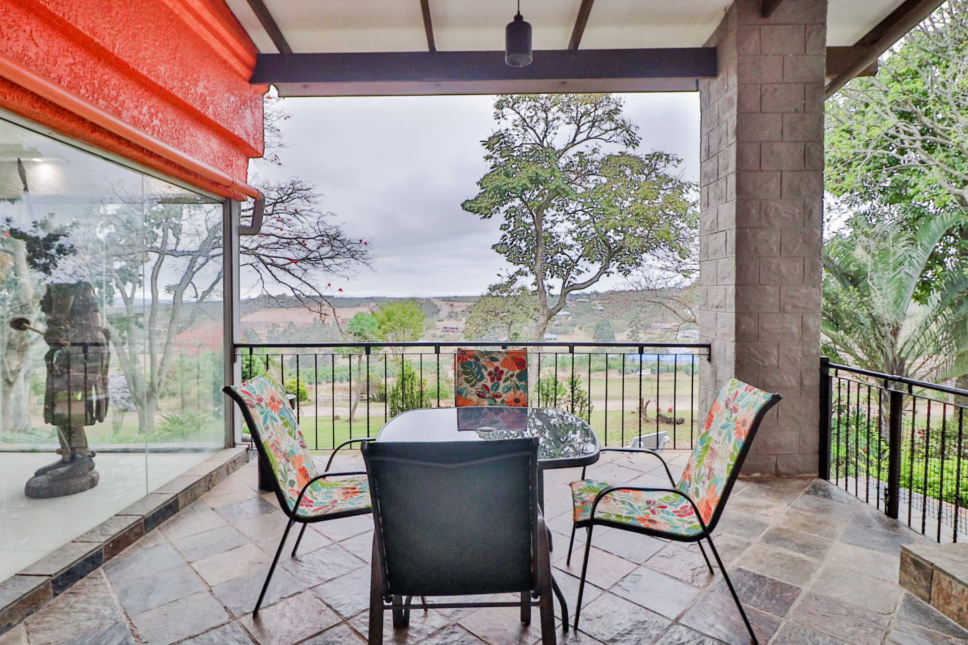 The main house welcomes you with an inviting foyer that leads to different areas. The spacious kitchen includes a lock-up pantry, scullery, breakfast nook, and granite countertops. There is a TV lounge with a gas fireplace, a dining room, and a small entrance hall. Bedroom one is currently being used as a hair salon, with enough space for a lounge area, dressing room, and an en-suite bathroom. Bedroom two includes a dressing room and an en-suite bathroom with a double basin, bath, shower, and toilet. Bedroom three has built-in cupboards and an en-suite bathroom with a toilet, shower, bath, and basin. Bedroom four features built-in cupboards, a patio, lounge area, and an en-suite with a shower, basin, and toilet. Bedroom five has a dressing room and an en-suite bathroom with a double basin, shower, toilet, and bath. This room can serve as a third flat, with its own entrance, kitchenette, guest toilet, dining room, and lounge overlooking the swimming pool.