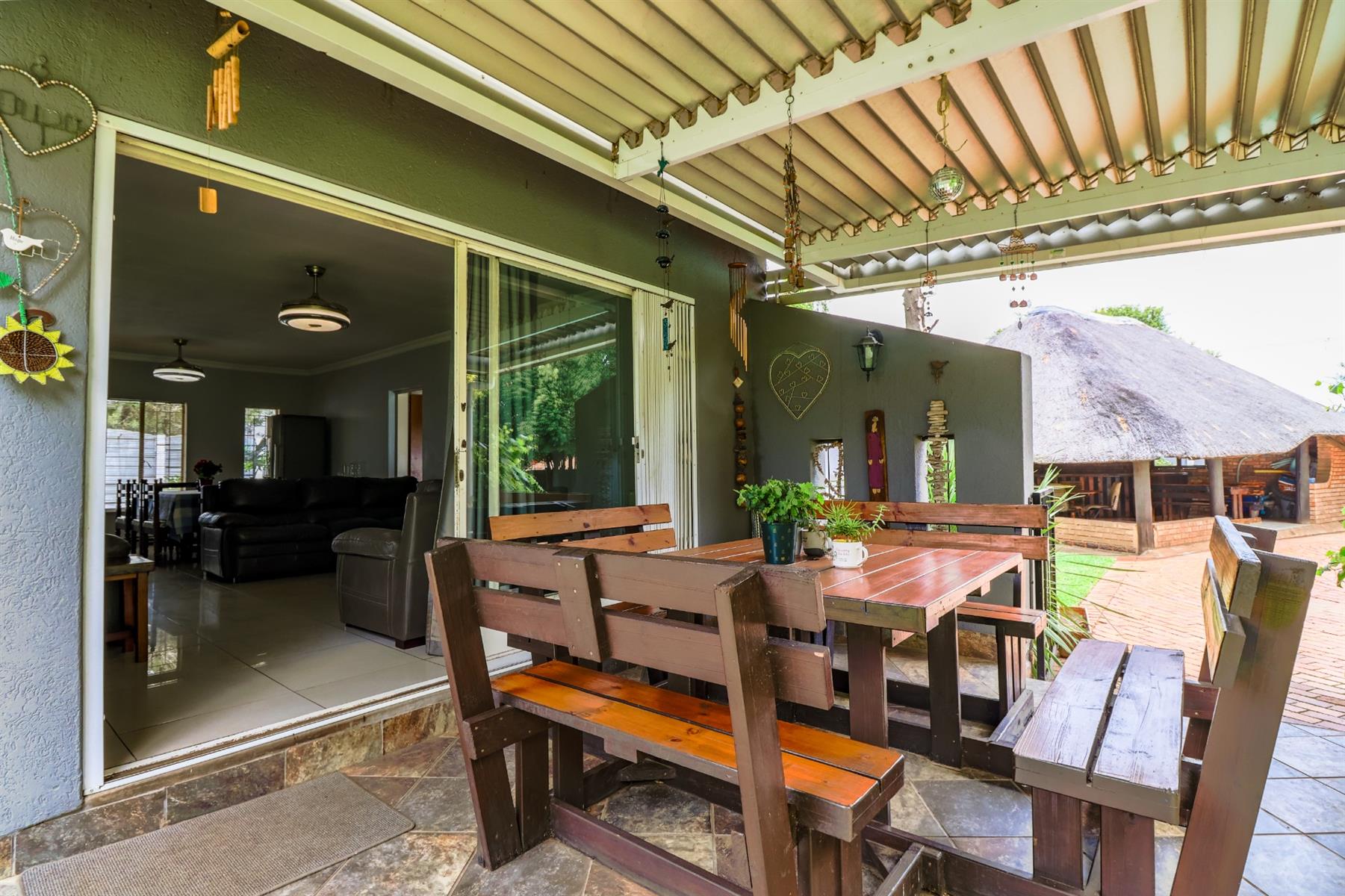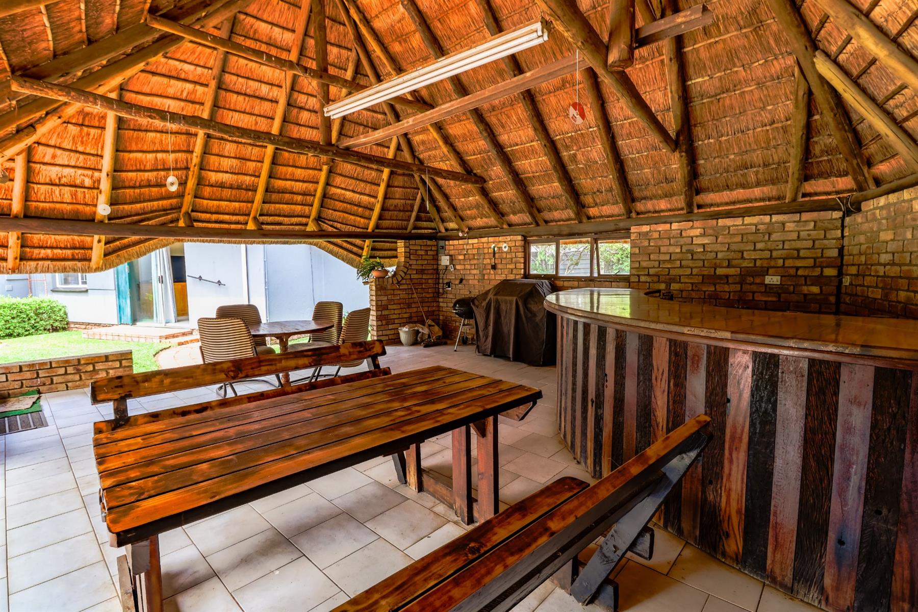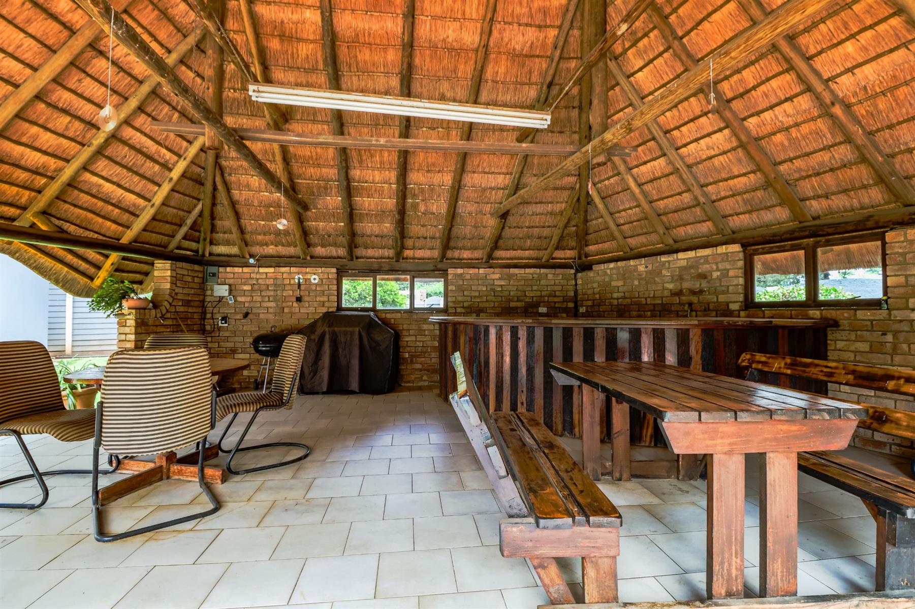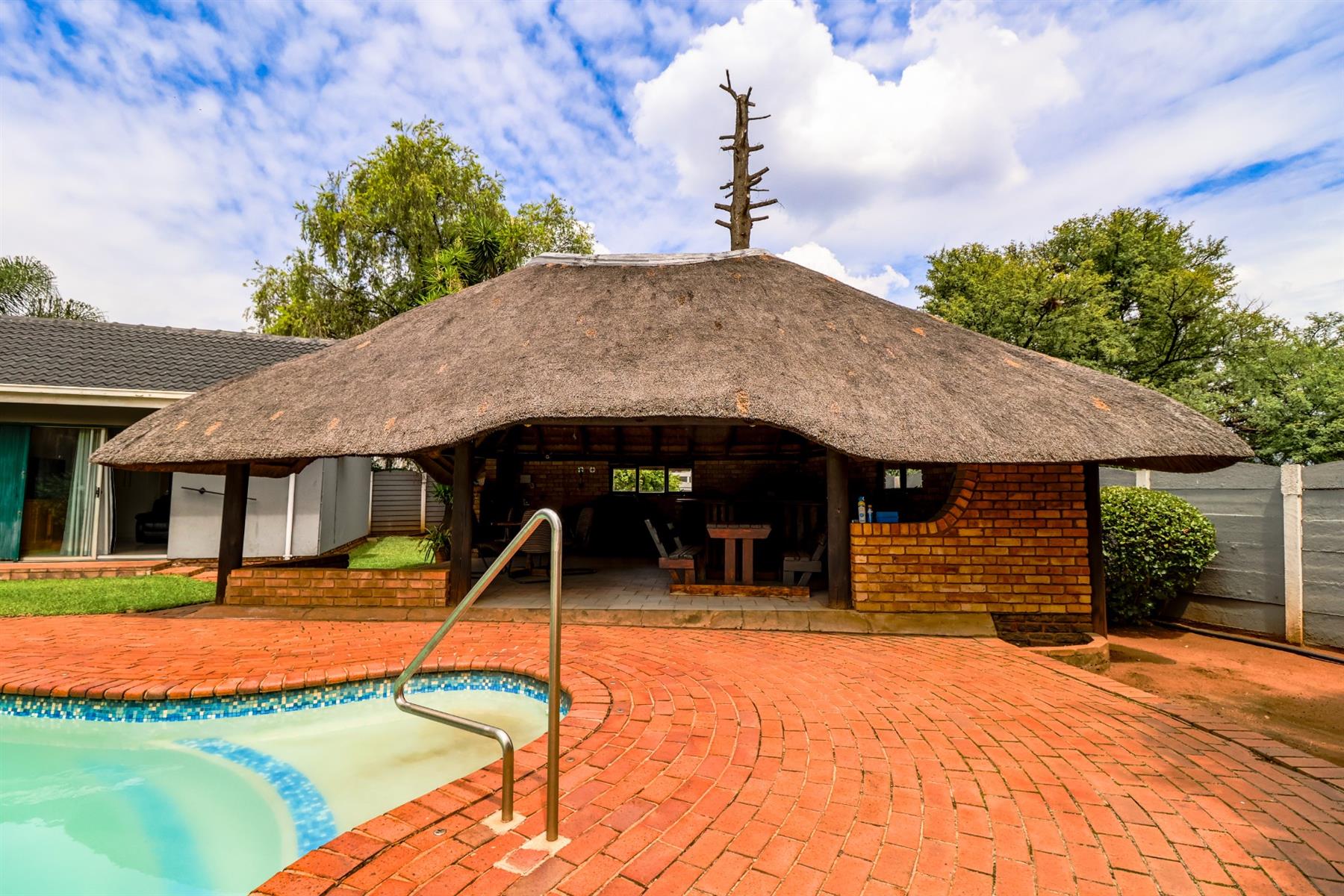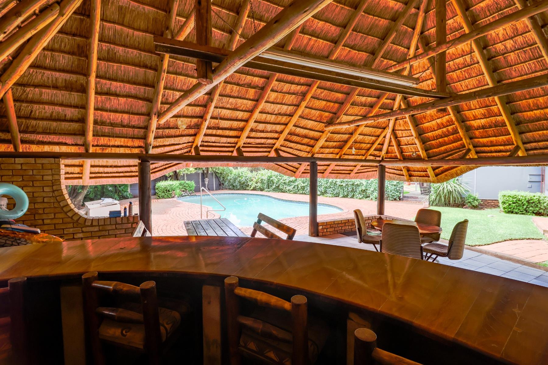 The covered lapa, complete with a built-in bar, overlooks the pool — creating the perfect space for hosting family and friends.