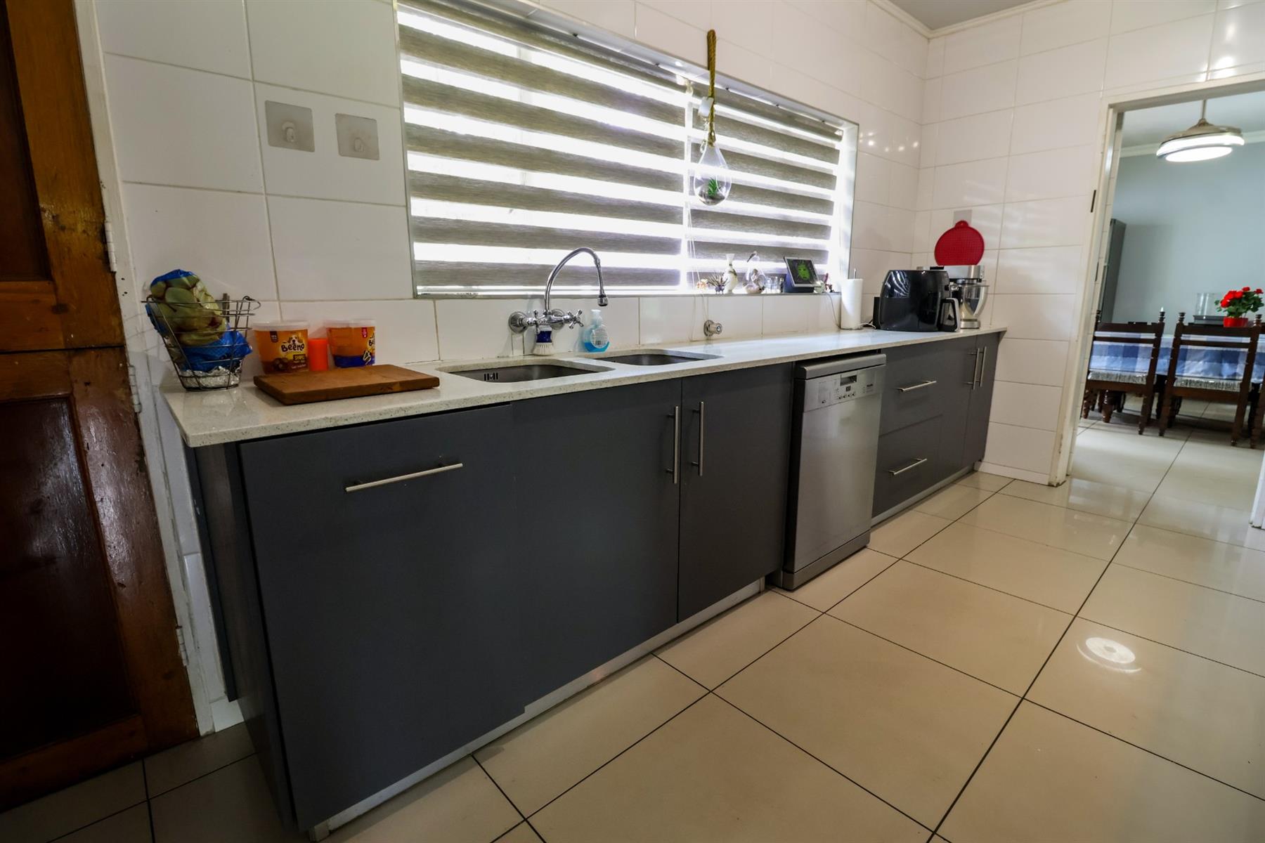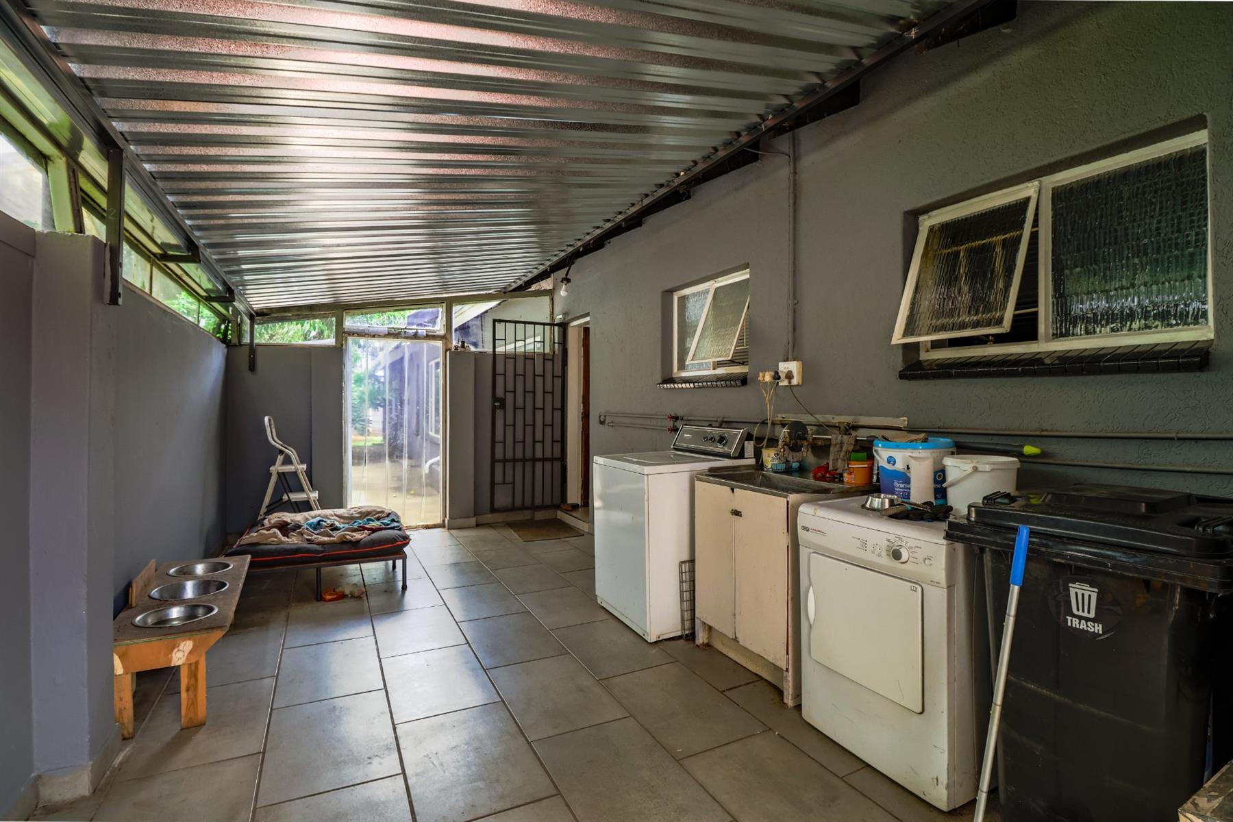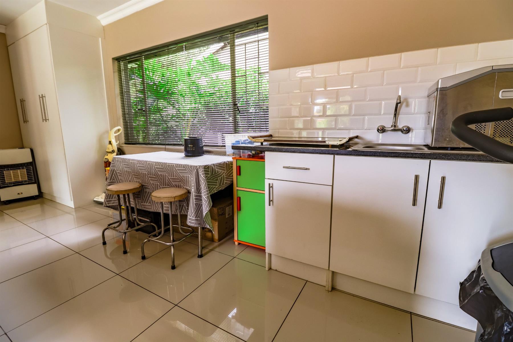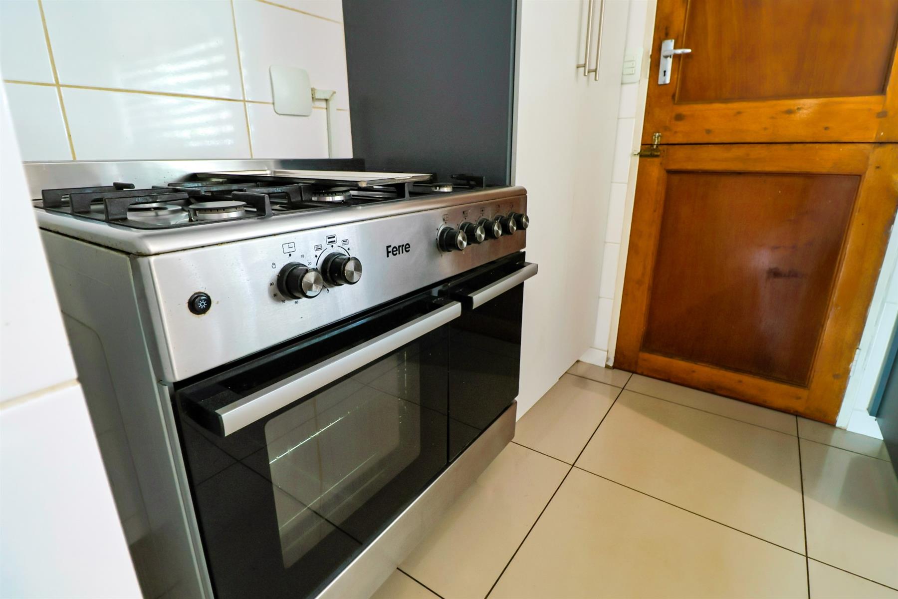The kitchen is well-equipped with granite countertops, both electric and gas hobs, ample cupboard space, and room for all your appliances. It opens onto a private enclosed courtyard for added convenience.