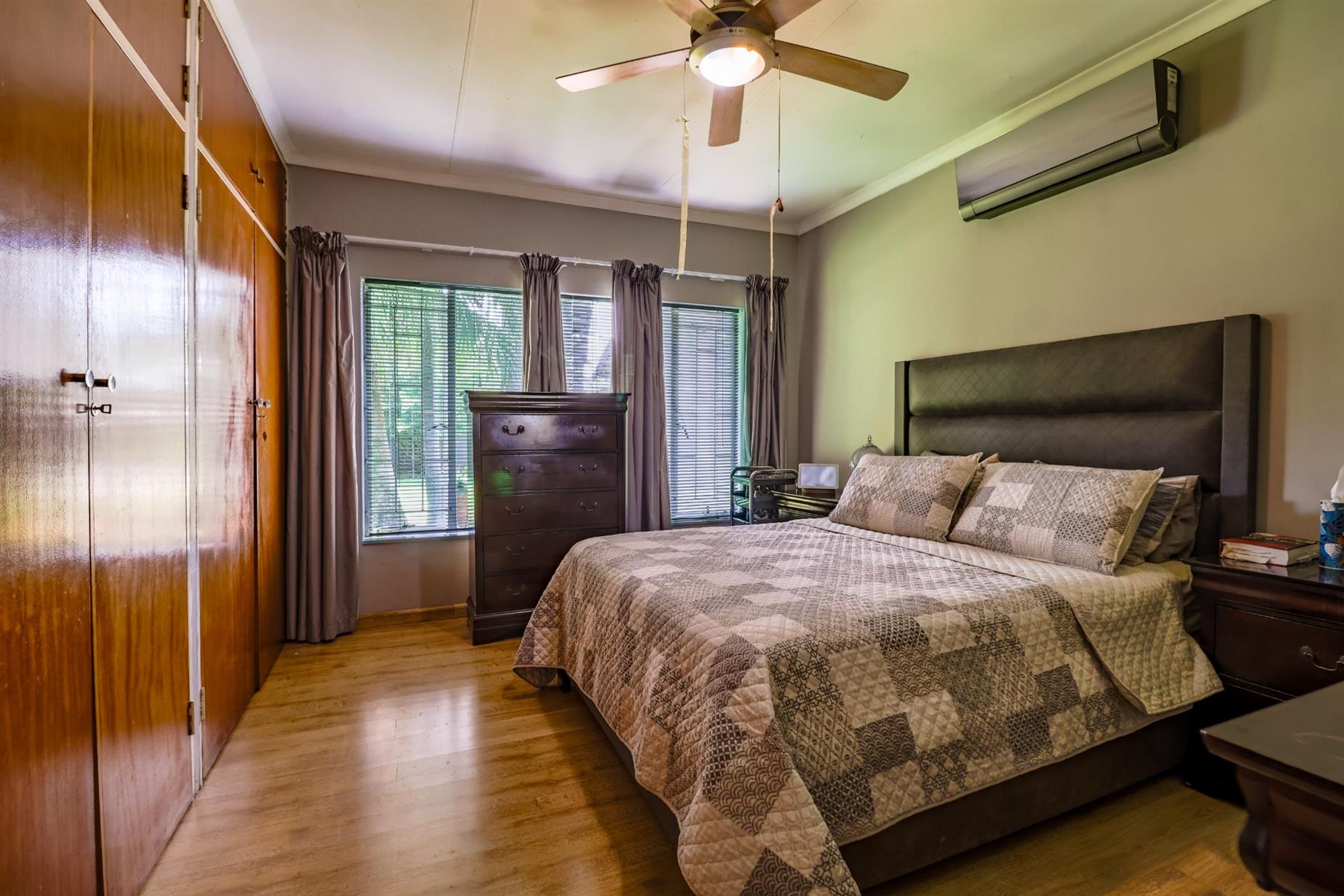 On one wing of the home, you’ll find four spacious bedrooms and two bathrooms. The main bedroom features its own en-suite bathroom, while the remaining three bedrooms share a second full bathroom.