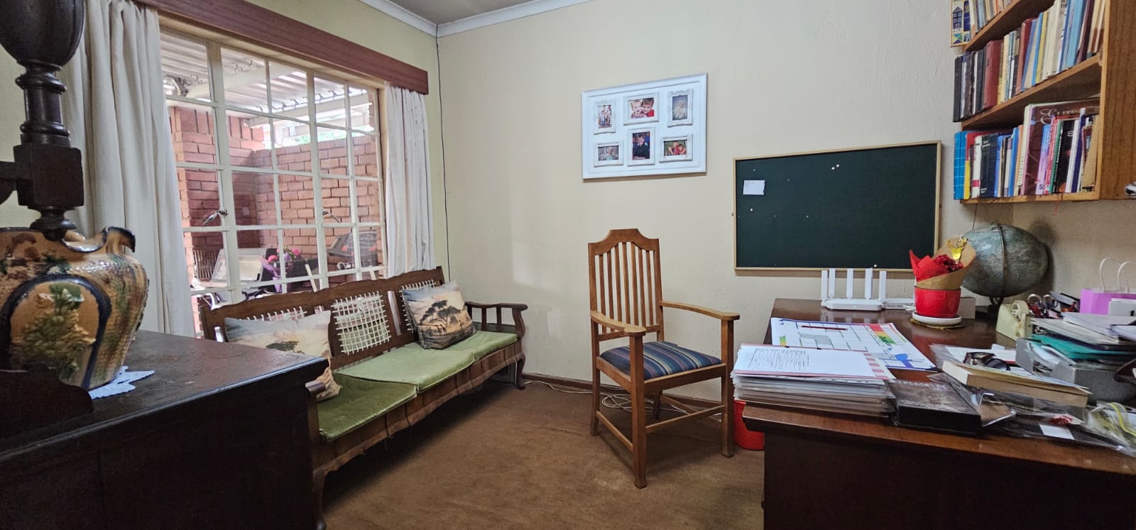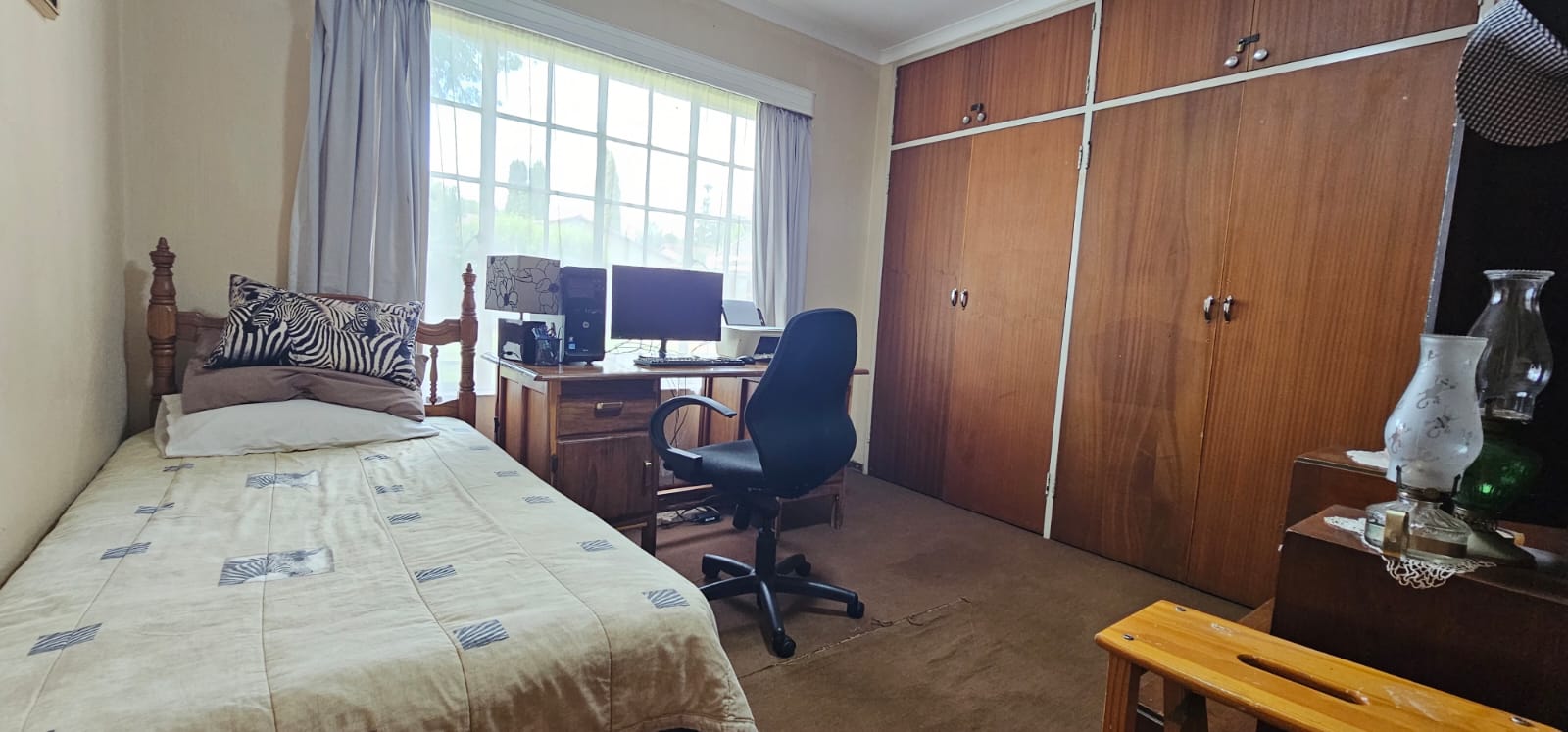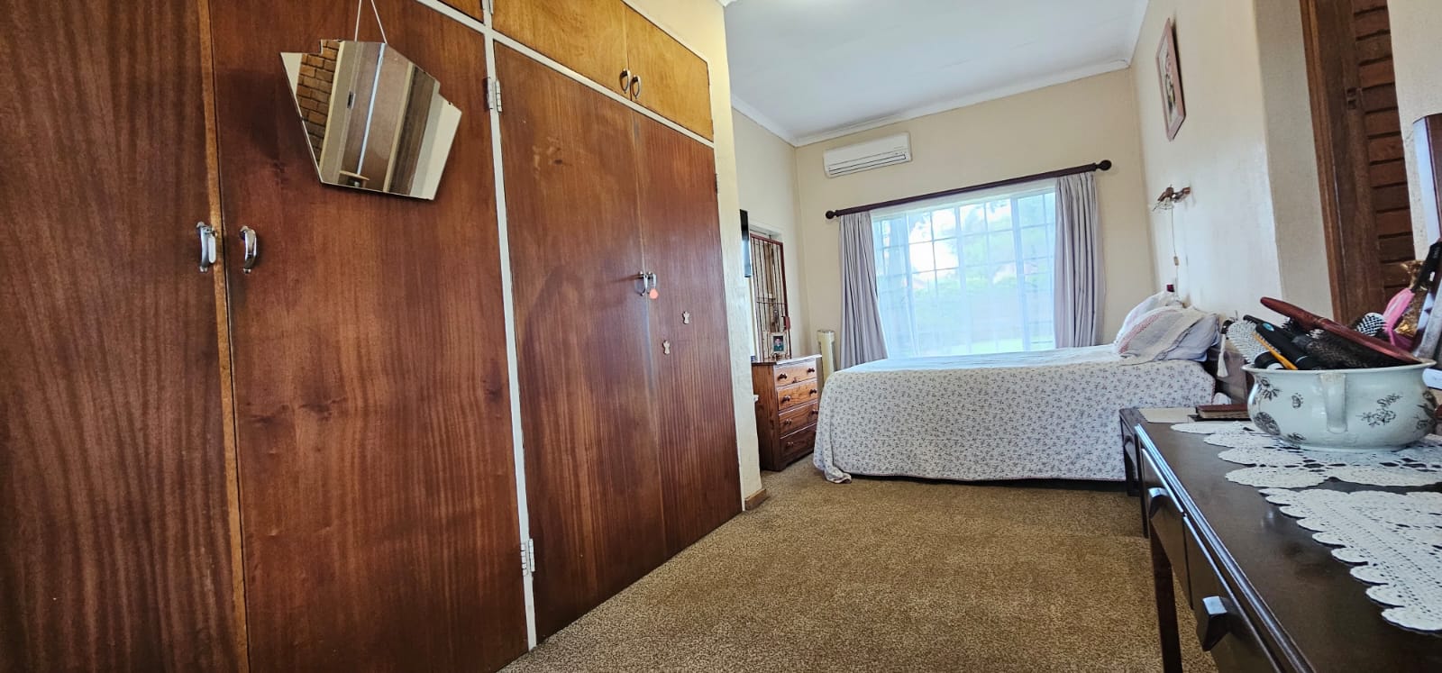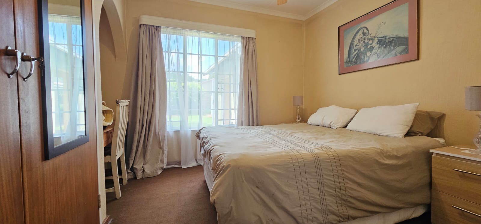 The open-plan living and dining area is bright and welcoming, equipped with an air conditioner for year-round comfort. From here a door door lead to the covered patio with a built-in braai — a fantastic space for entertaining family and friends.