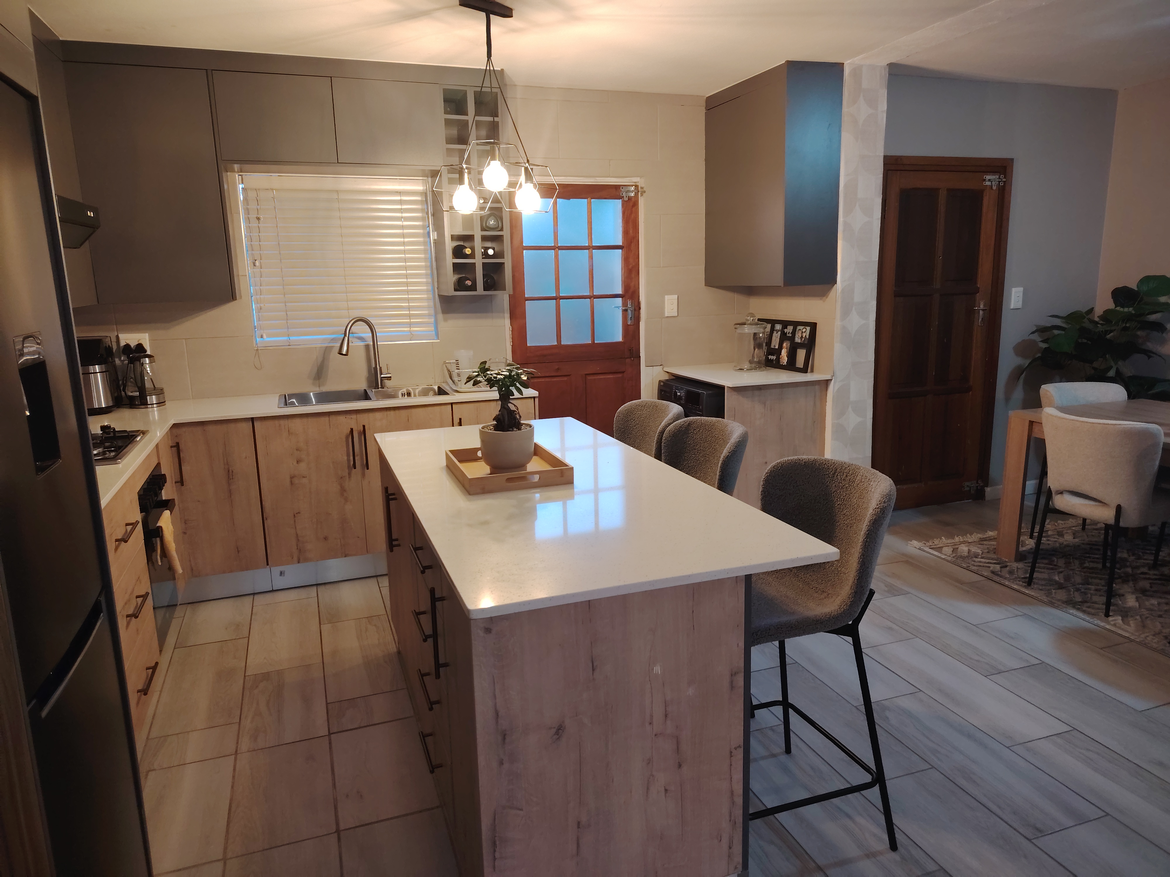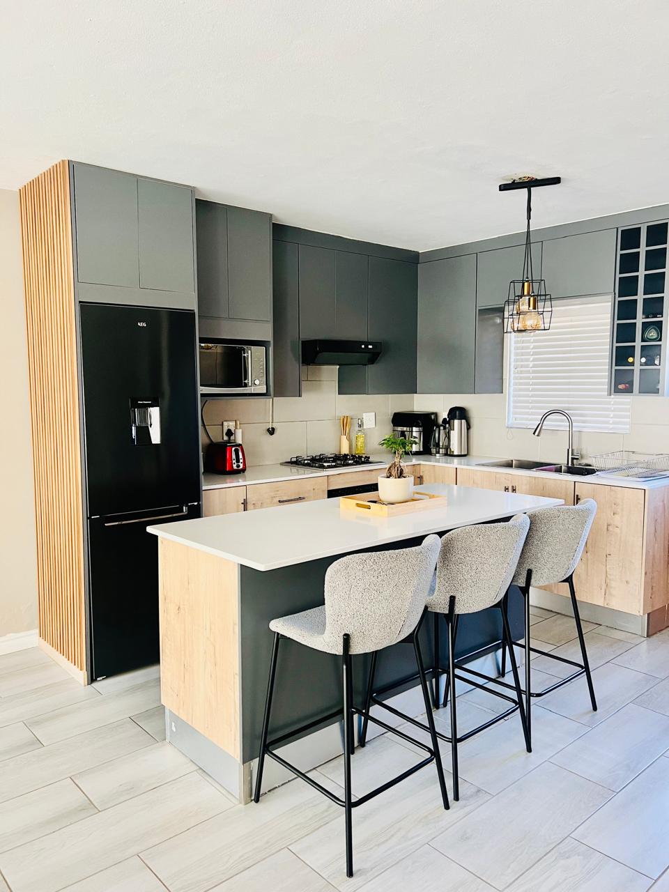 - A modern open-plan kitchen with quartz countertops and ample cabinetry, seamlessly connecting to a lovely back patio.