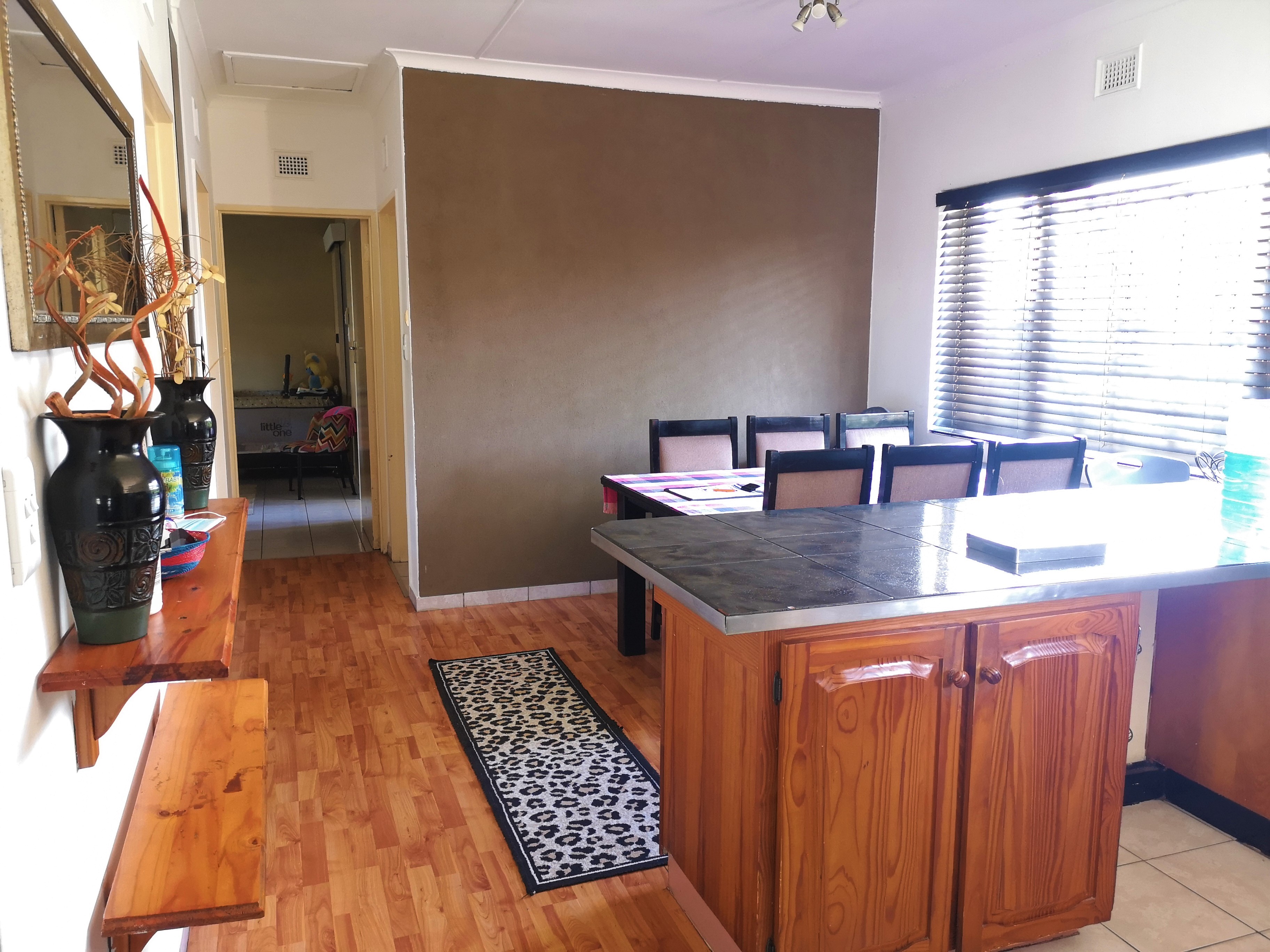 This property has a spacious yard and a well maintained garden with a splash pool and is situated in a neat, tranquil street close to schools. The open carport can accommodate four vehicles and has a storage room, with air-conditioning and is used for laundry. This property is equipped with electric fencing, Security system and two automated gates and is pet friendly.