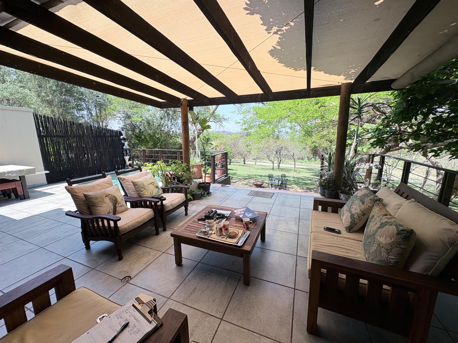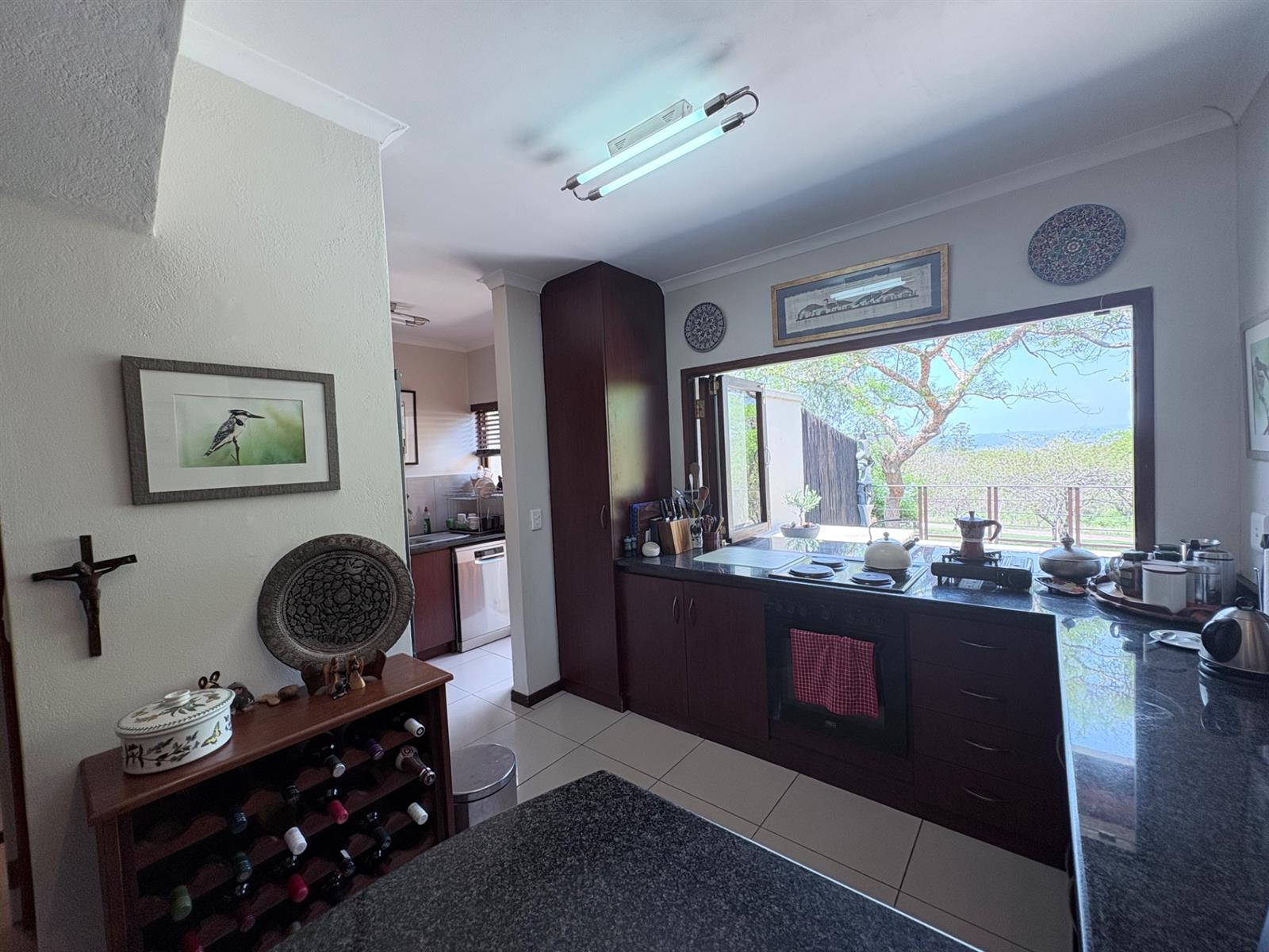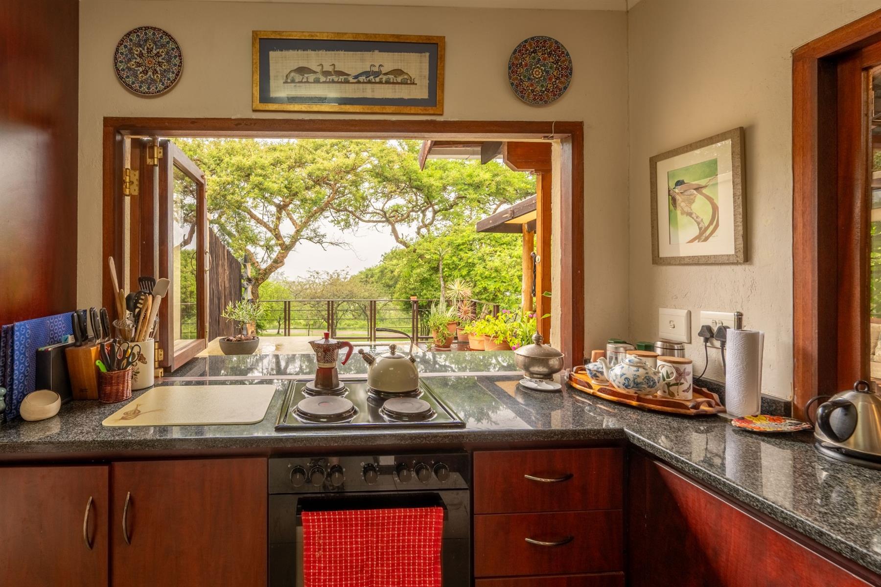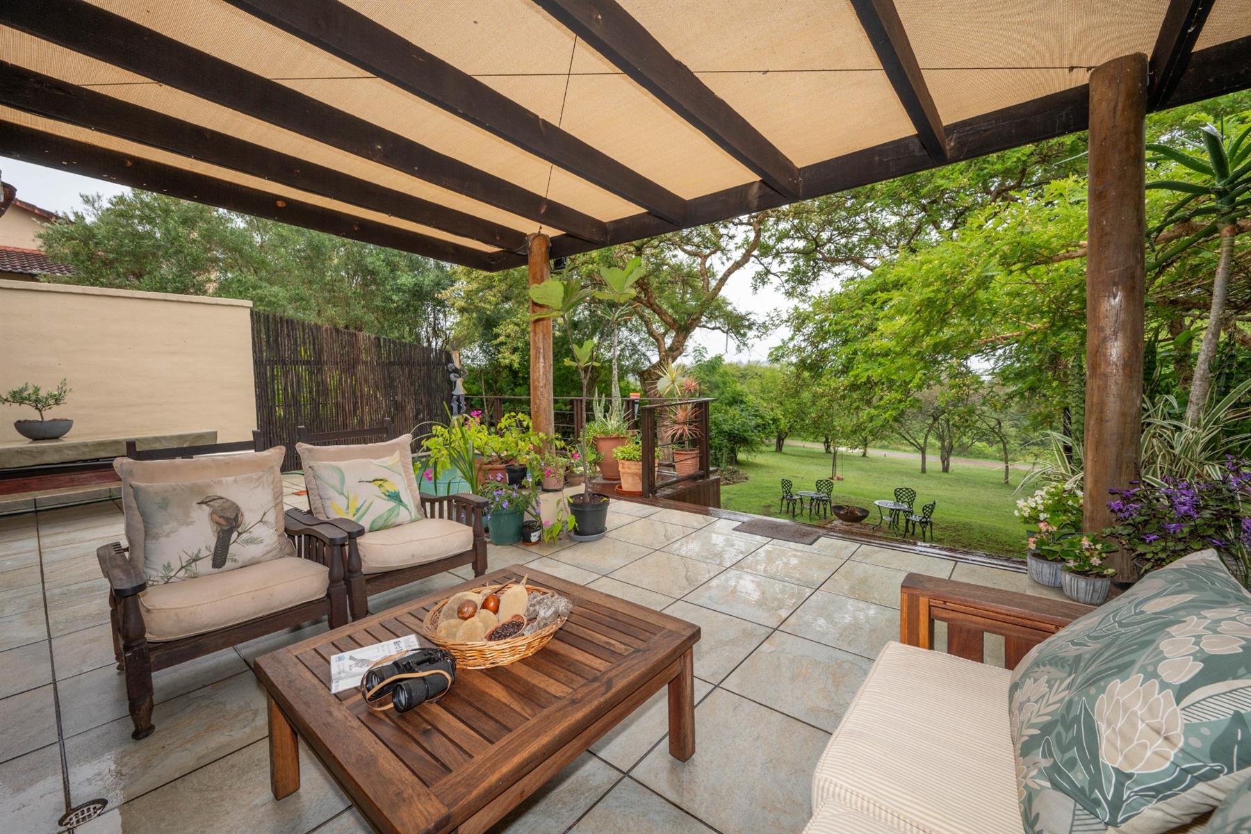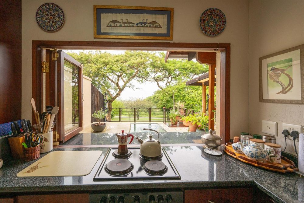 The heart of the home is the open-plan kitchen and dining area, which is adorned with elegant granite tops and is equipped with an oven and hob. Adjacent to the kitchen, the scullery offers additional space and functionality, making it ideal for managing household tasks. The inviting lounge area, complemented by sliding doors, leads out to a covered patio, perfect for enjoying the scenic views of the nature reserve.