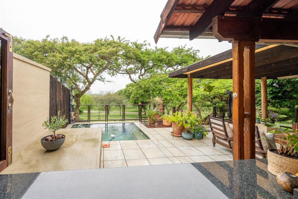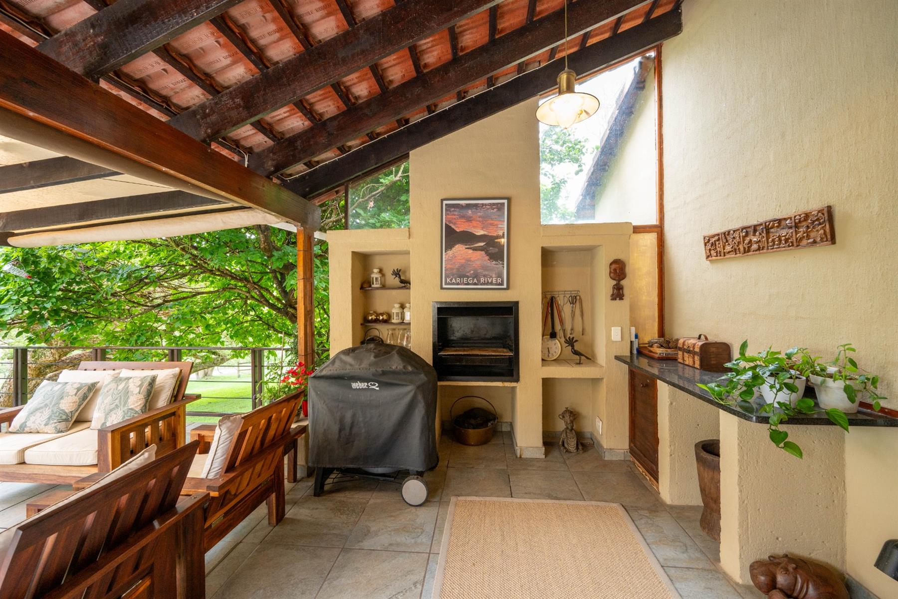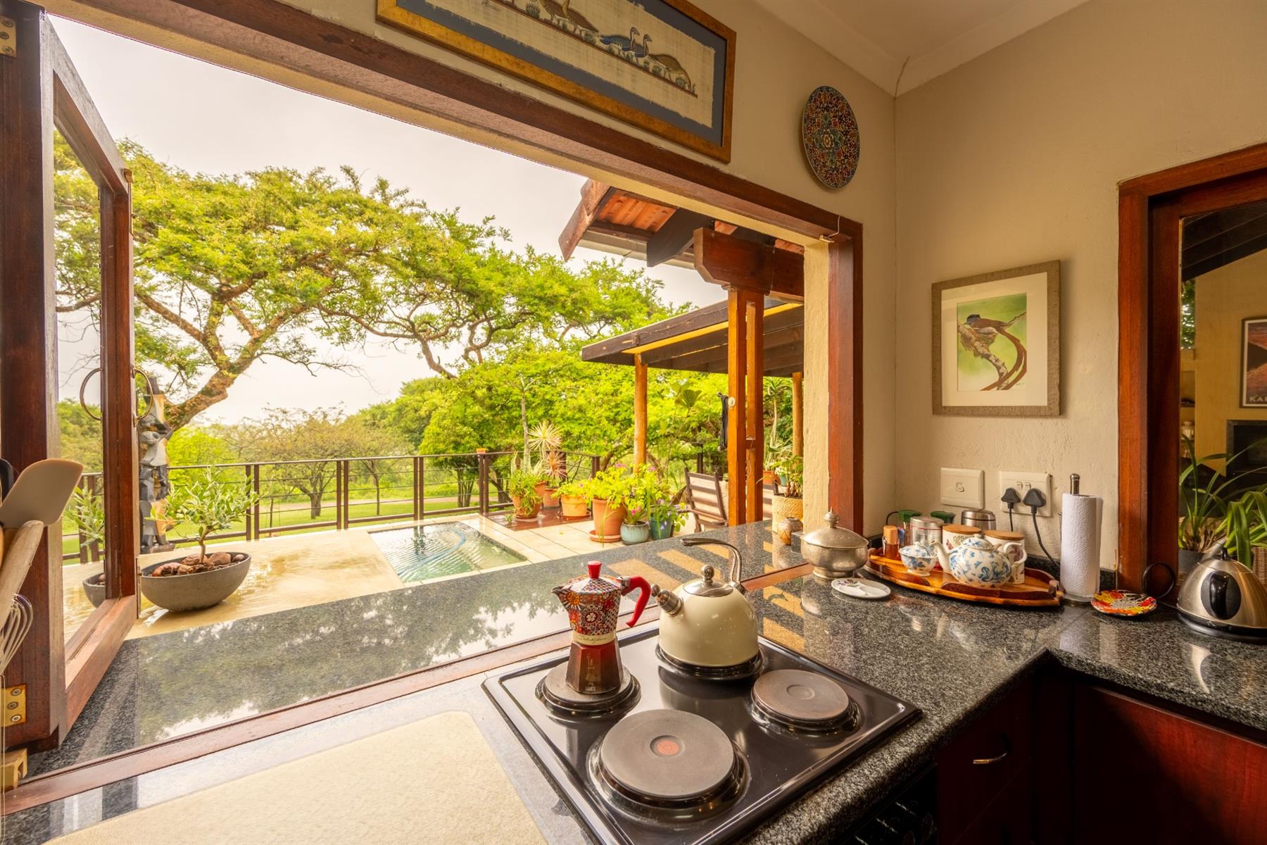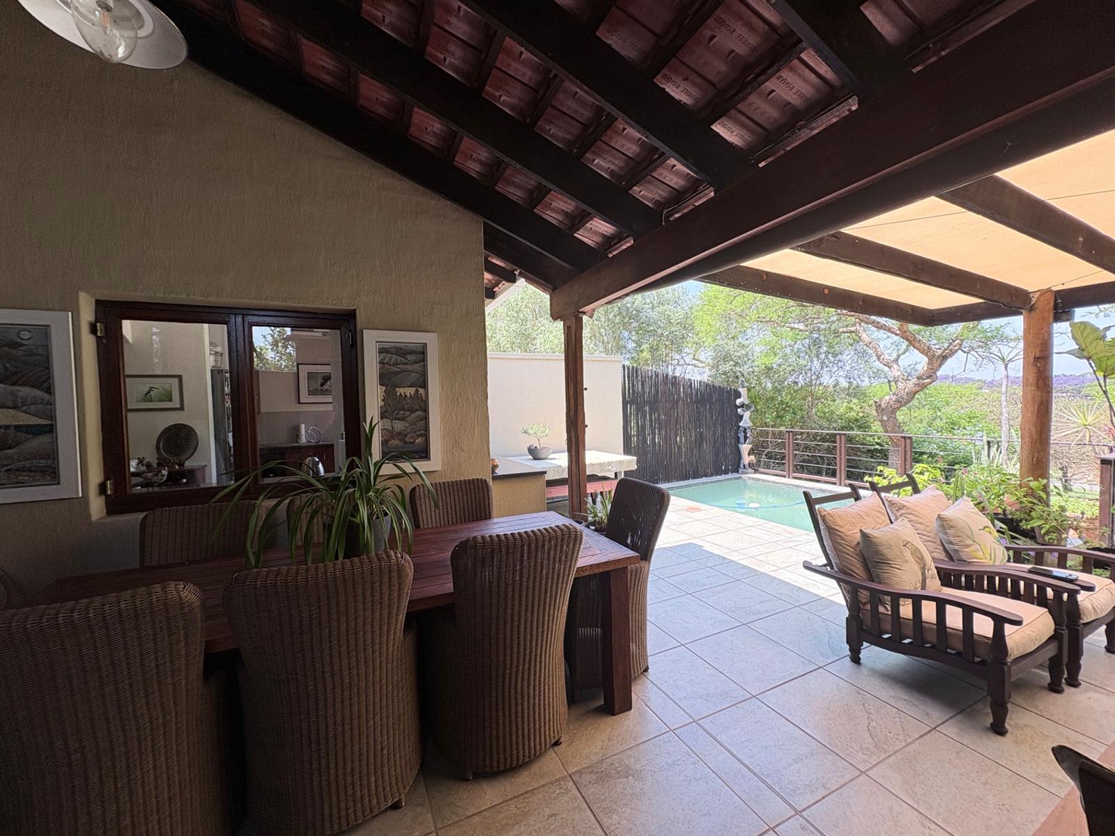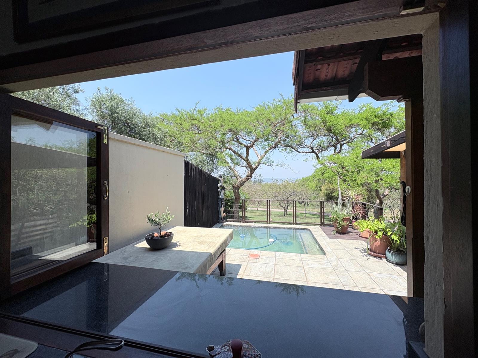 The heart of the home is the open-plan kitchen and dining area, which is adorned with elegant granite tops and is equipped with an oven and hob. Adjacent to the kitchen, the scullery offers additional space and functionality, making it ideal for managing household tasks. The inviting lounge area, complemented by sliding doors, leads out to a covered patio, perfect for enjoying the scenic views of the nature reserve.