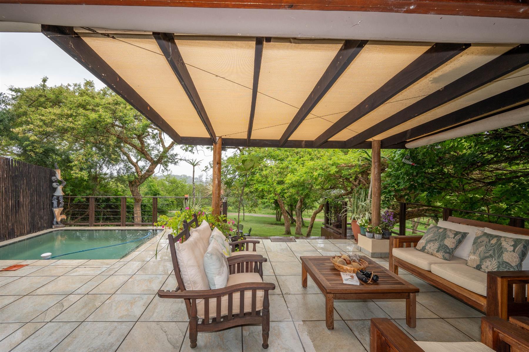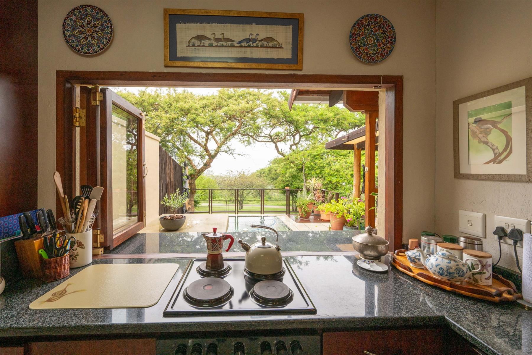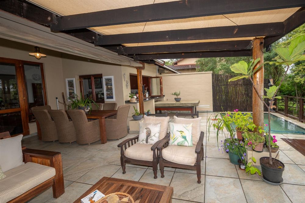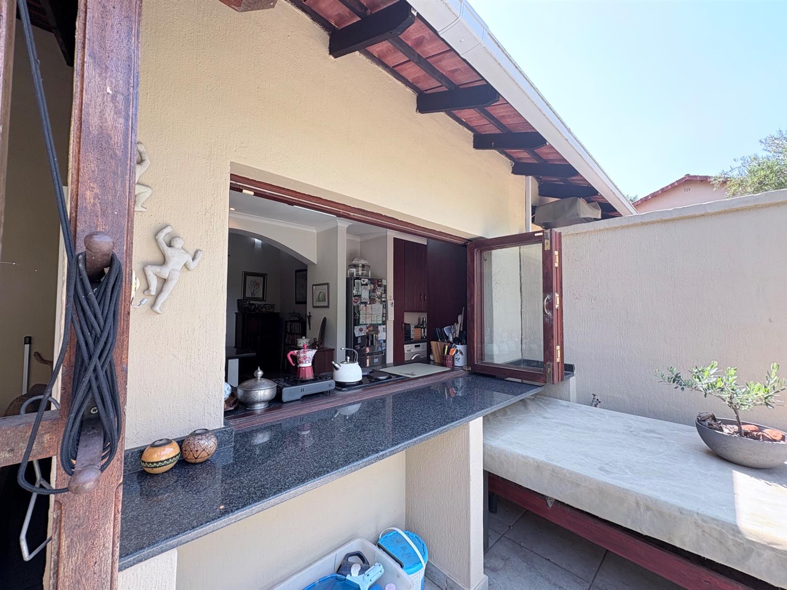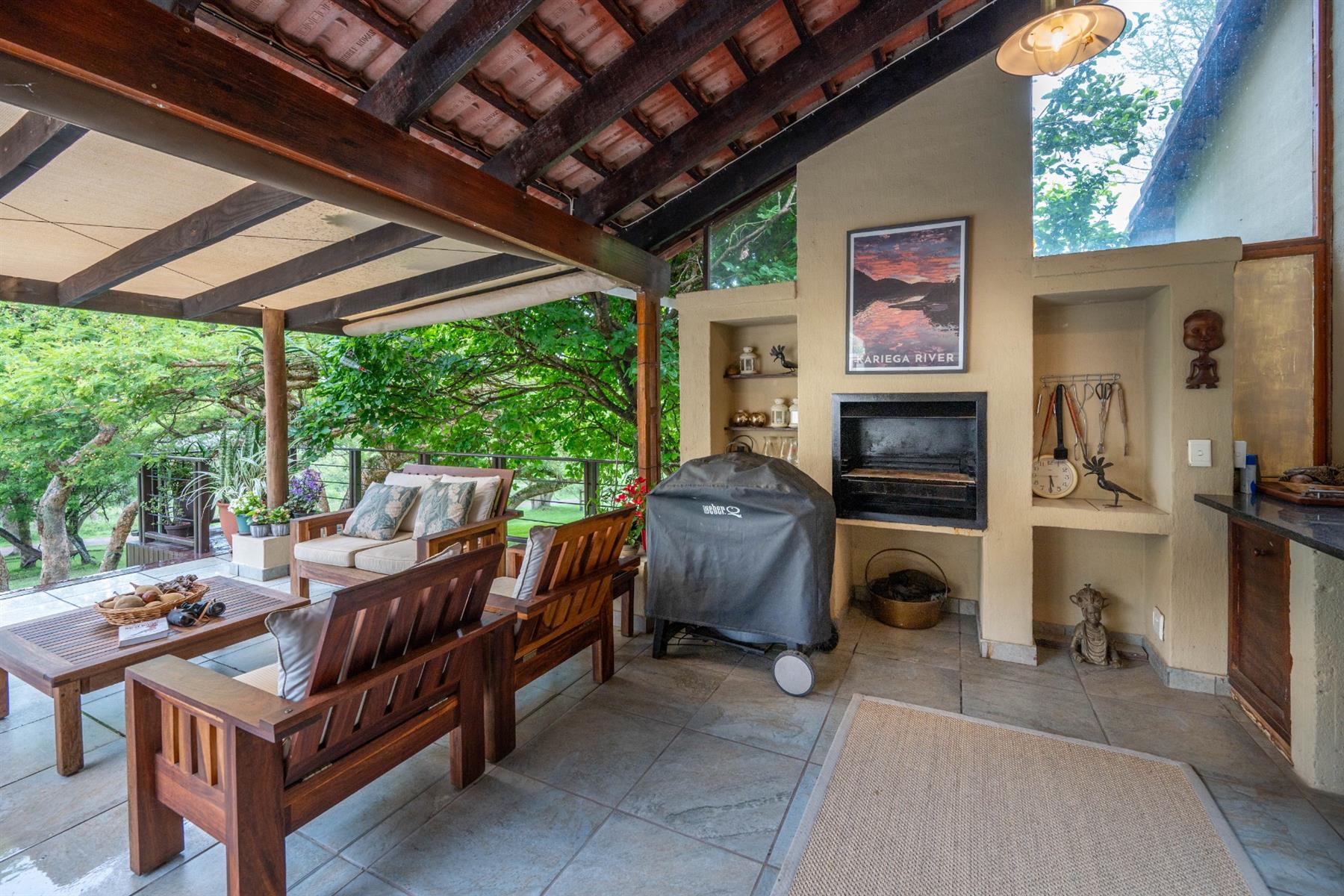 The heart of the home is the open-plan kitchen and dining area, which is adorned with elegant granite tops and is equipped with an oven and hob. Adjacent to the kitchen, the scullery offers additional space and functionality, making it ideal for managing household tasks. The inviting lounge area, complemented by sliding doors, leads out to a covered patio, perfect for enjoying the scenic views of the nature reserve.