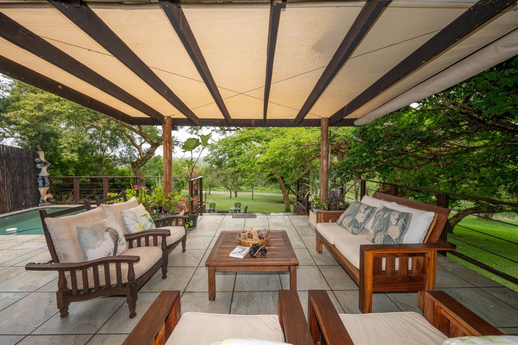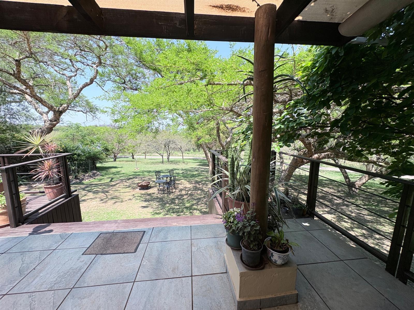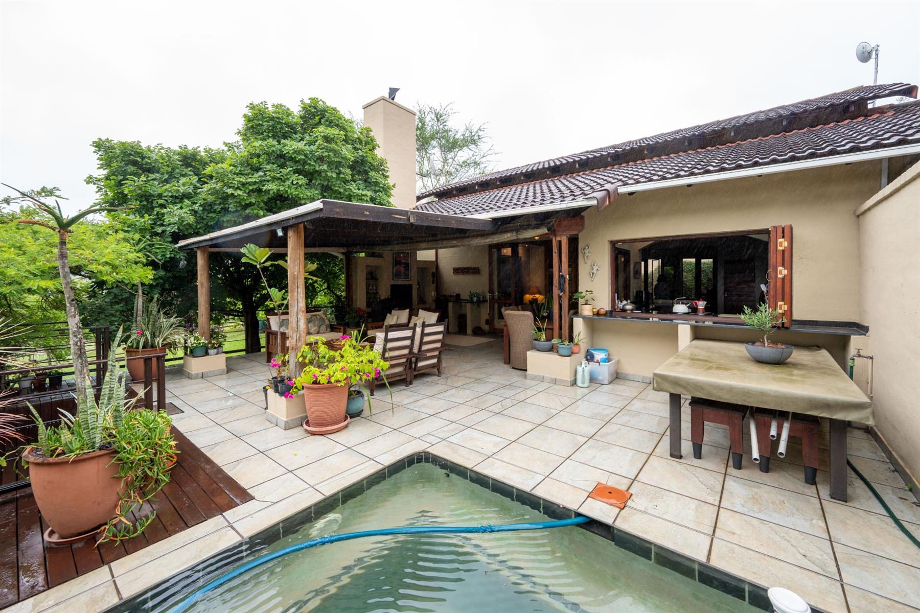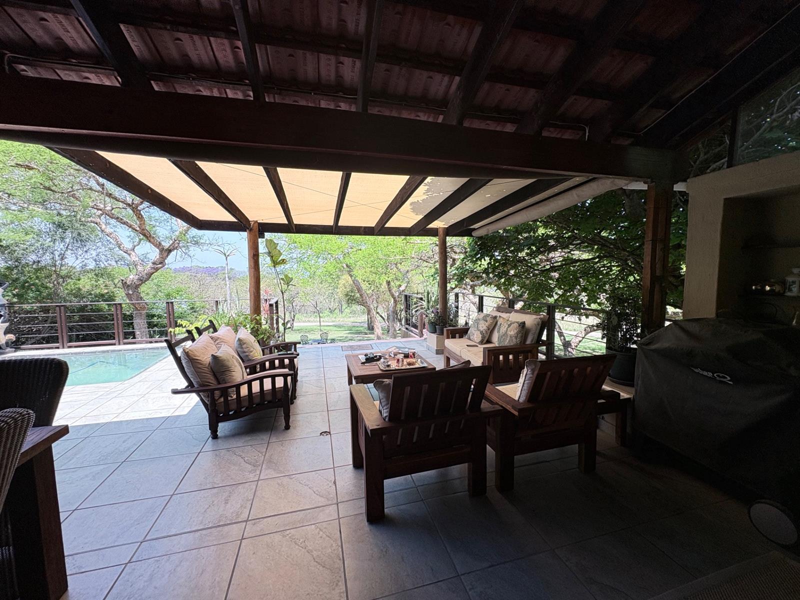 The heart of the home is the open-plan kitchen and dining area, which is adorned with elegant granite tops and is equipped with an oven and hob. Adjacent to the kitchen, the scullery offers additional space and functionality, making it ideal for managing household tasks. The inviting lounge area, complemented by sliding doors, leads out to a covered patio, perfect for enjoying the scenic views of the nature reserve.