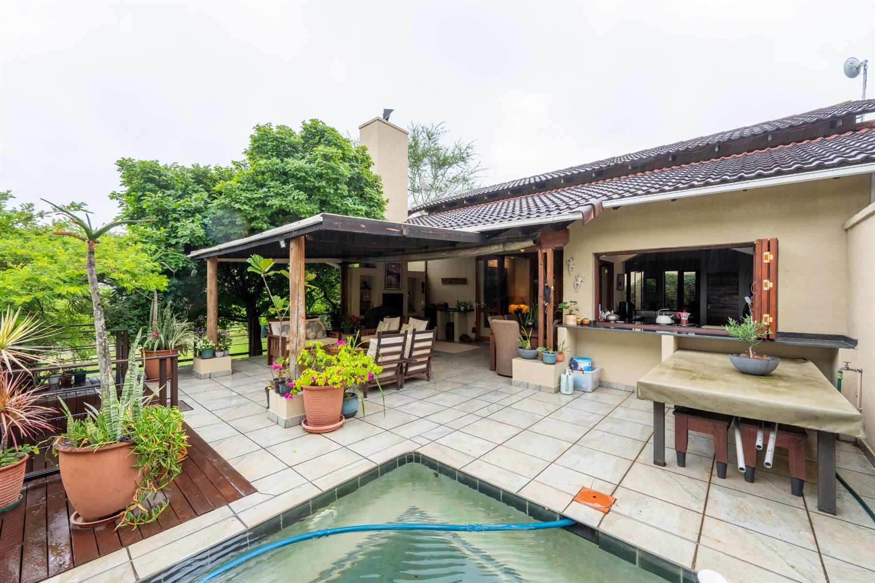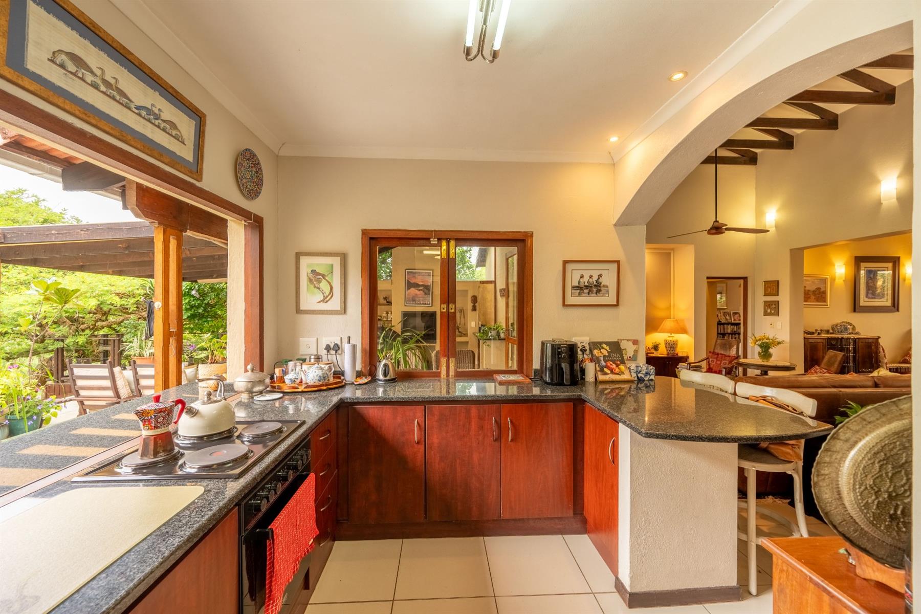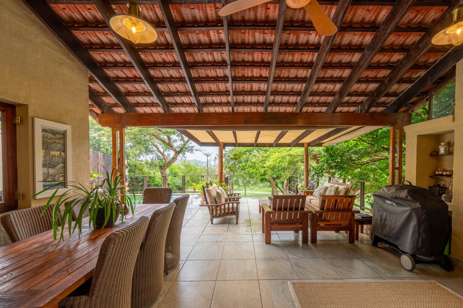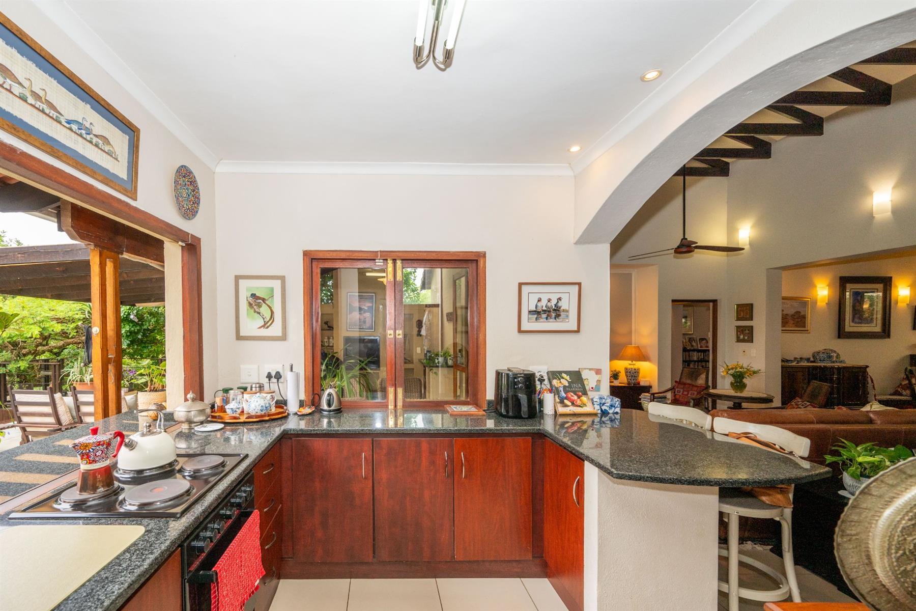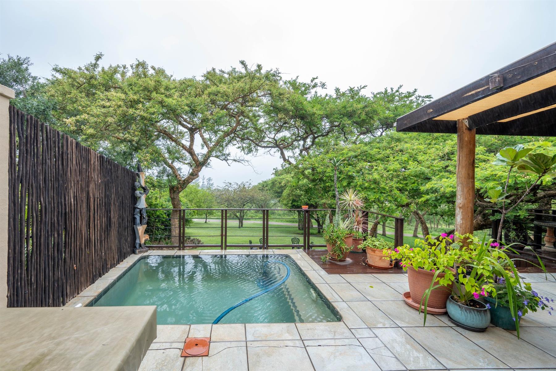 The heart of the home is the open-plan kitchen and dining area, which is adorned with elegant granite tops and is equipped with an oven and hob. Adjacent to the kitchen, the scullery offers additional space and functionality, making it ideal for managing household tasks. The inviting lounge area, complemented by sliding doors, leads out to a covered patio, perfect for enjoying the scenic views of the nature reserve.