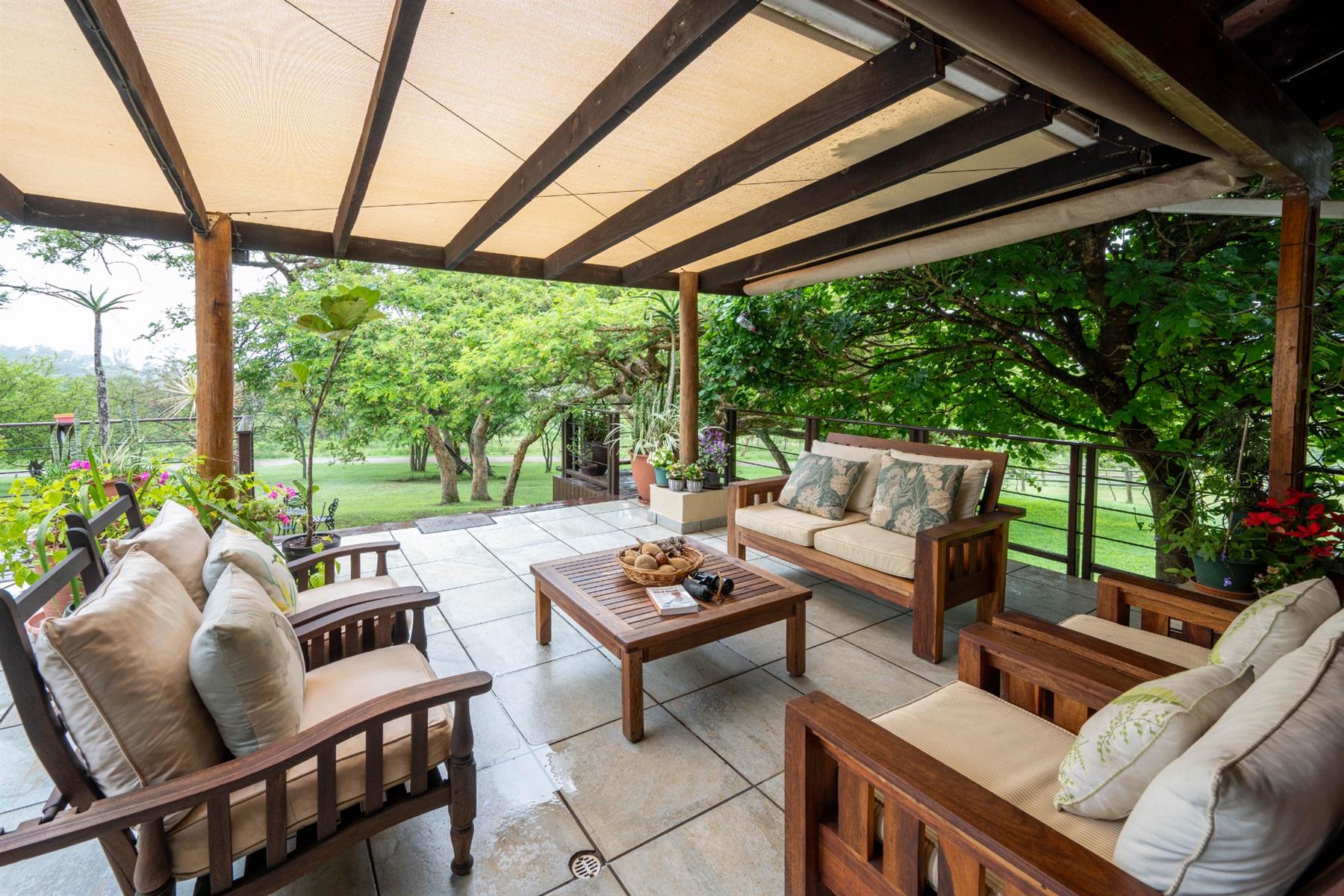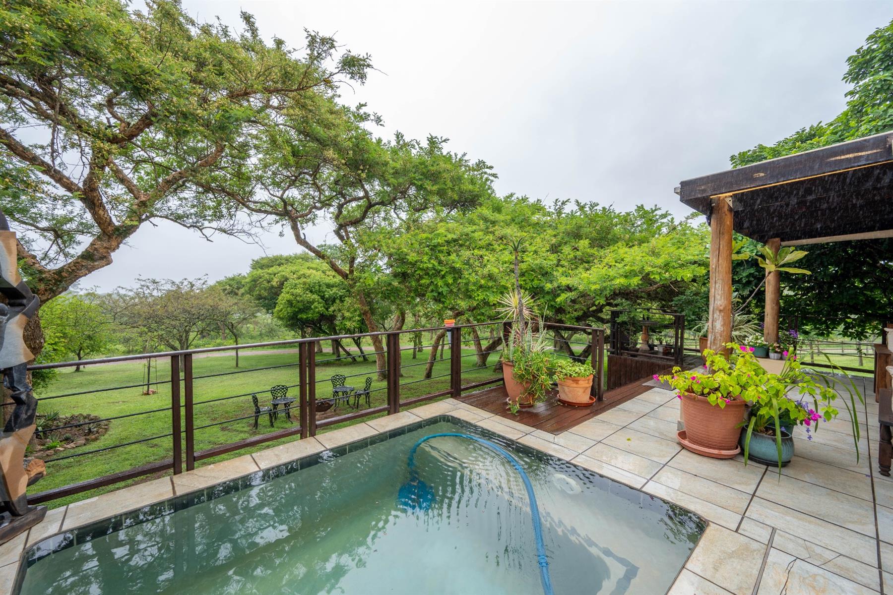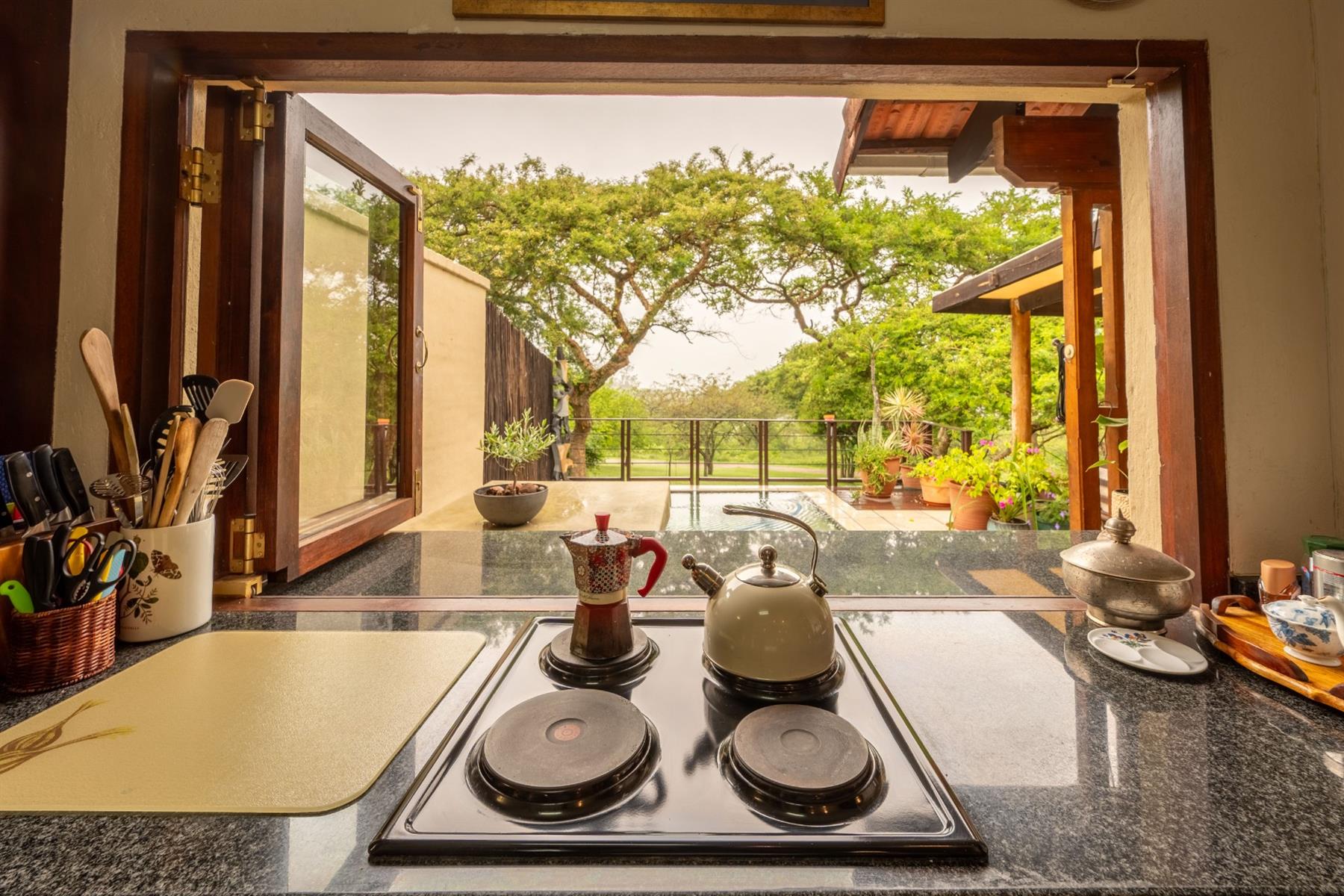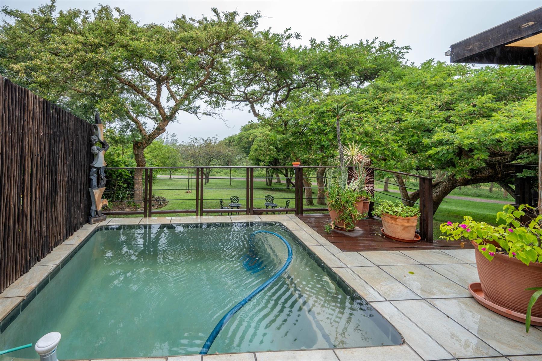The heart of the home is the open-plan kitchen and dining area, which is adorned with elegant granite tops and is equipped with an oven and hob. Adjacent to the kitchen, the scullery offers additional space and functionality, making it ideal for managing household tasks. The inviting lounge area, complemented by sliding doors, leads out to a covered patio, perfect for enjoying the scenic views of the nature reserve.