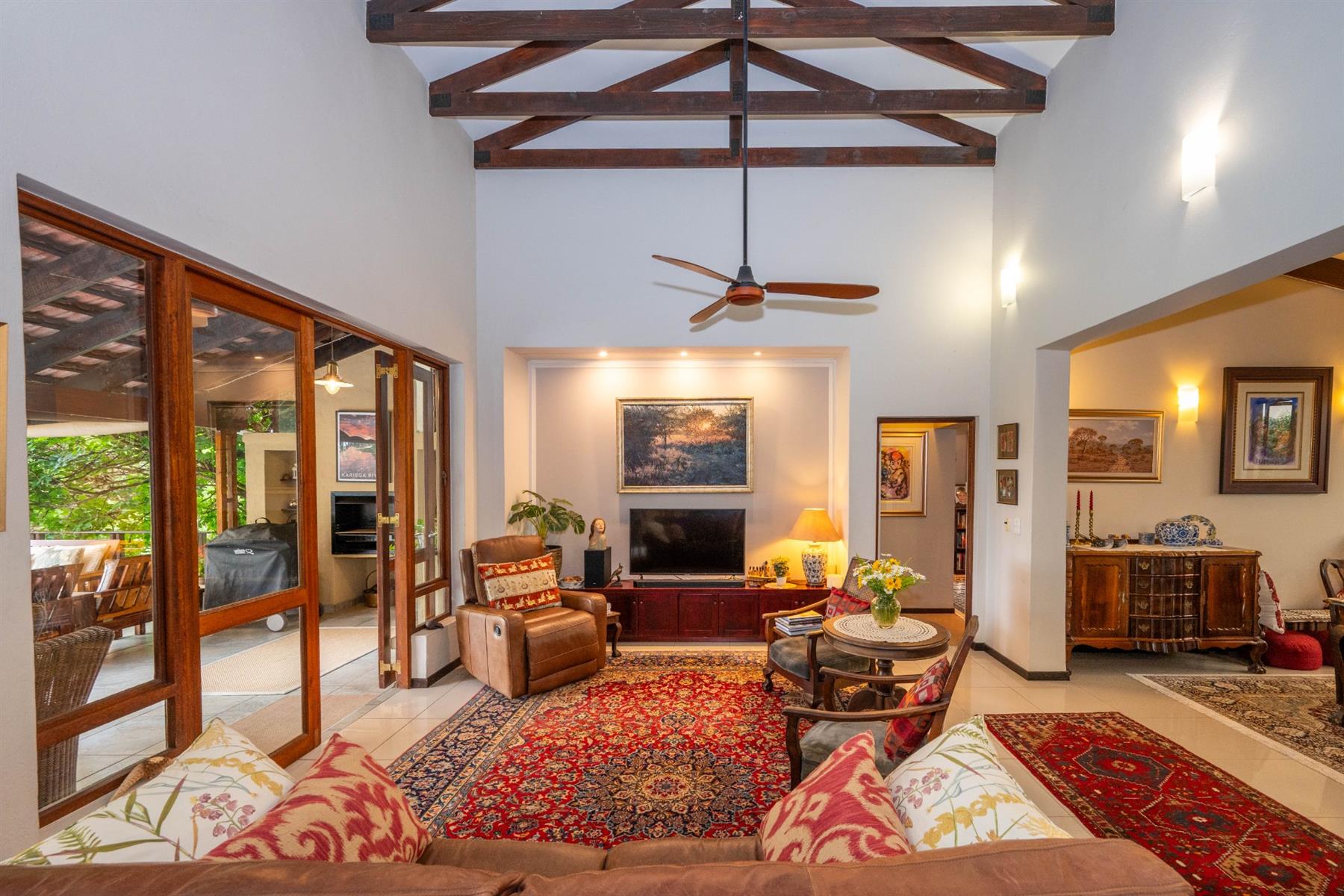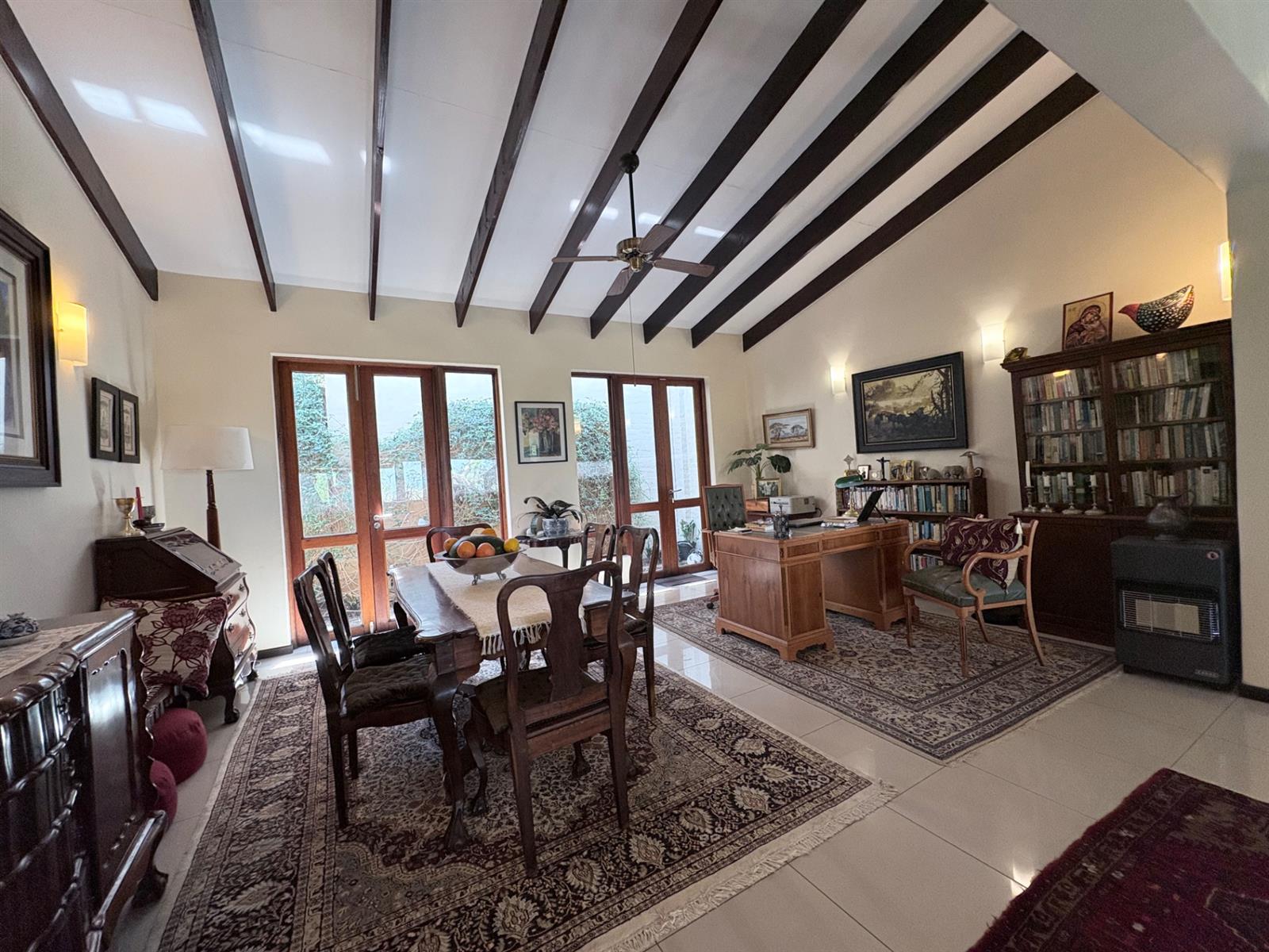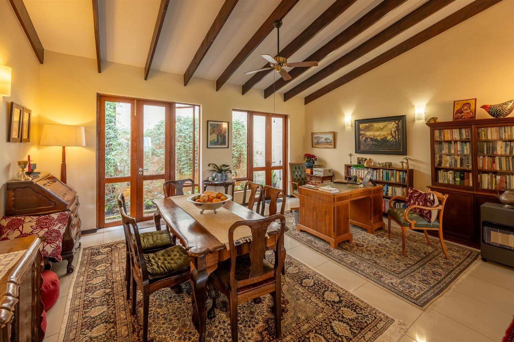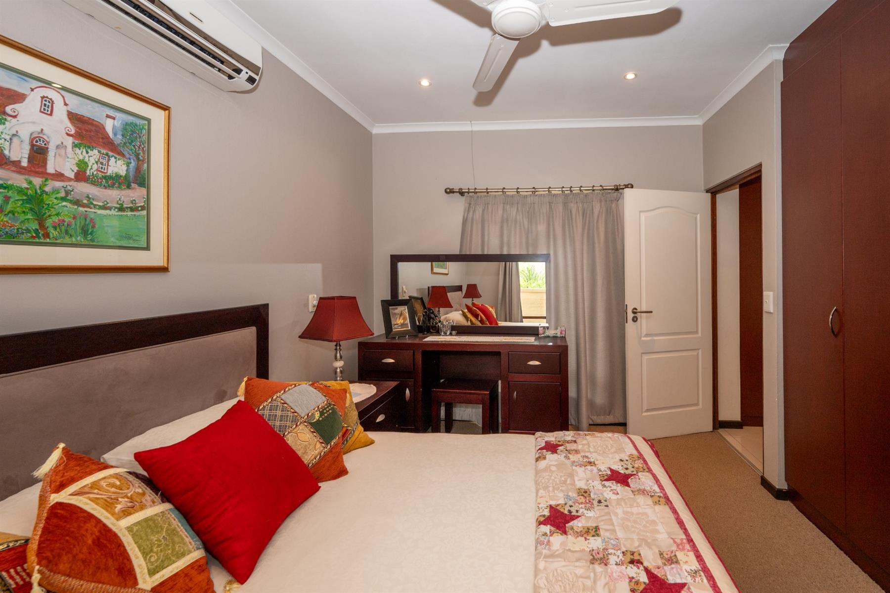 Outside, the property features a well-maintained yard and a charming garden, providing a peaceful oasis for relaxation or entertaining. The built-in braai creates an ideal setting for outdoor gatherings. With automated garage doors leading to double garages and ample parking space, convenience is at your fingertips.
