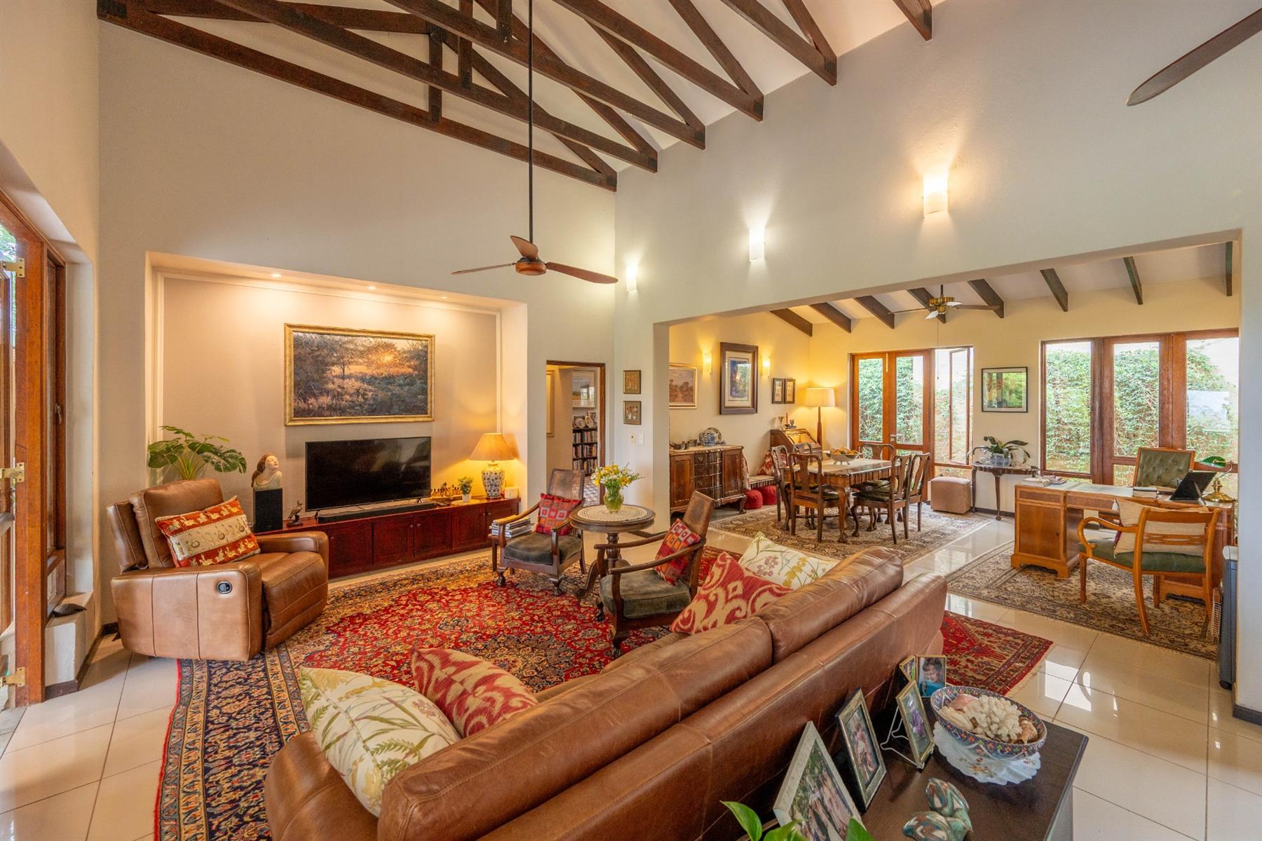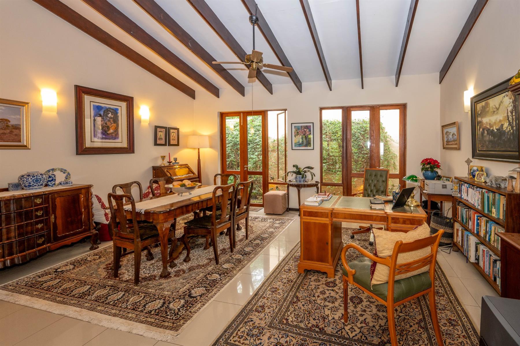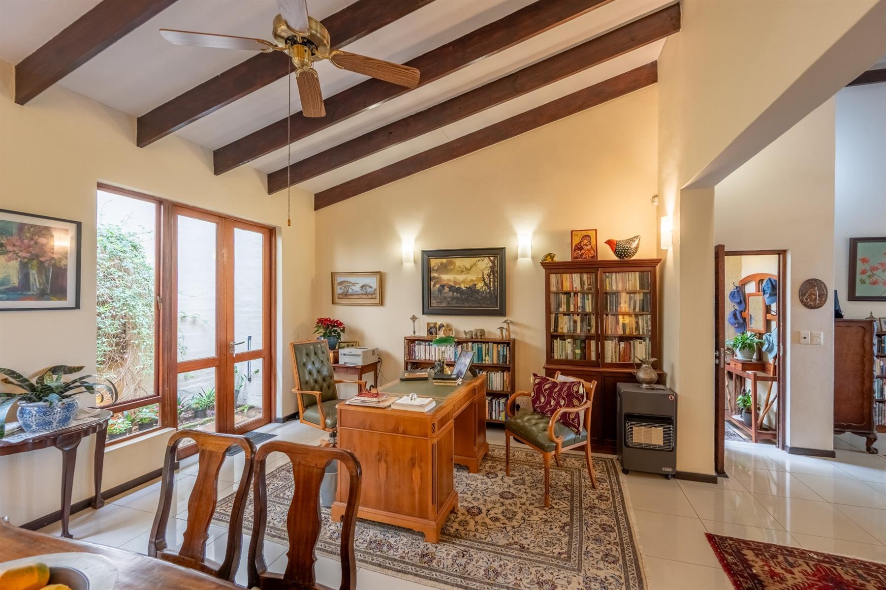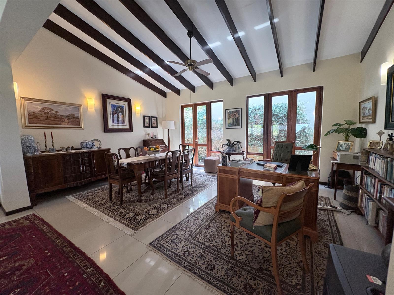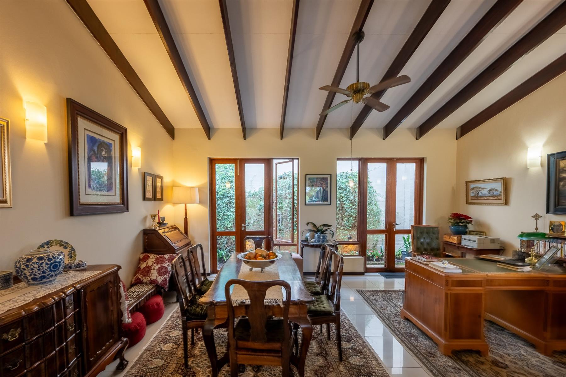 Outside, the property features a well-maintained yard and a charming garden, providing a peaceful oasis for relaxation or entertaining. The built-in braai creates an ideal setting for outdoor gatherings. With automated garage doors leading to double garages and ample parking space, convenience is at your fingertips.