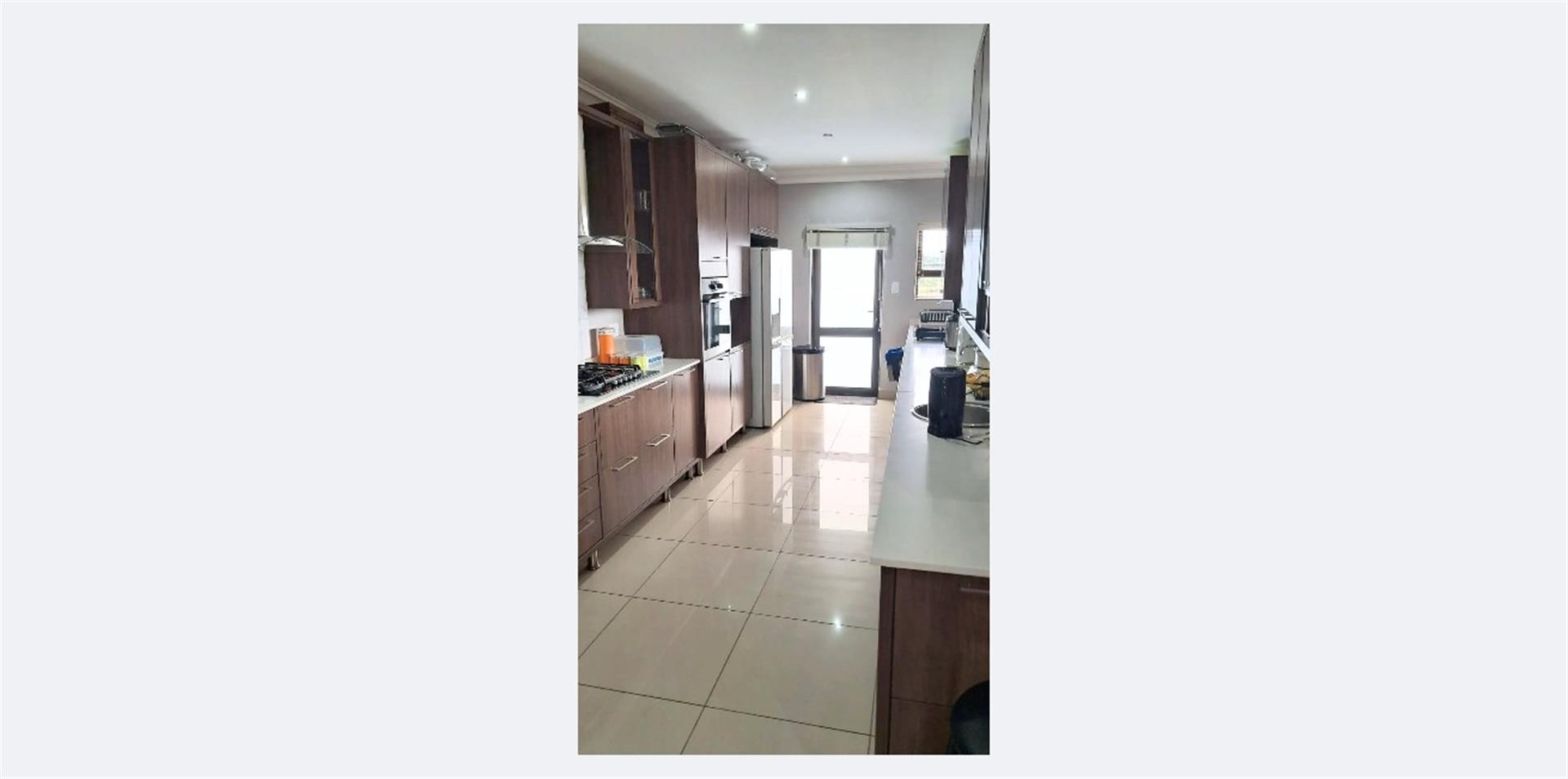 Stylish kitchen includes a gas stove, eye-level oven, water purifier, and a sliding serving window to the braai area.