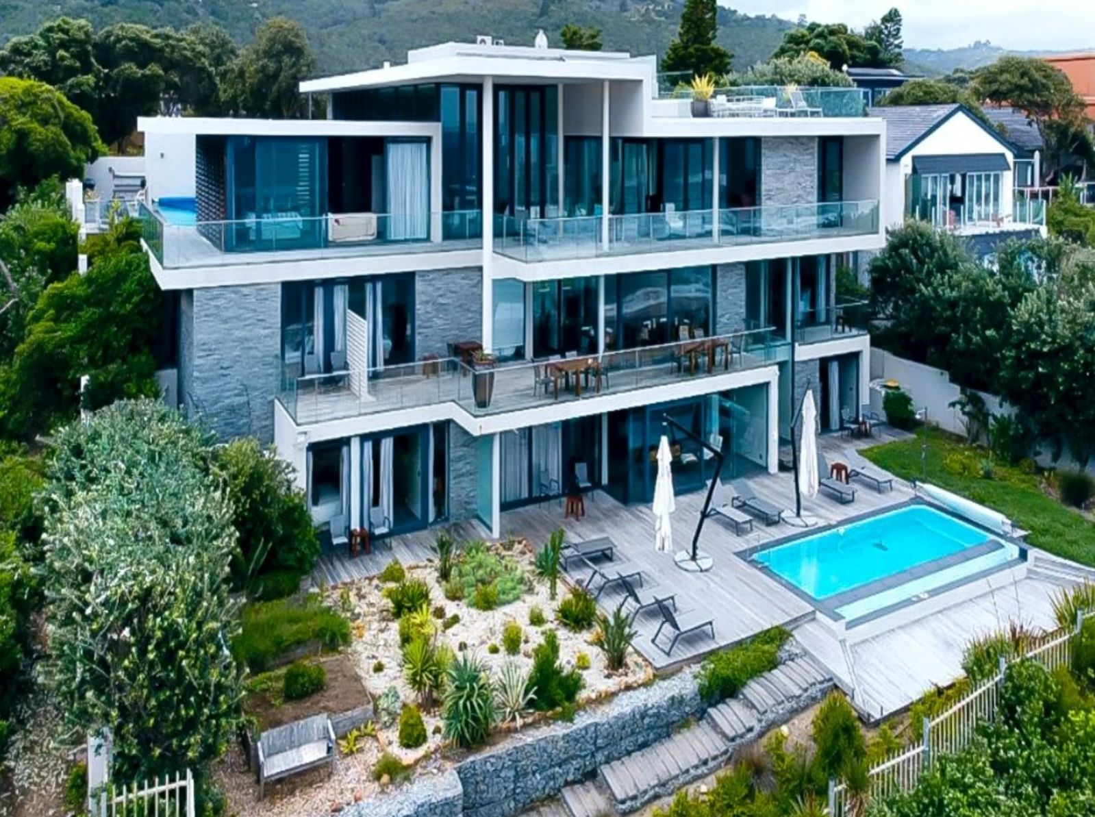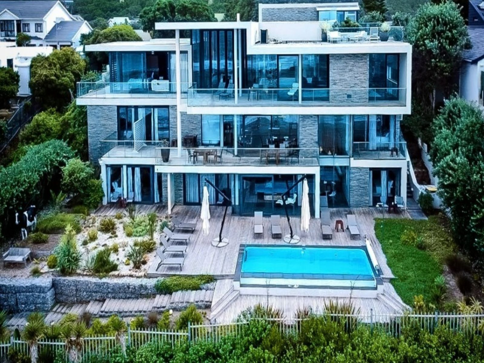 The lower levels include six double guest suites, each with an en-suite bathroom, ensuring comfort and privacy. A second pool and a fully equipped kitchen provide ample space for entertainment.