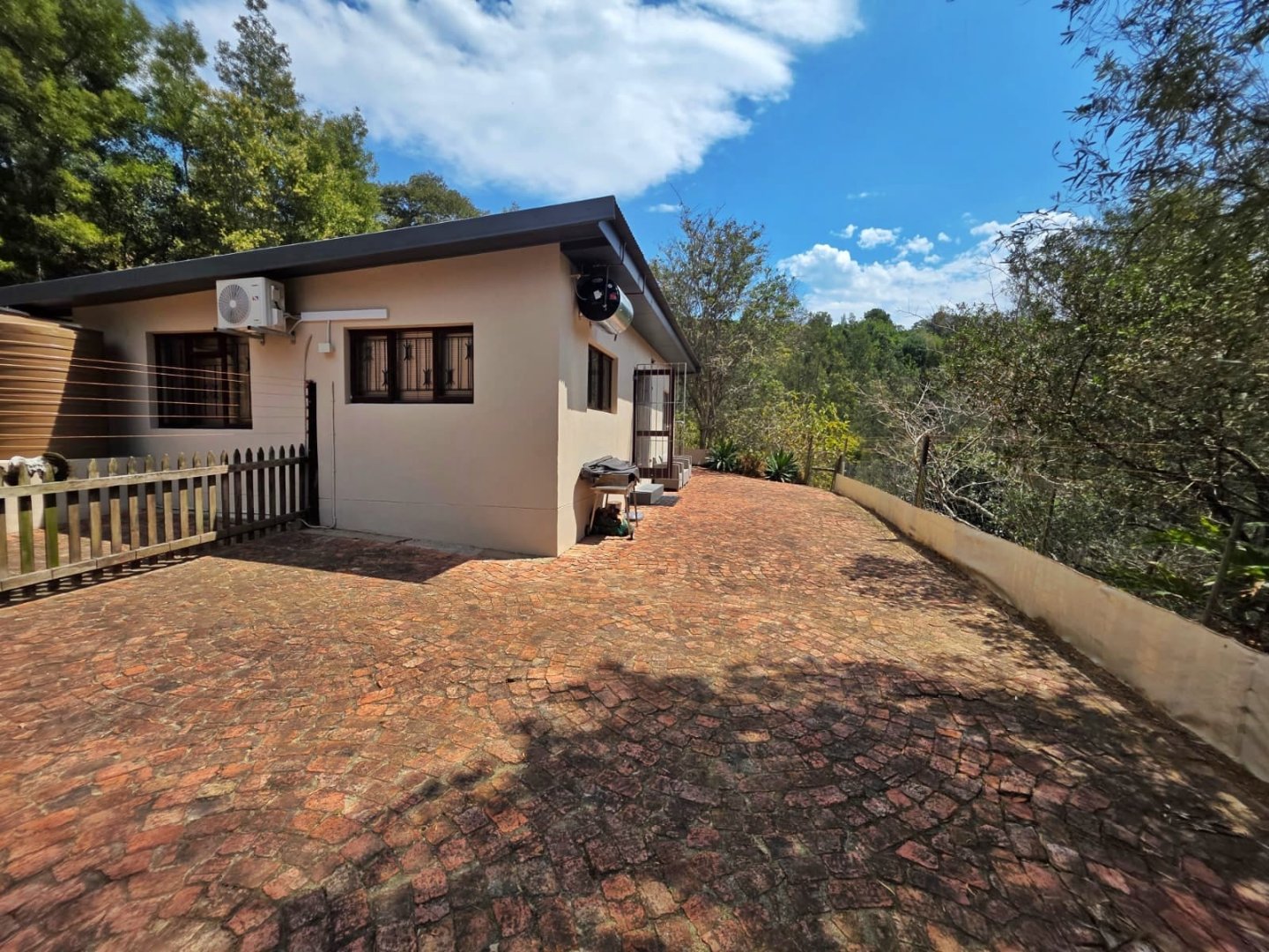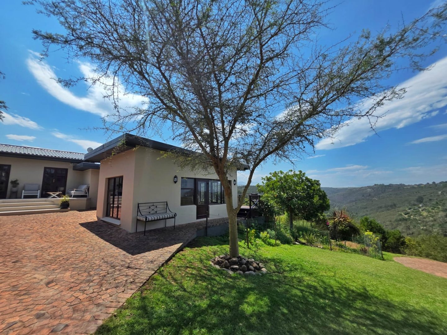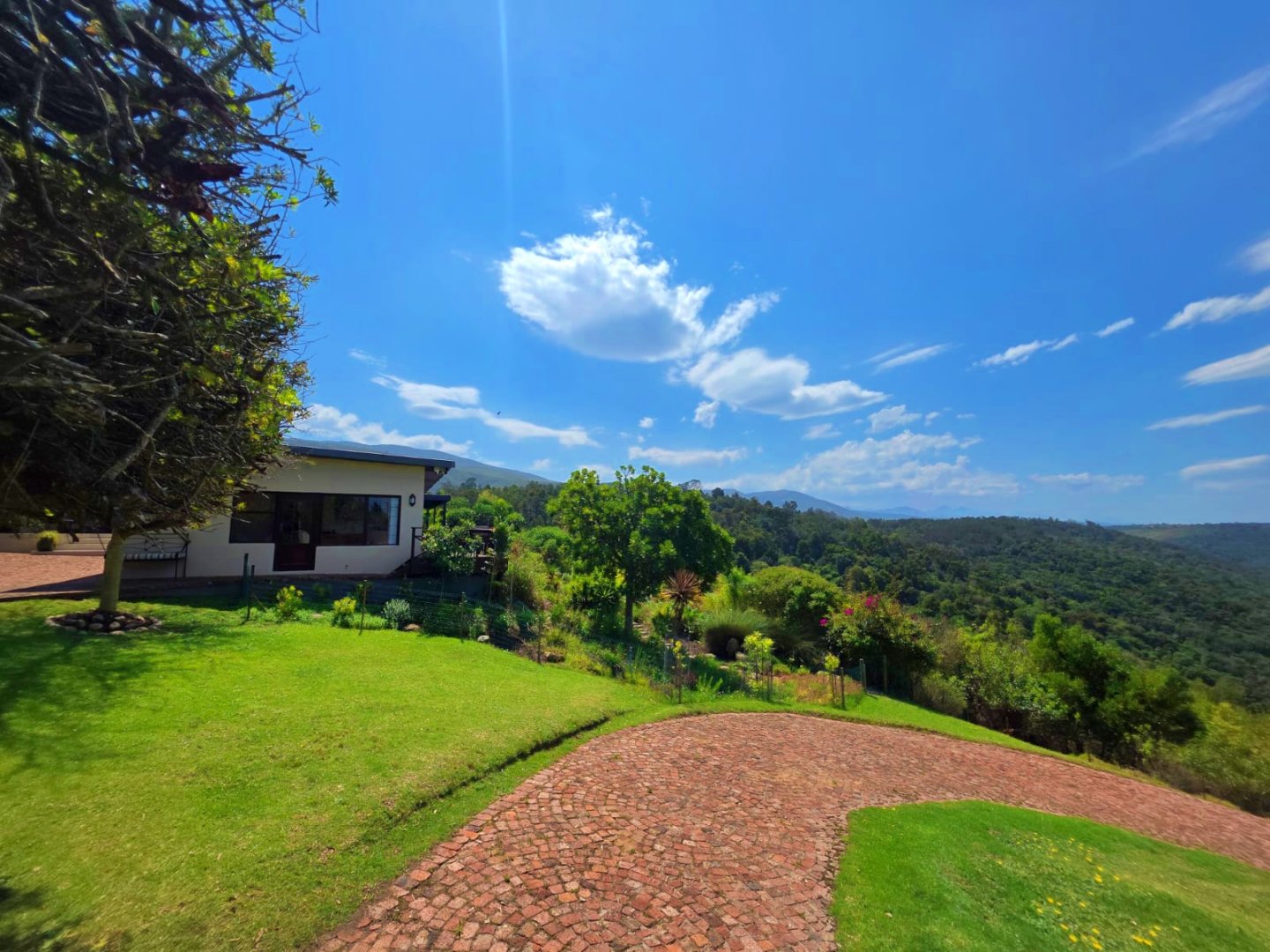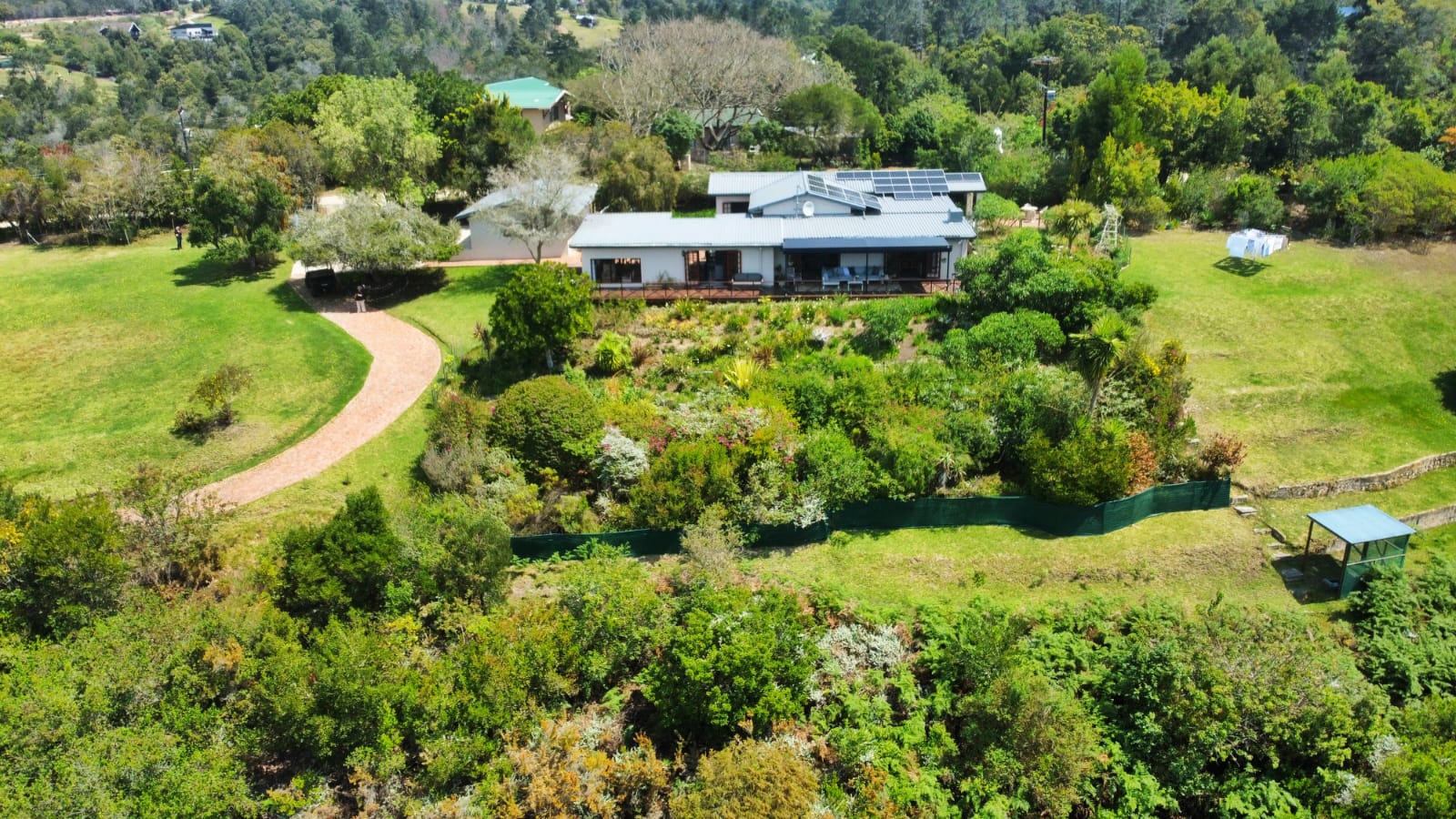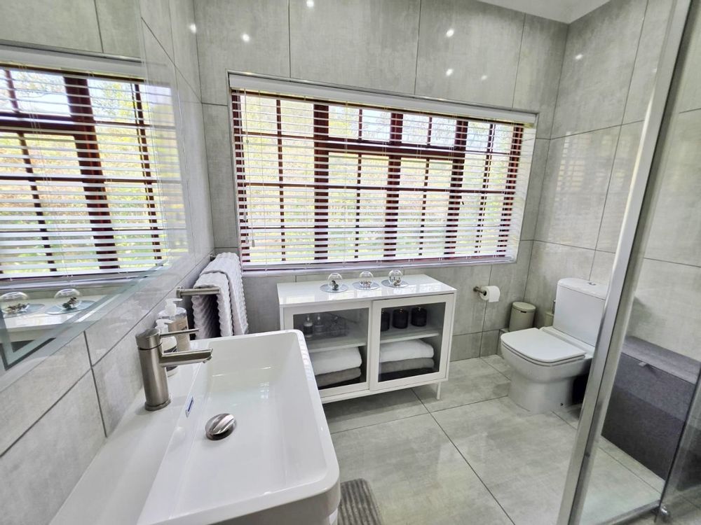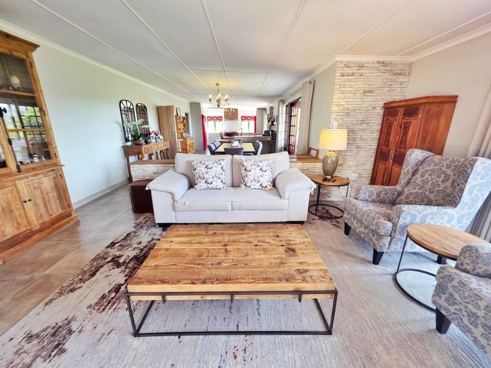 The open-plan lounge exudes warmth and comfort, while a separate TV lounge or study provides a quiet retreat with panoramic garden and forest views. The property is well equipped for modern living, with its own solar power system comprising panels, inverter, and batteries — ensuring energy independence and sustainability. Municipal services are in place, supplemented by an excellent water-harvesting system for added security and eco-conscious living. A triple garage and ample paved parking provide convenience for family and guests alike.