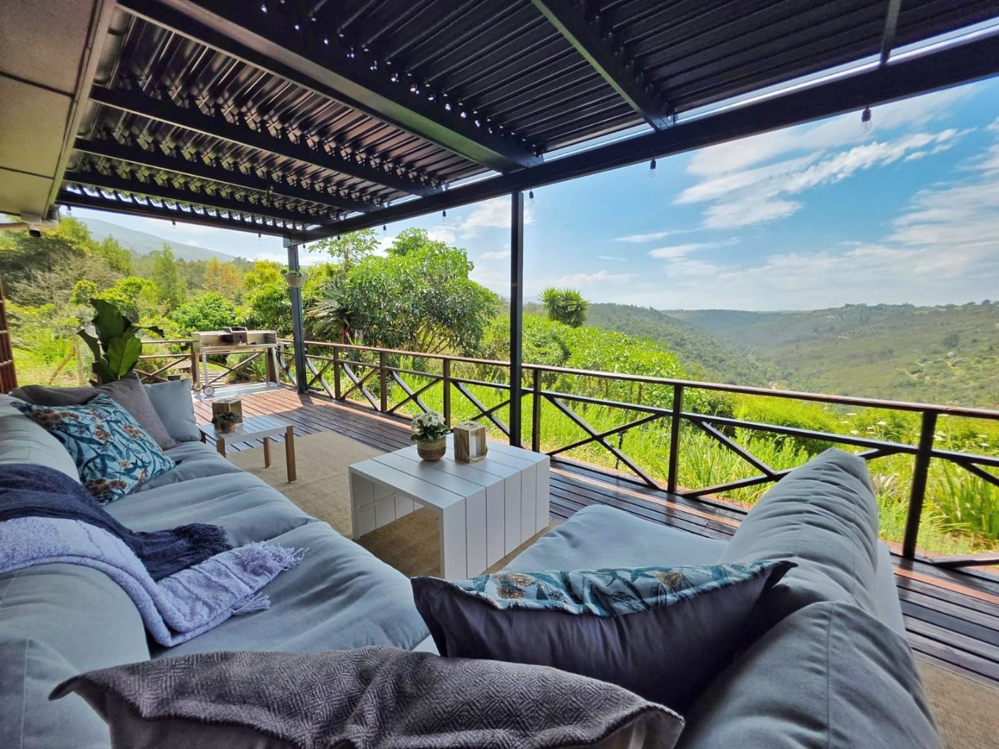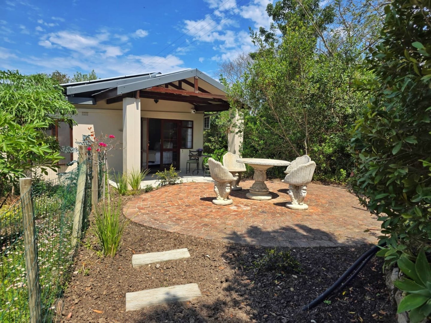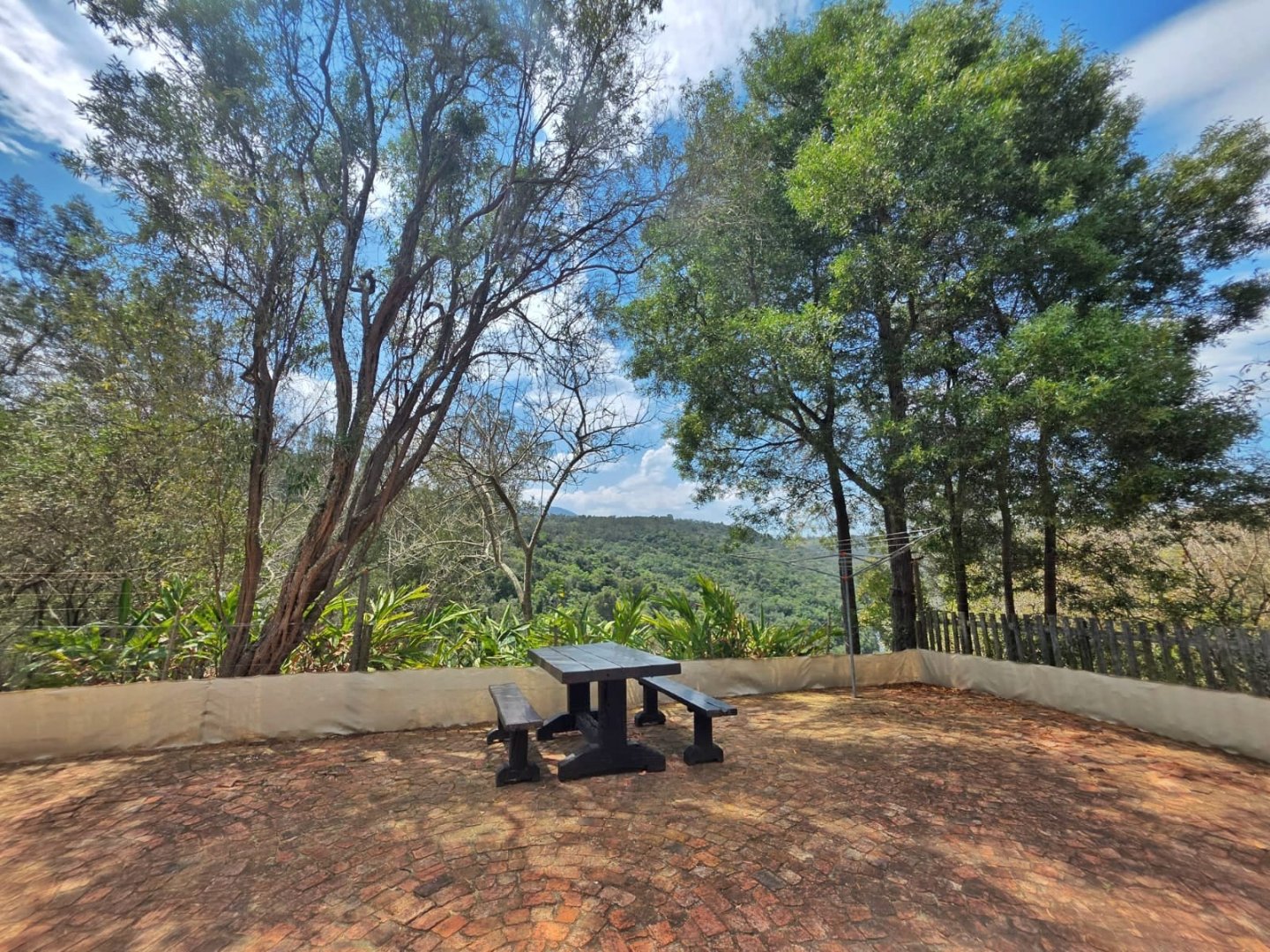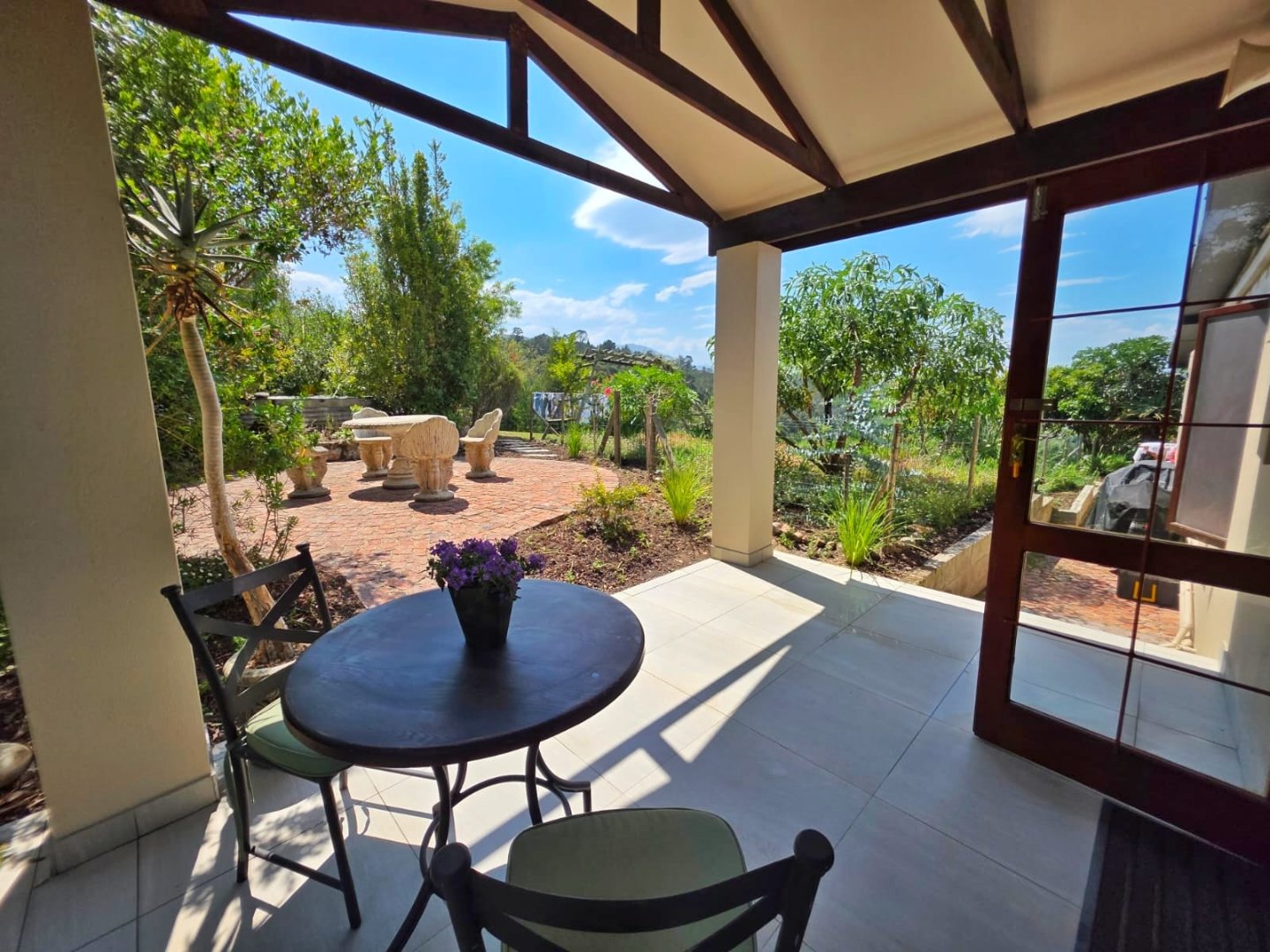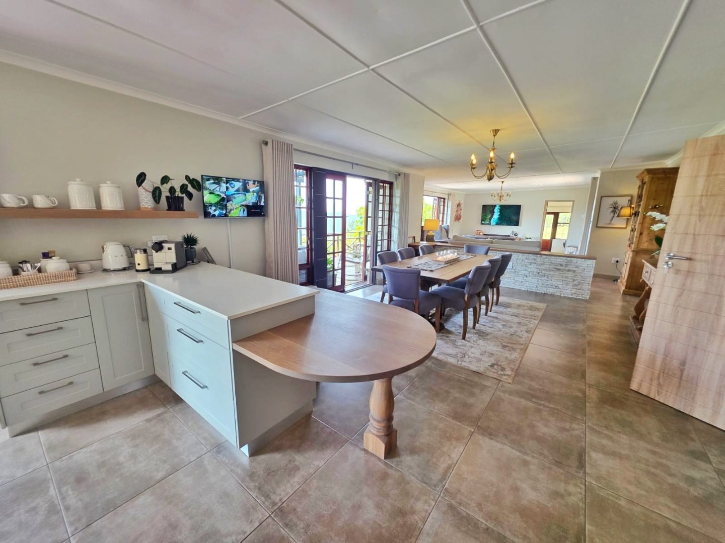 The open-plan lounge exudes warmth and comfort, while a separate TV lounge or study provides a quiet retreat with panoramic garden and forest views. The property is well equipped for modern living, with its own solar power system comprising panels, inverter, and batteries — ensuring energy independence and sustainability. Municipal services are in place, supplemented by an excellent water-harvesting system for added security and eco-conscious living. A triple garage and ample paved parking provide convenience for family and guests alike.