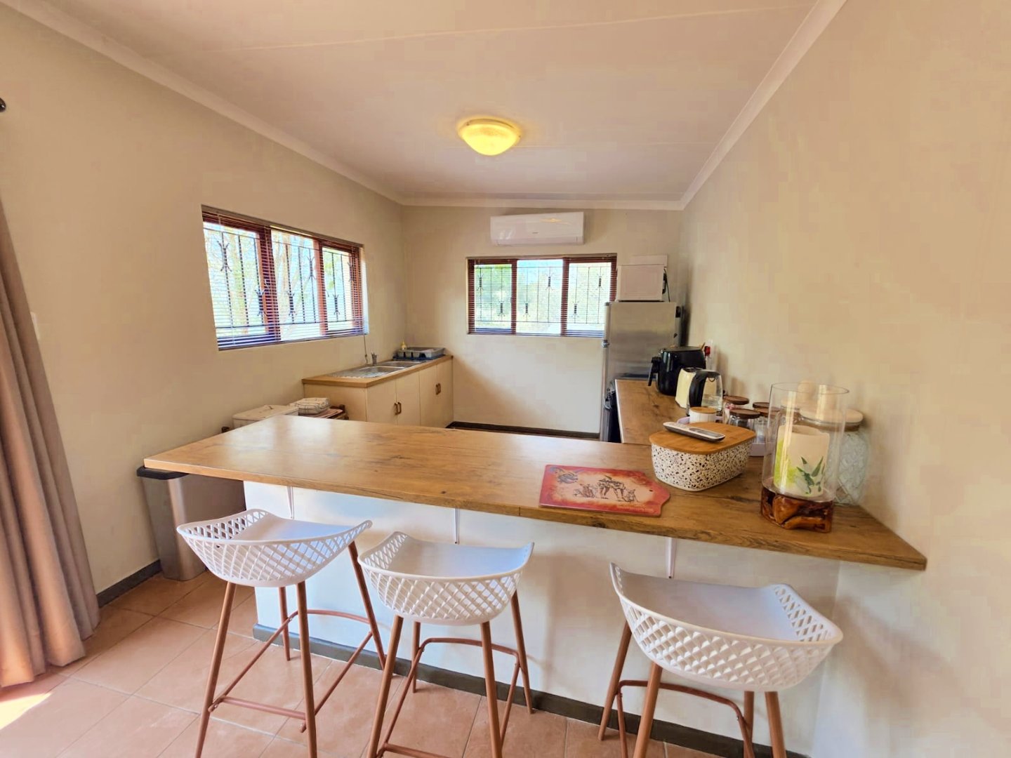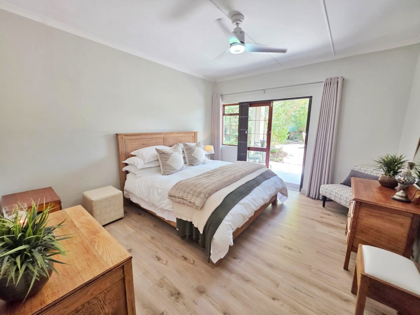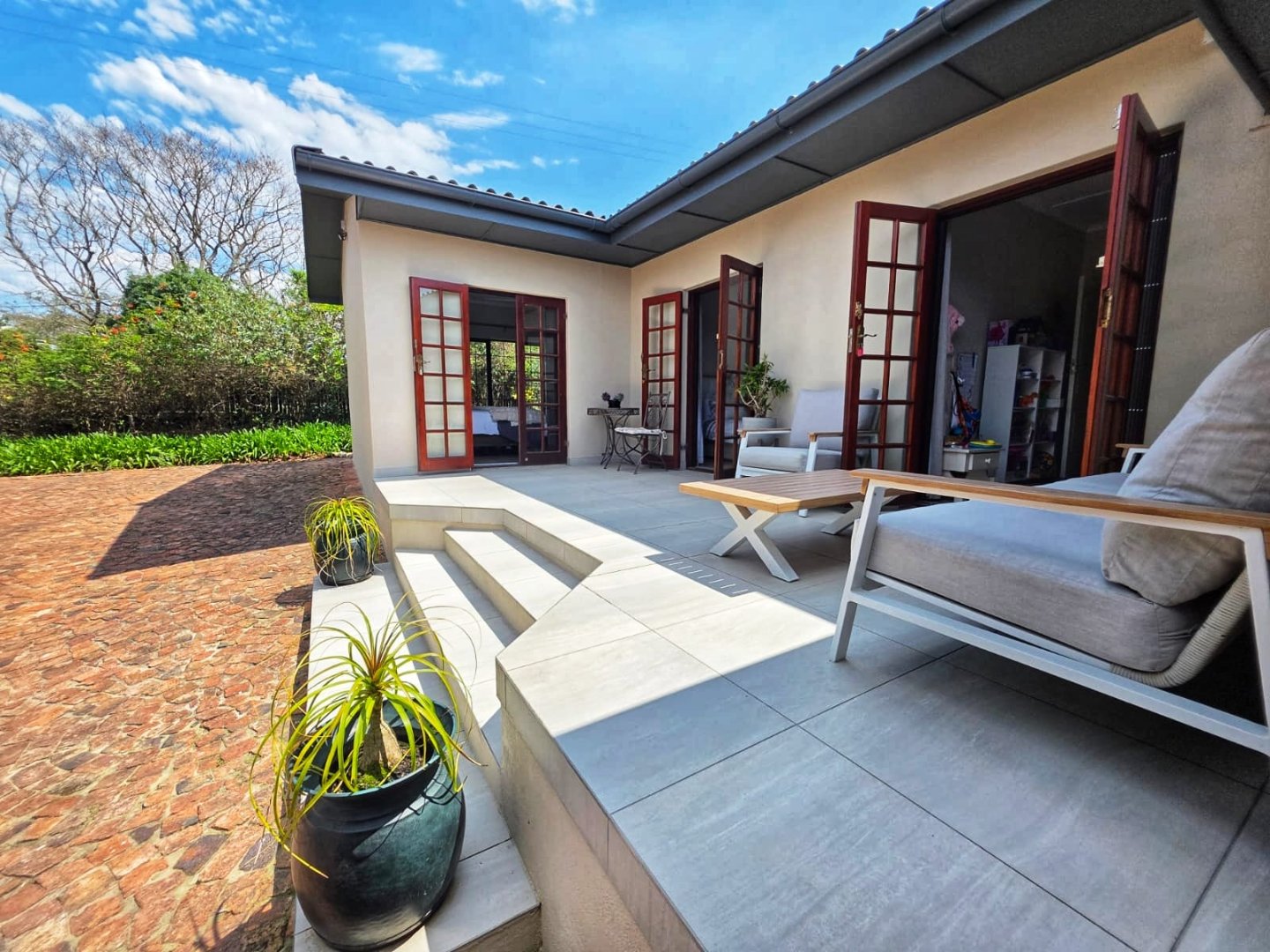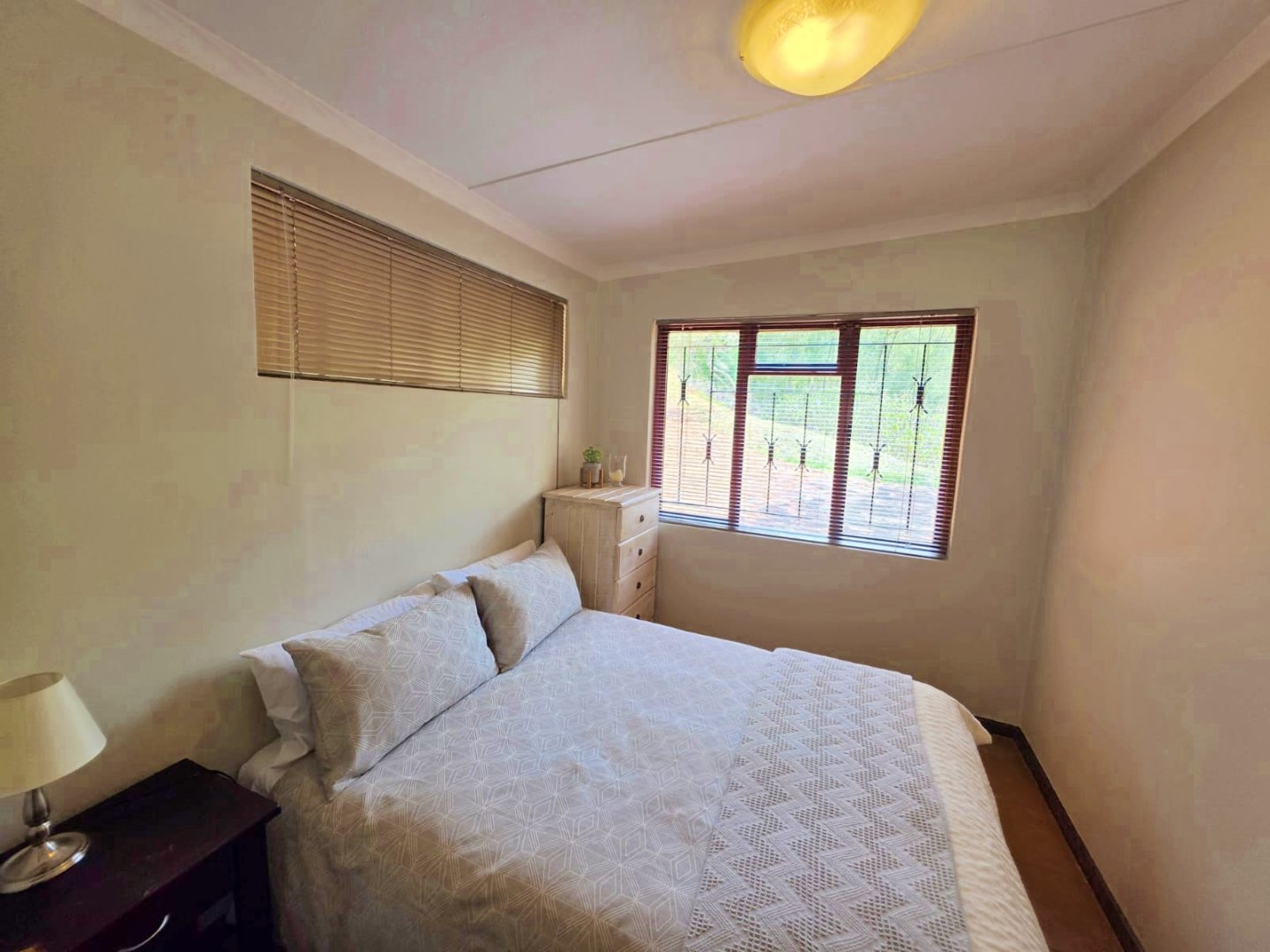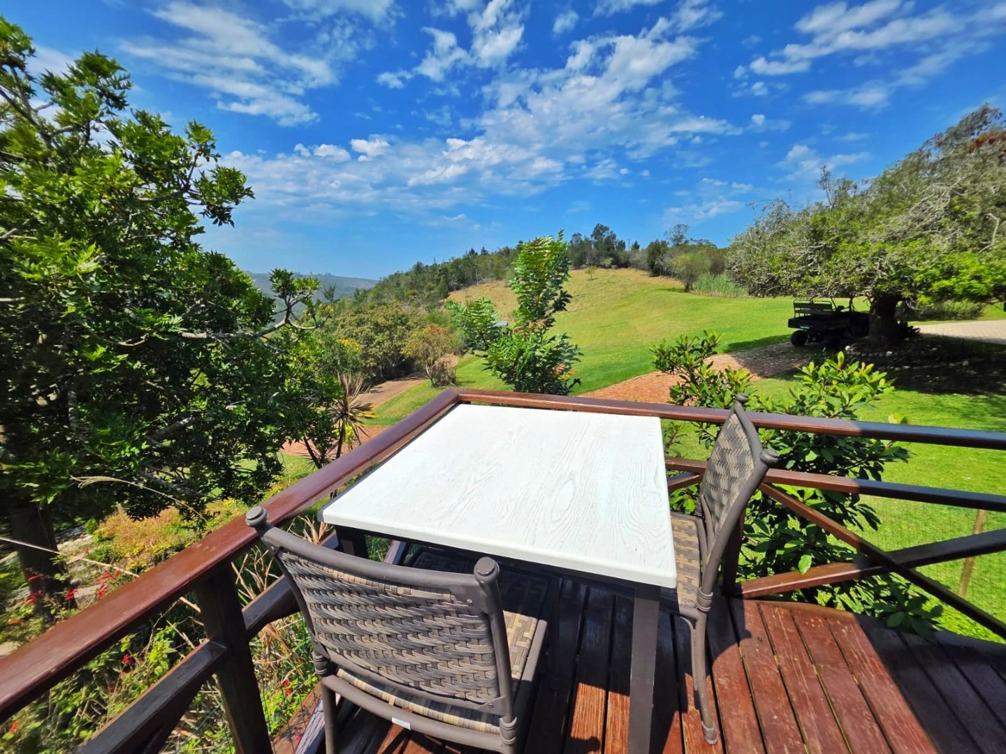 The open-plan lounge exudes warmth and comfort, while a separate TV lounge or study provides a quiet retreat with panoramic garden and forest views. The property is well equipped for modern living, with its own solar power system comprising panels, inverter, and batteries — ensuring energy independence and sustainability. Municipal services are in place, supplemented by an excellent water-harvesting system for added security and eco-conscious living. A triple garage and ample paved parking provide convenience for family and guests alike.