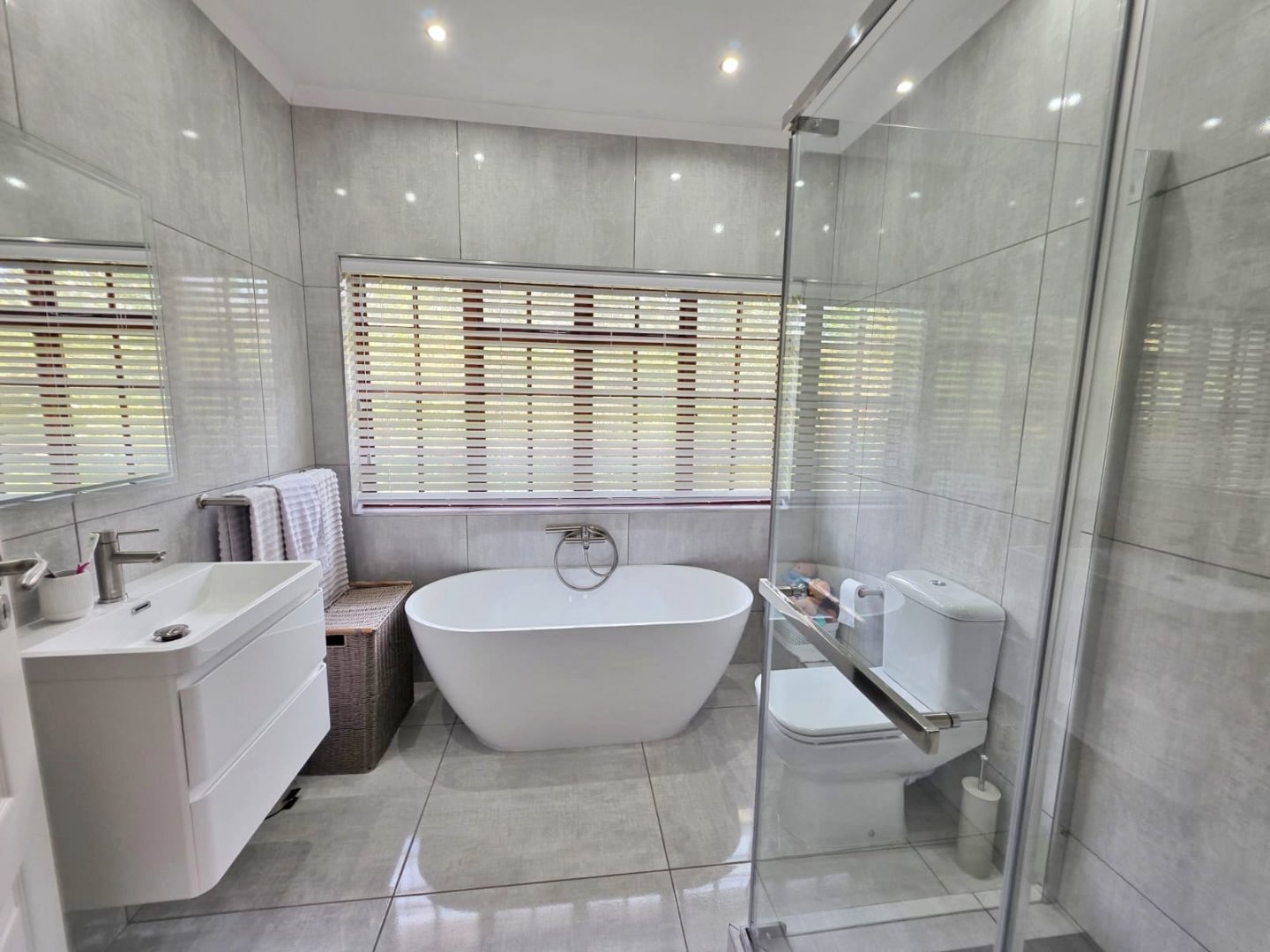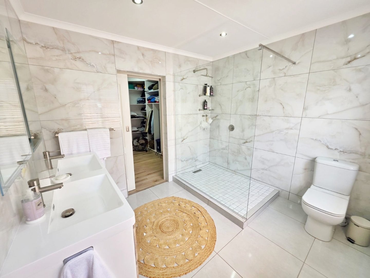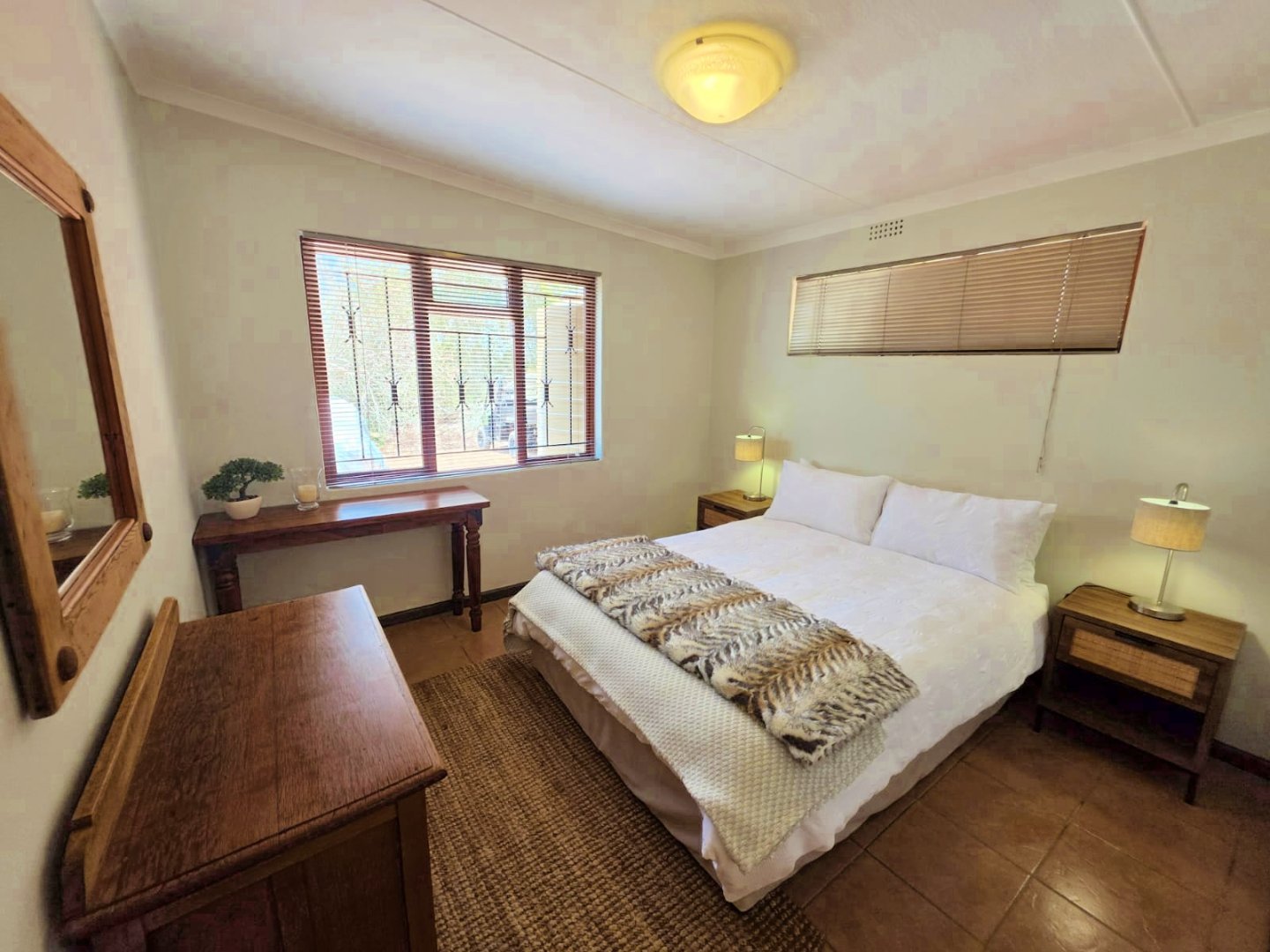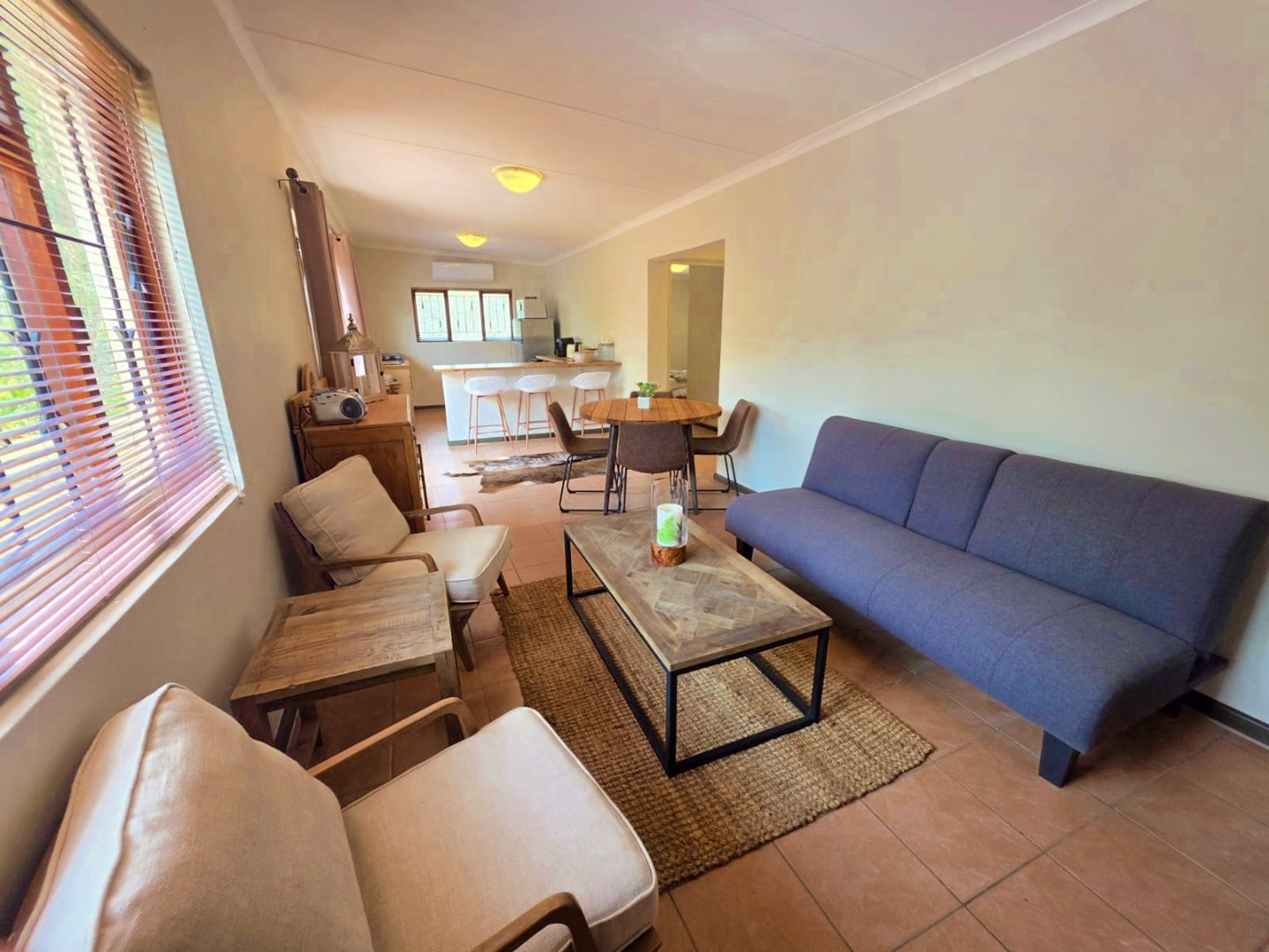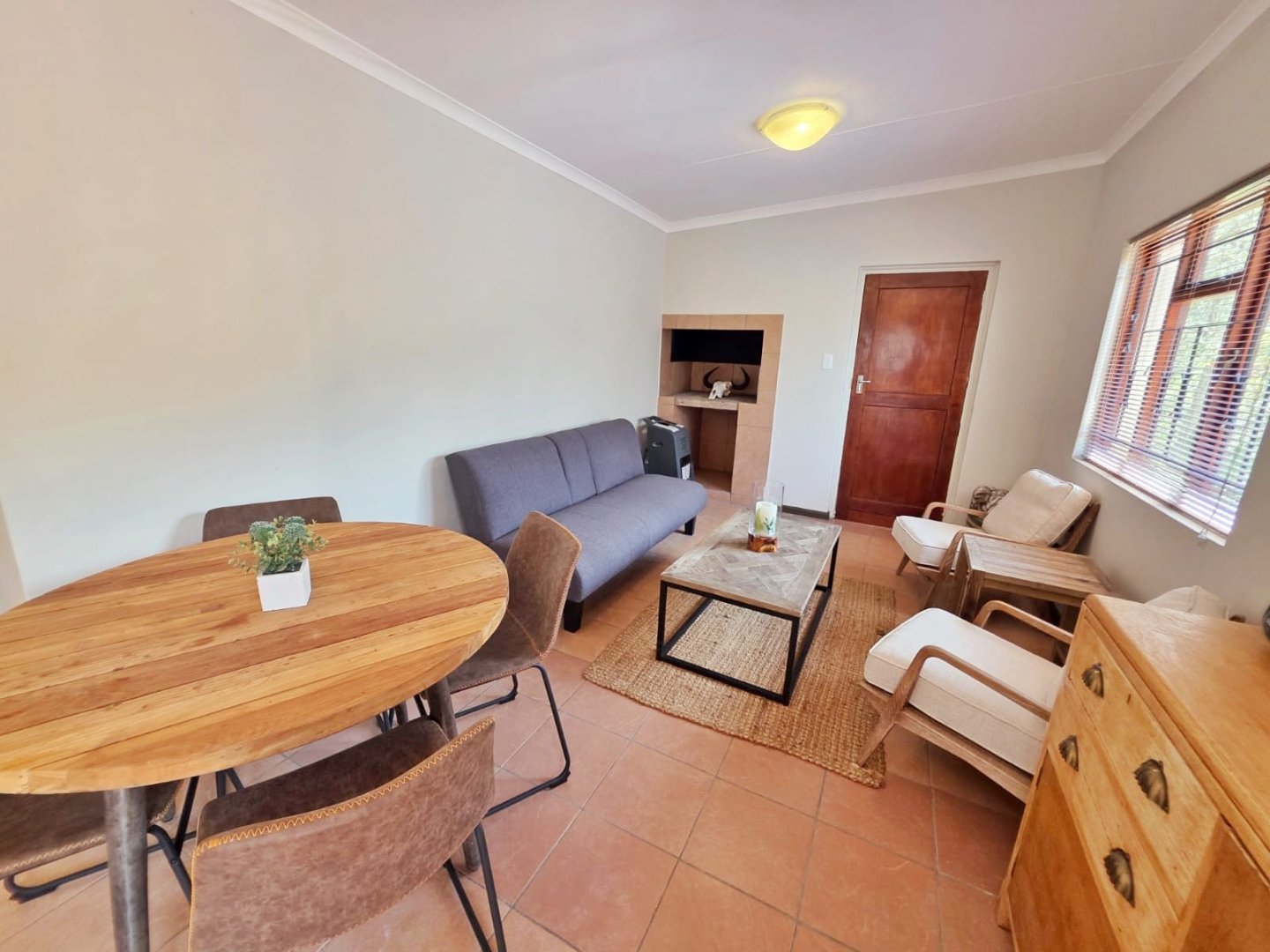 The open-plan lounge exudes warmth and comfort, while a separate TV lounge or study provides a quiet retreat with panoramic garden and forest views. The property is well equipped for modern living, with its own solar power system comprising panels, inverter, and batteries — ensuring energy independence and sustainability. Municipal services are in place, supplemented by an excellent water-harvesting system for added security and eco-conscious living. A triple garage and ample paved parking provide convenience for family and guests alike.