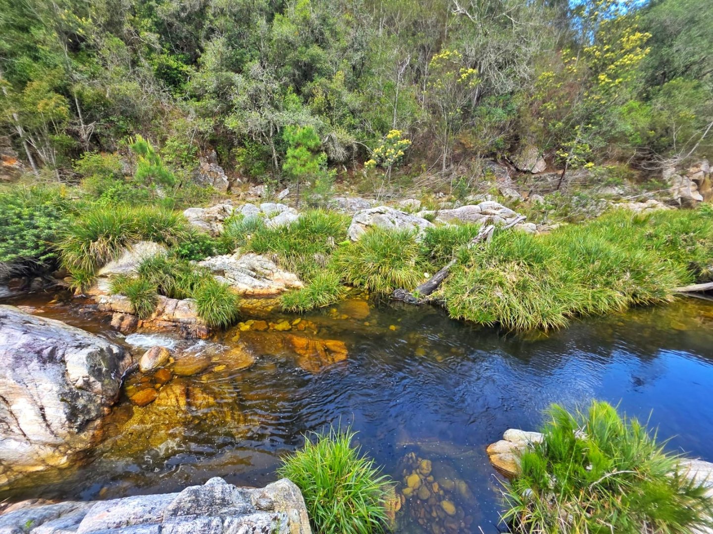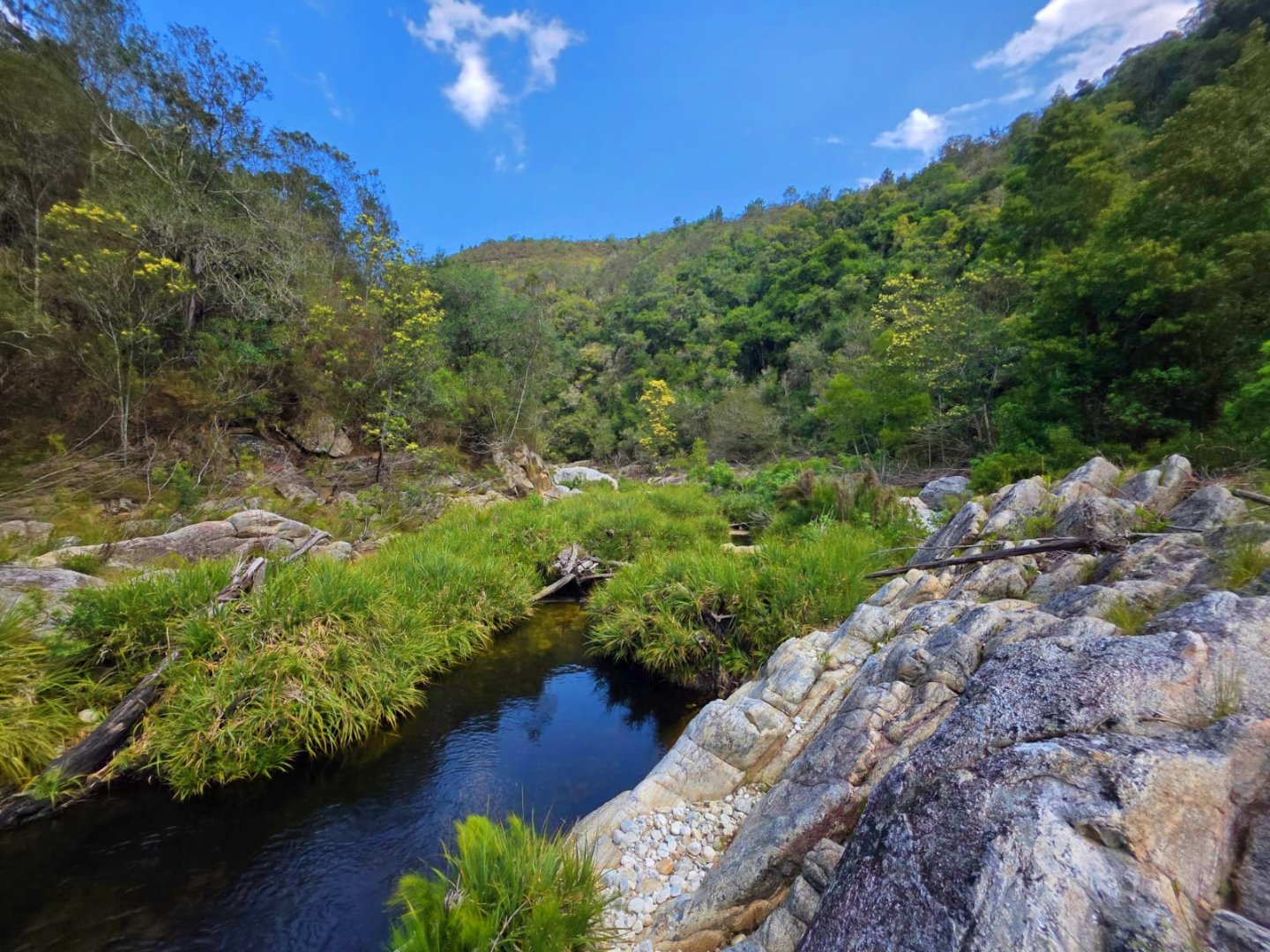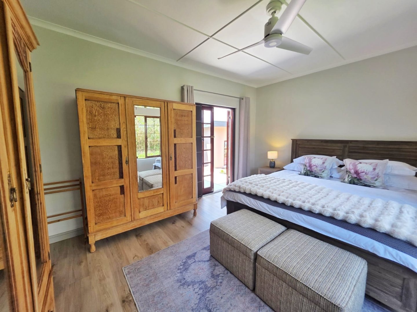 The upper portion of the nearly 10-hectare property is neatly fenced and beautifully maintained, while a paved road meanders down to a fully renovated two-bedroom cottage — ideal for guests, extended family, or income potential — complete with its own paved garden and forest views. Further below, a well-kept gravel road winds through untouched indigenous forest to the river, where secluded swimming holes offer magical spots for summer days and quiet reflection.
