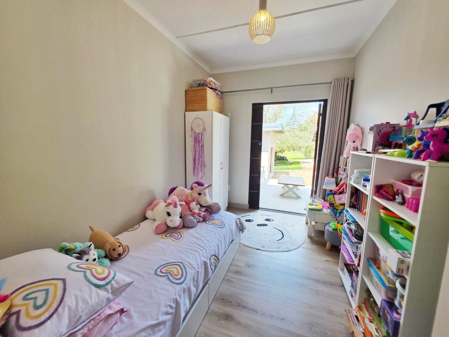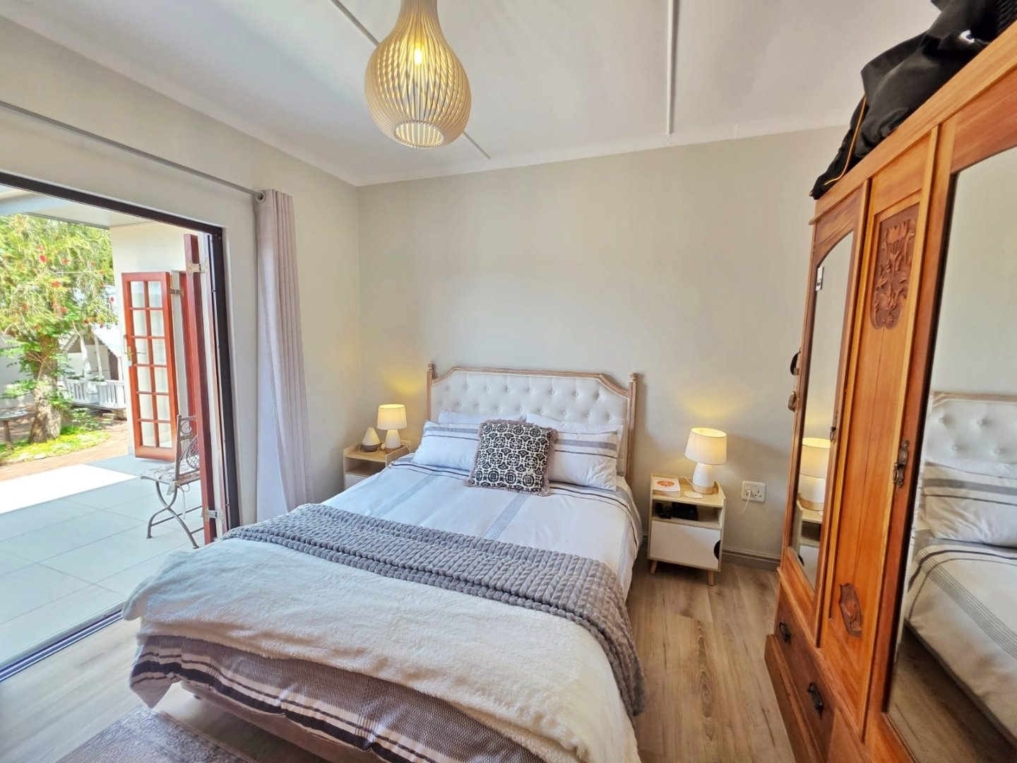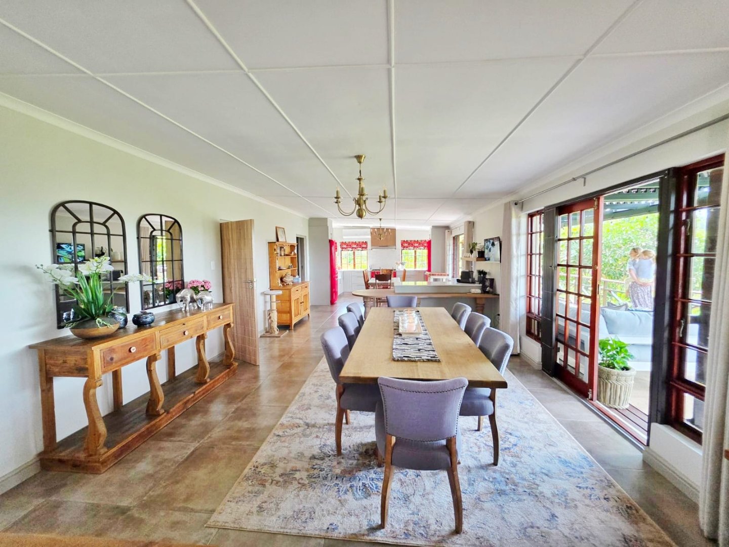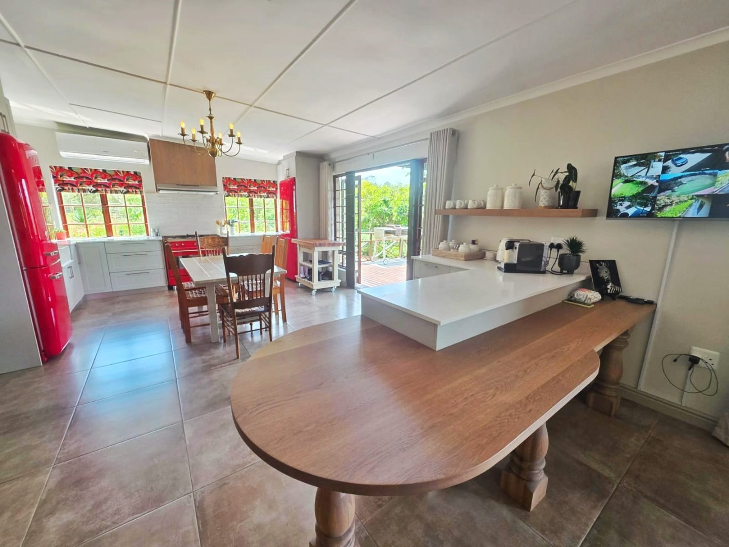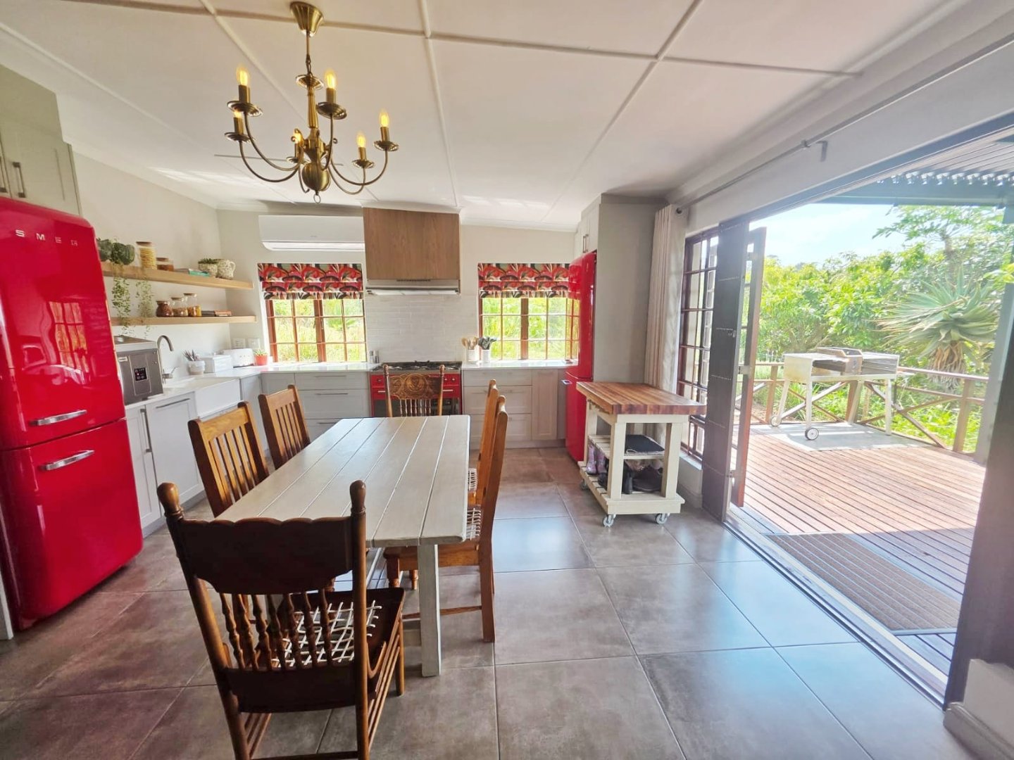 The main farmhouse, warm and inviting, features four spacious bedrooms, two of which are en-suite, while the others share a beautifully finished family bathroom. Each bedroom opens directly onto the gardens, blending the indoors with the natural world and welcoming in the sounds and scents of the wilderness. The heart of the home is its stunning farmhouse kitchen — generous in scale, filled with light, and perfect for gathering. Red SMEG appliances add a modern touch of vibrancy, complementing the rustic charm. Wide double doors open out to a deep front deck that runs the length of the house, offering a seamless flow from kitchen to nature.