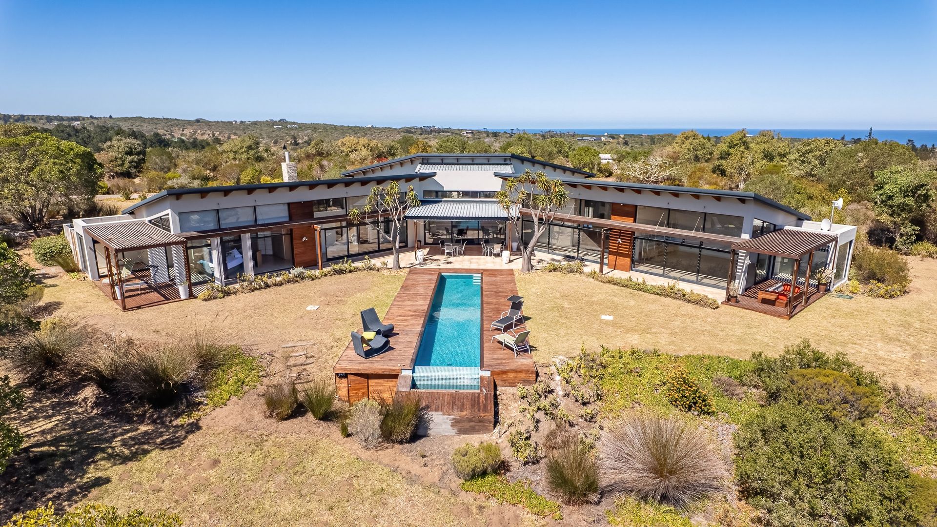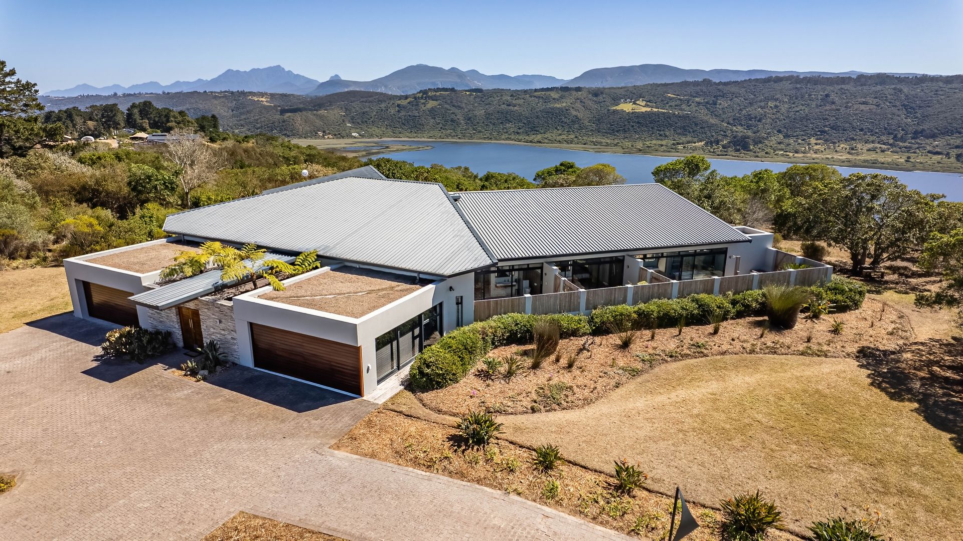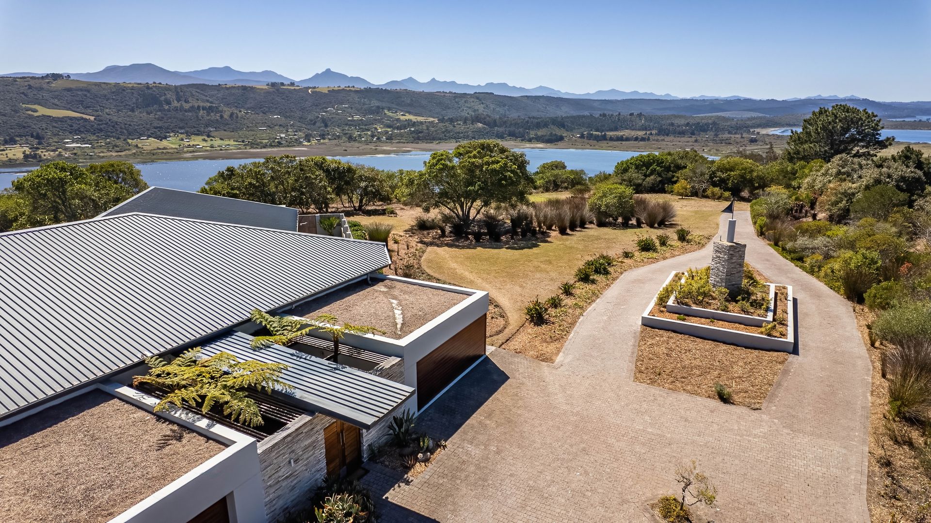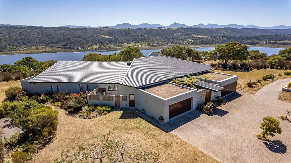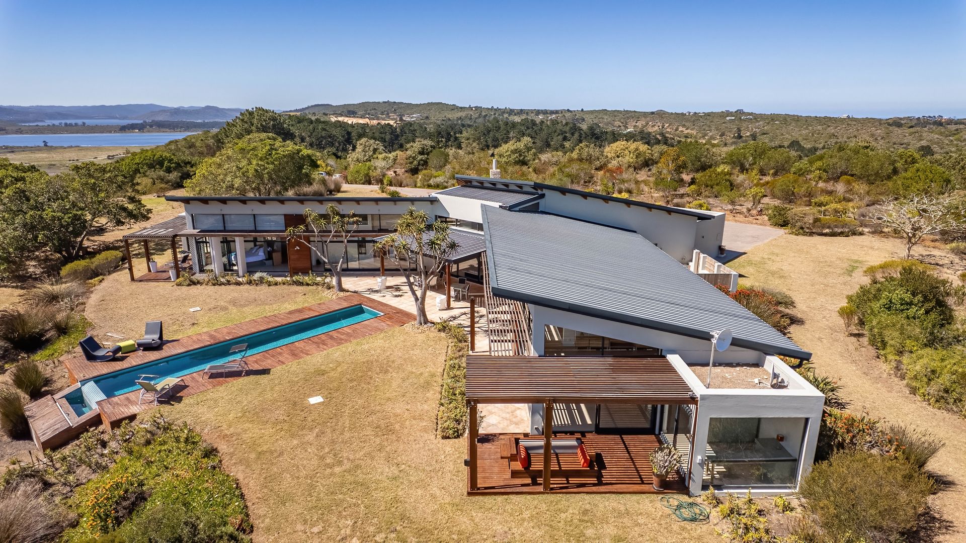 Between Sedgefield and Wilderness lies a truly remarkable 8.7-hectare retreat, where sweeping views of the Outeniqua Mountains and shimmering lakes meet the quiet beauty of natural fynbos. At its heart stands a 540m2 home – elegant, contemporary, and designed to bring nature right into its living spaces.