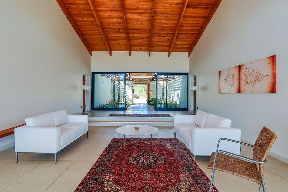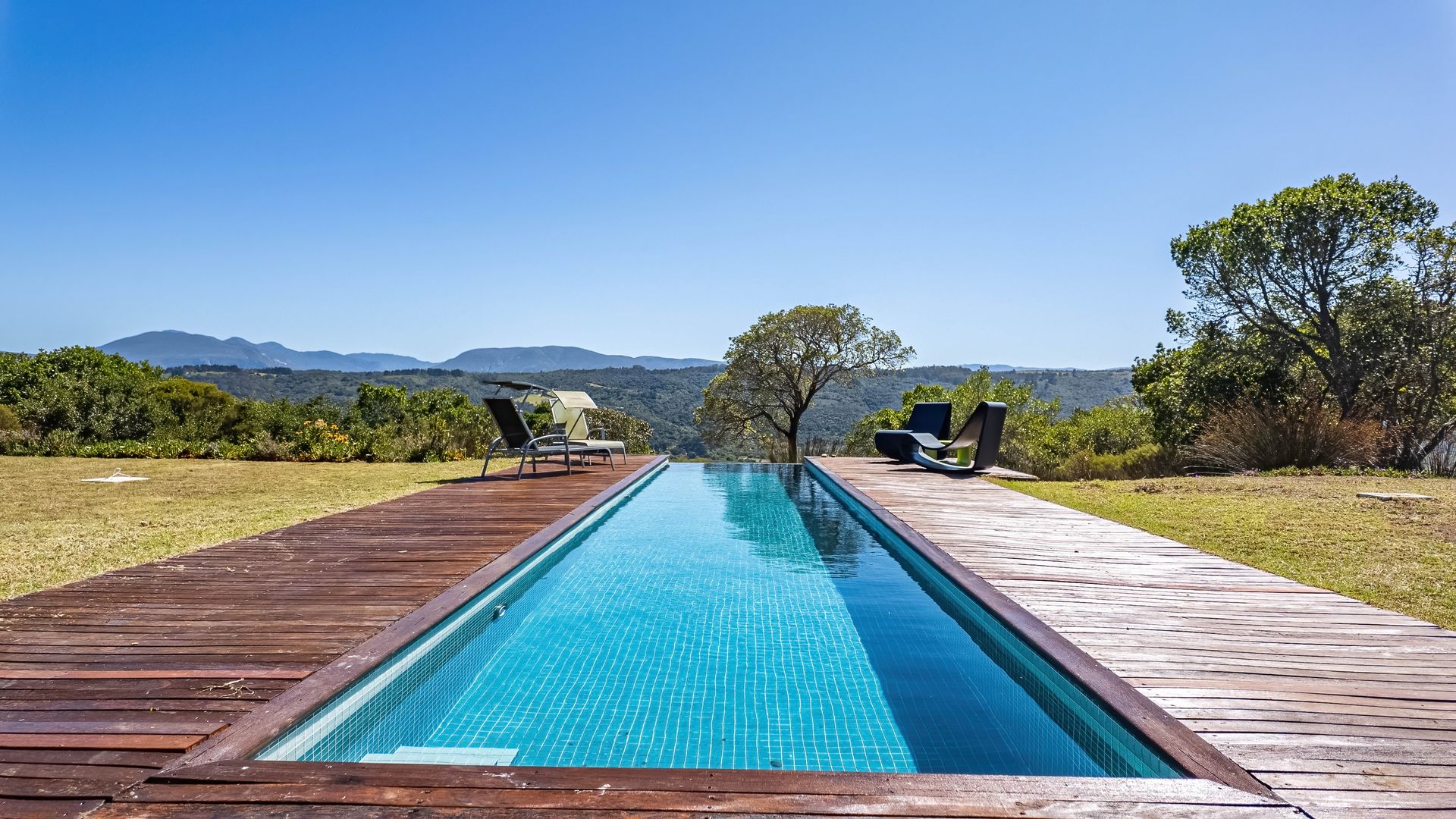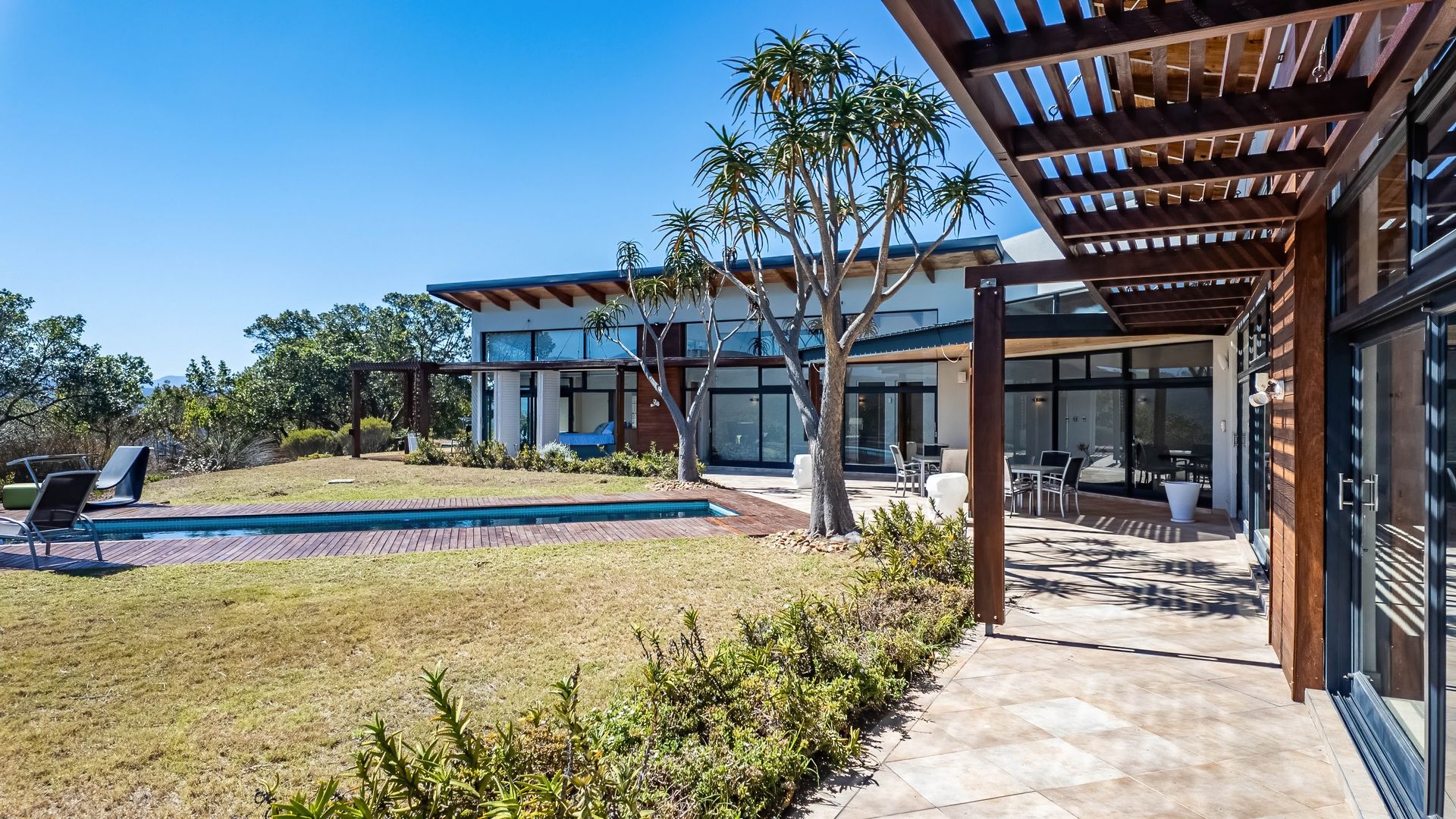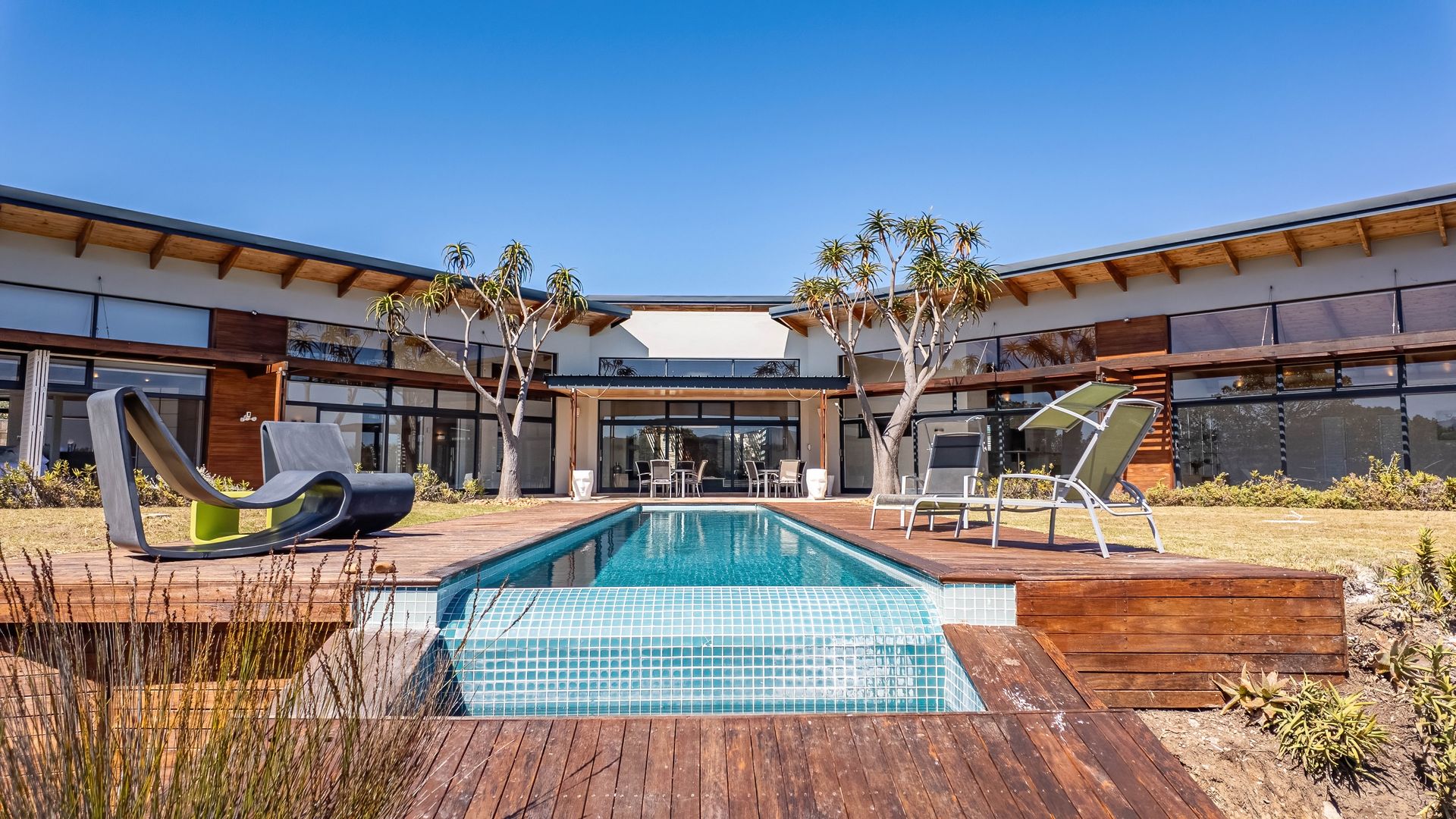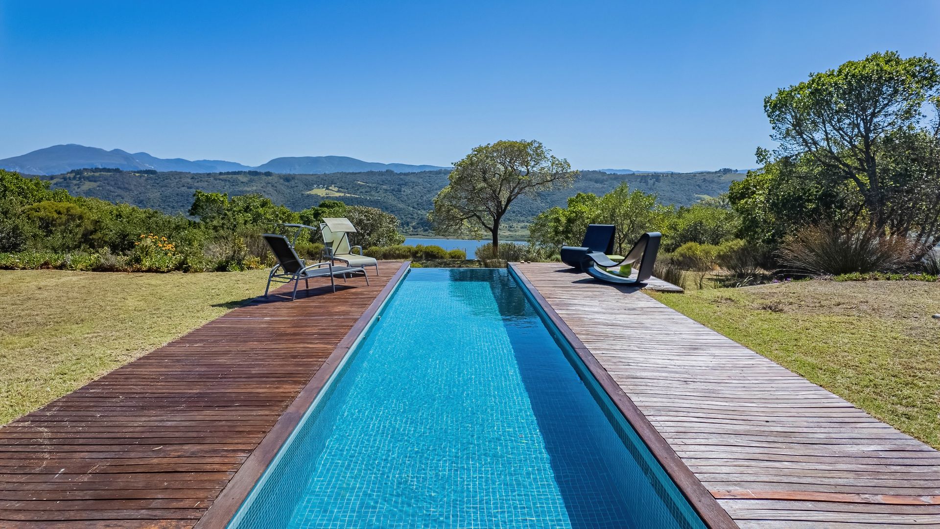Between Sedgefield and Wilderness lies a truly remarkable 8.7-hectare retreat, where sweeping views of the Outeniqua Mountains and shimmering lakes meet the quiet beauty of natural fynbos. At its heart stands a 540m2 home – elegant, contemporary, and designed to bring nature right into its living spaces.