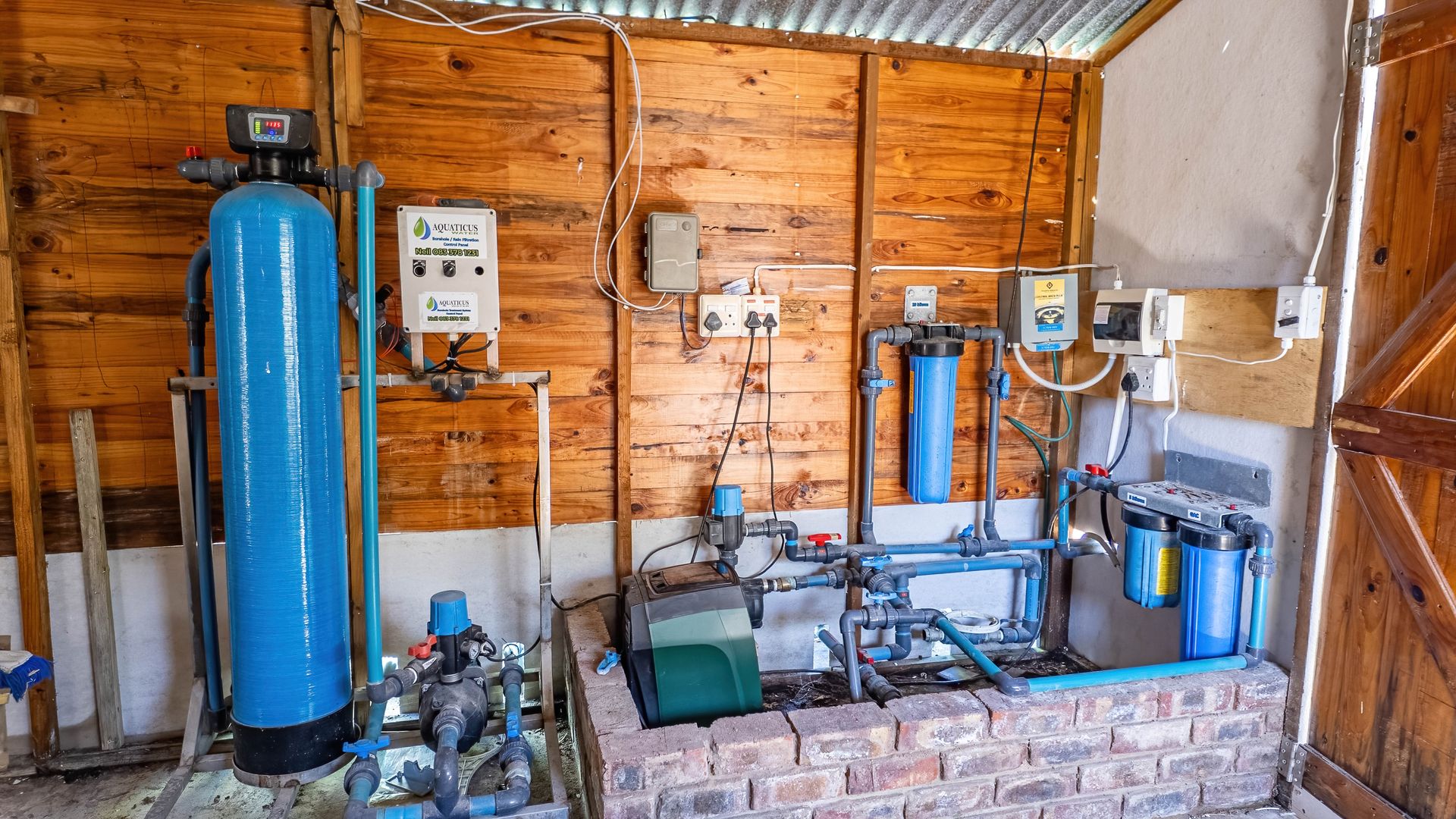 Additional features include a neat staff studio cottage with kitchenette and shower, as well as a staff toilet and basin outside the laundry courtyard. A pump house with tanks and filtration neatly manages the water supply. The property is securely accessed by two gates – the first automated entrance from the N2, and the second leading into the fenced two-hectare homestead area.