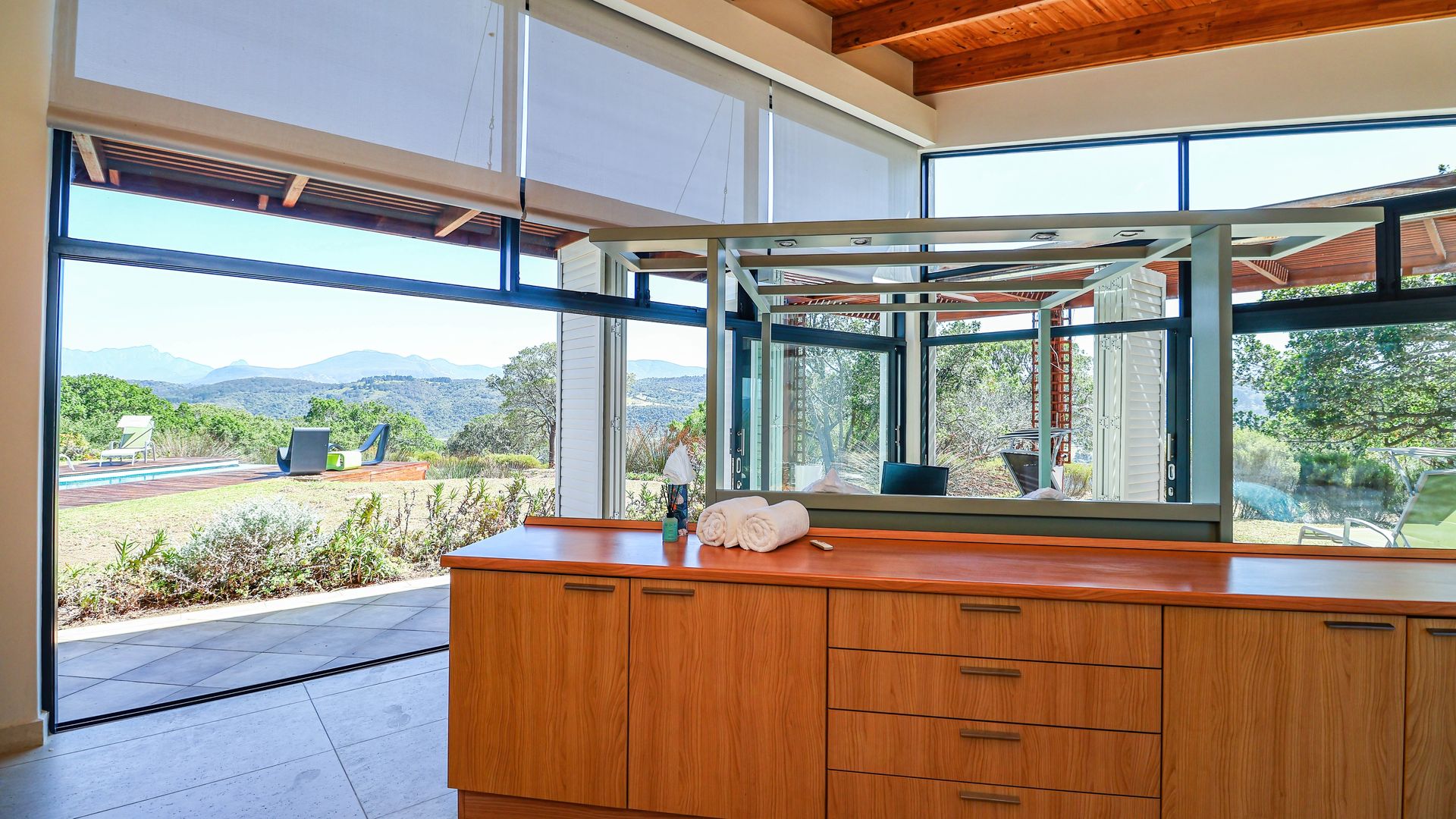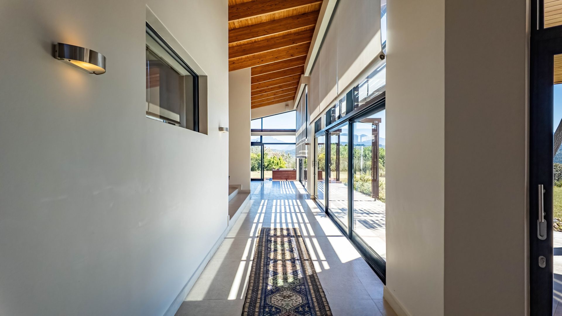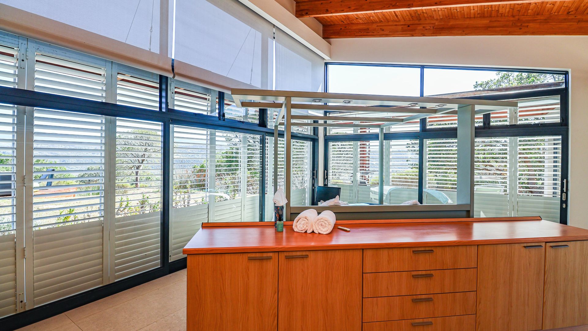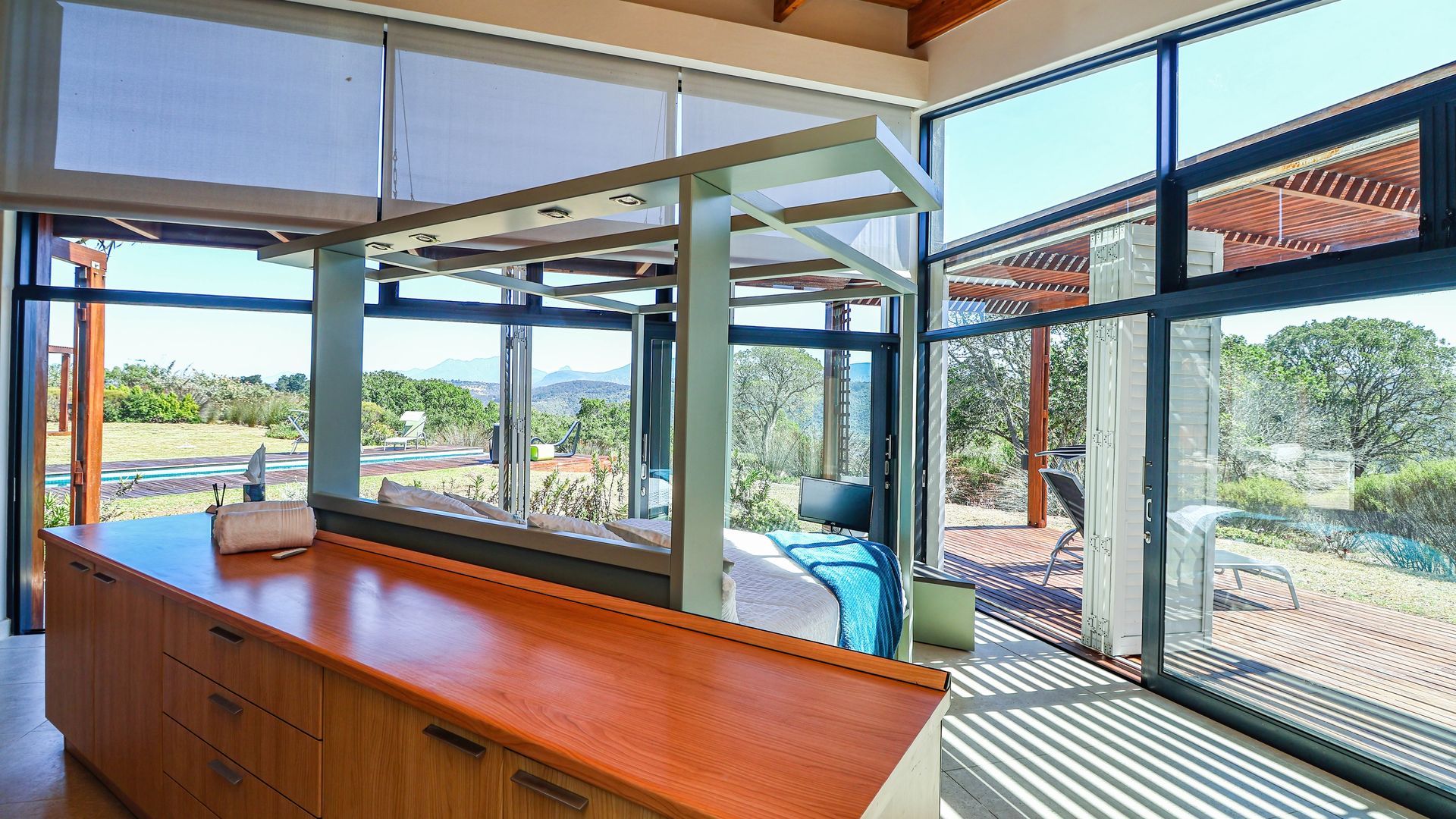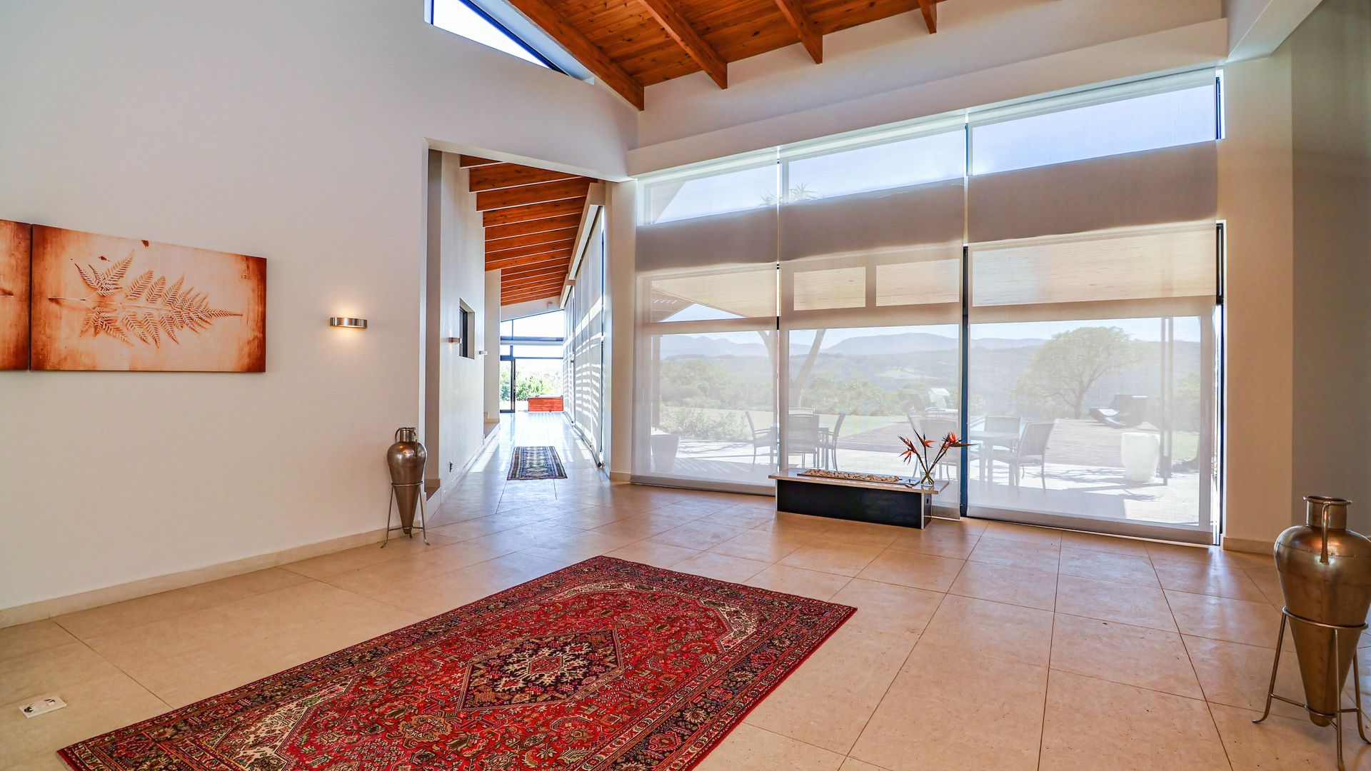 Every detail has been carefully chosen for comfort and convenience. Granite floor tiles with underfloor heating run throughout the house. Expansive windows draw in the northern sun, while motorized blinds offer effortless privacy at the touch of a button. The indigenous gardens are water-wise yet lush, supported by an automated irrigation system and advanced water infrastructure – from a borehole with full filtration to a large rainwater reservoir and reverse osmosis system inside the home.