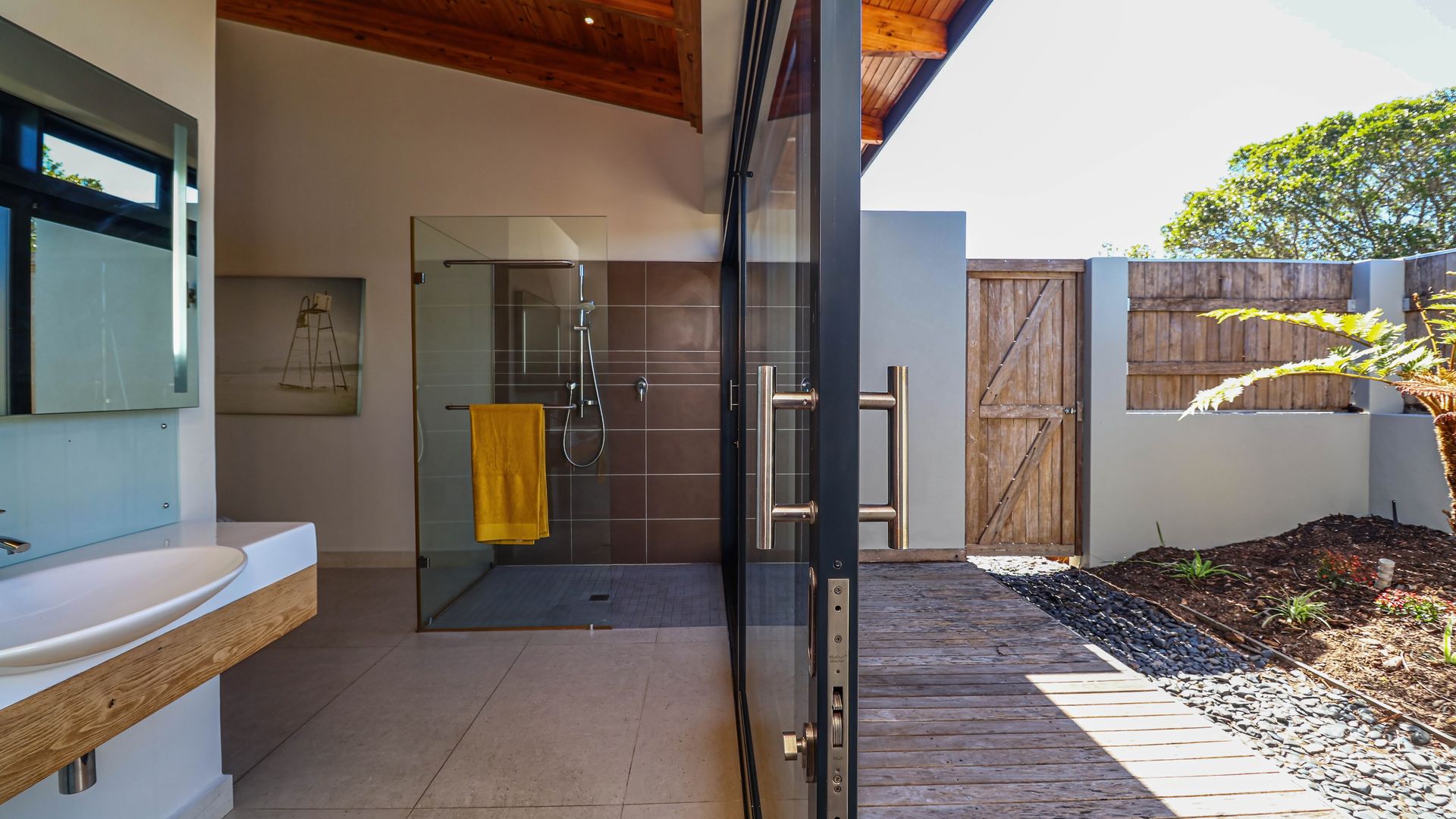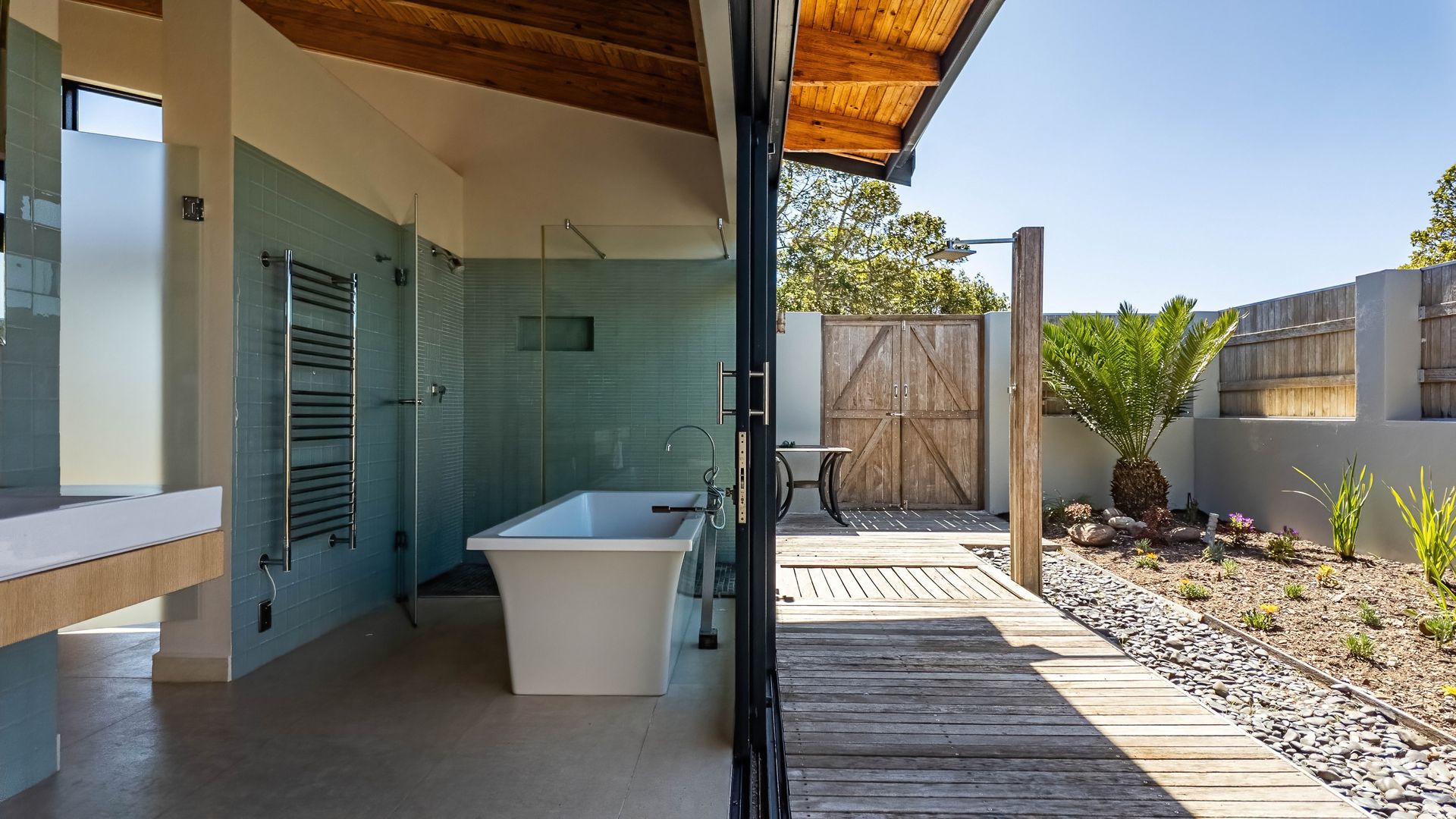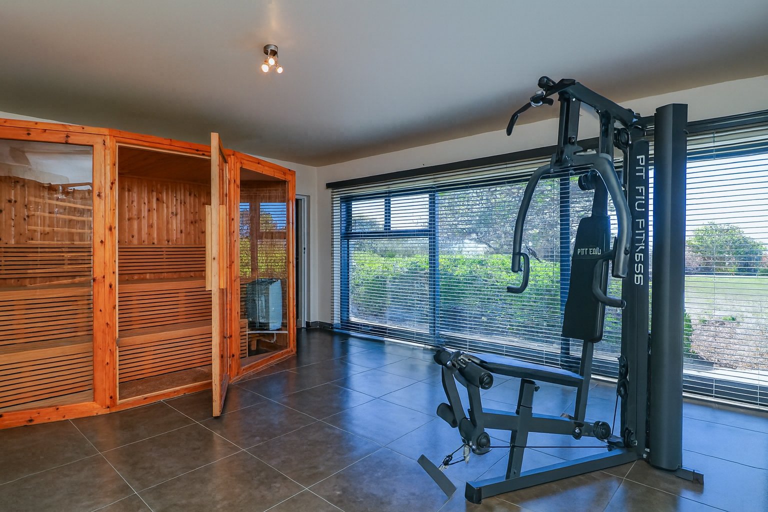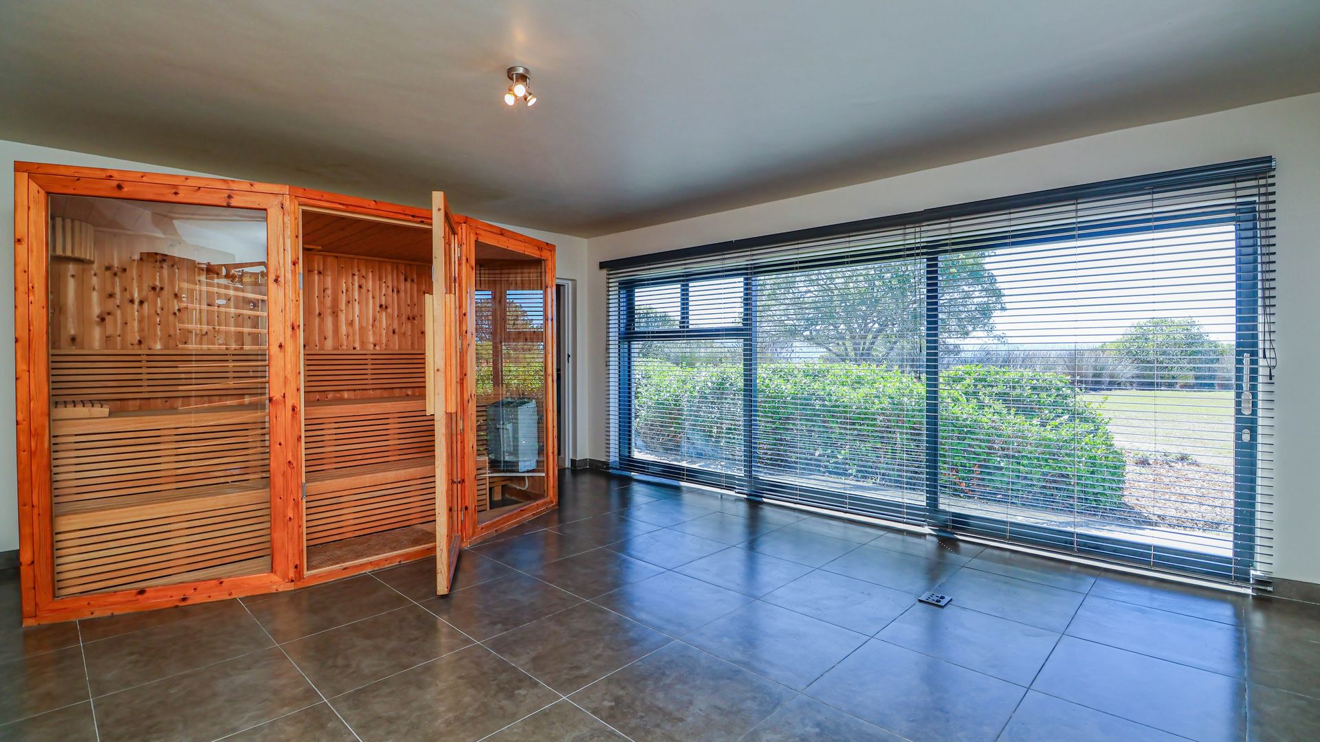 The house is thoughtfully divided into two wings. On the eastern side, you’ll find three en-suite bedrooms, each with its own private courtyard garden. The main suite is a sanctuary of its own, with a full bathroom, heated towel rails, sliding doors onto the courtyard, and even a secluded outdoor shower. Imagine mornings spent with the doors open, sunlight streaming in, and the scent of fynbos all around. A gym with sauna, its own bathroom, and direct garden access make wellness part of everyday living, while a nearby wine cellar keeps your collection at the perfect temperature. For plant lovers, a built-in greenhouse sits just off the main bedroom – an ideal space for orchids, exotics, or year-round greenery.