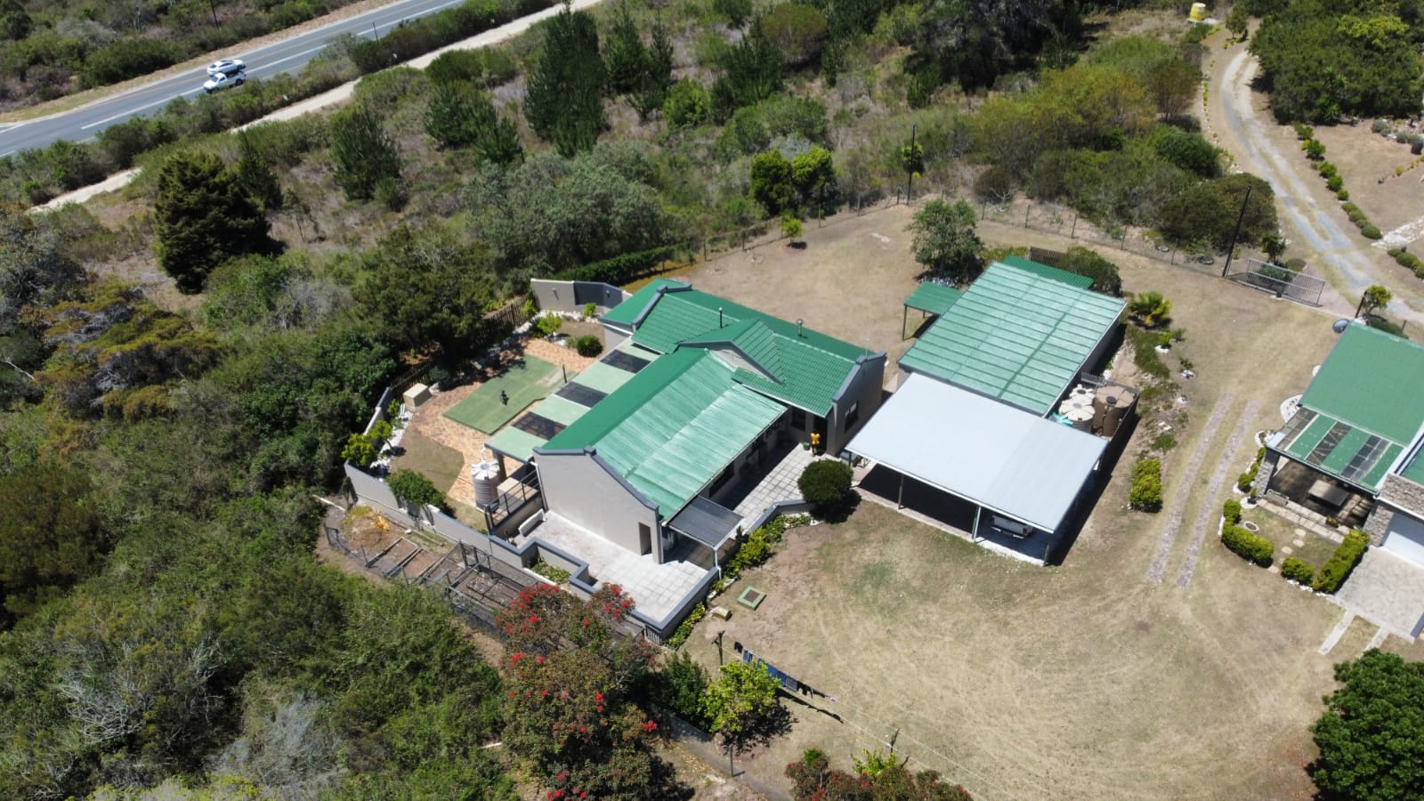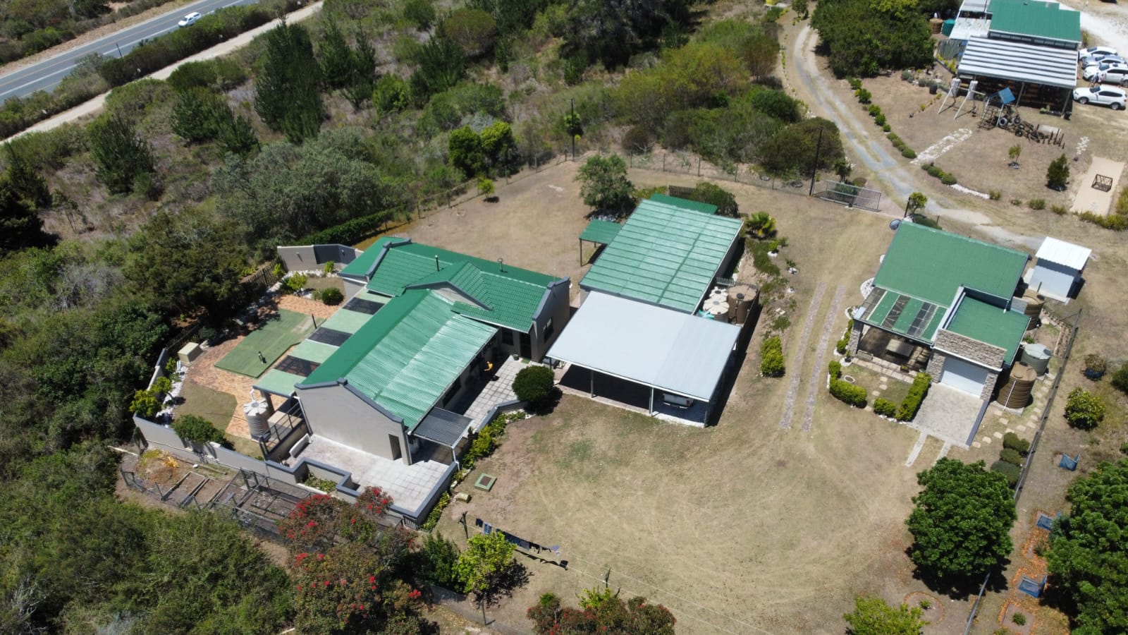 In addition to the commercial offering, the property comprises two well-appointed residential dwellings. The north-facing main residence of approximately 168 sqm features three bedrooms, two bathrooms, a generous undercover patio and a combustion fireplace. A large garage accommodating up to three vehicles incorporates a substantial workshop, complemented by additional carport parking. The separate ±100 sqm two bedroom cottage includes an undercover patio and a single garage with direct access, making it well suited to rental income or extended family use.
