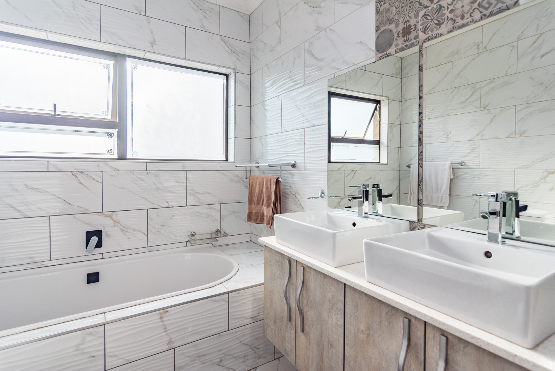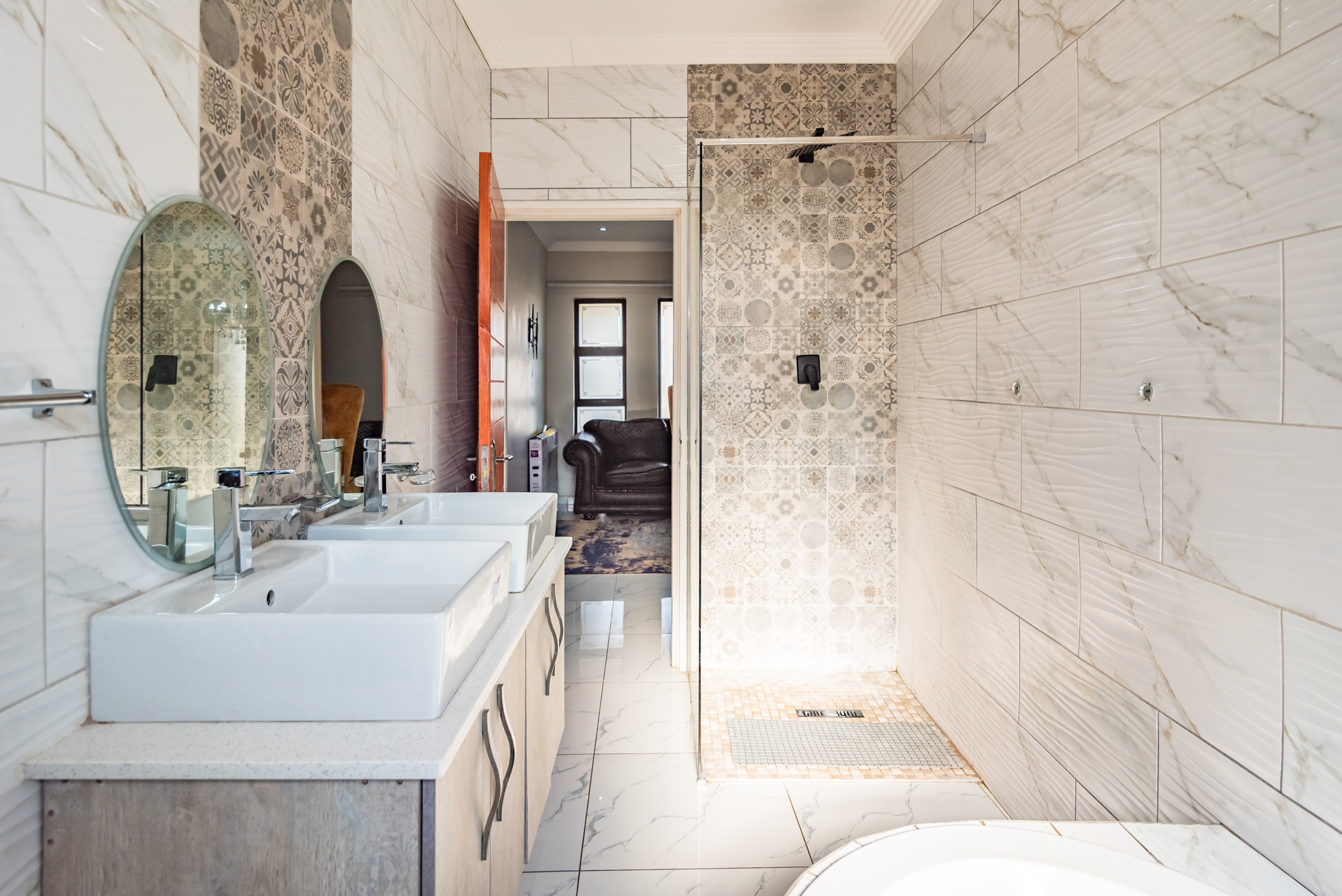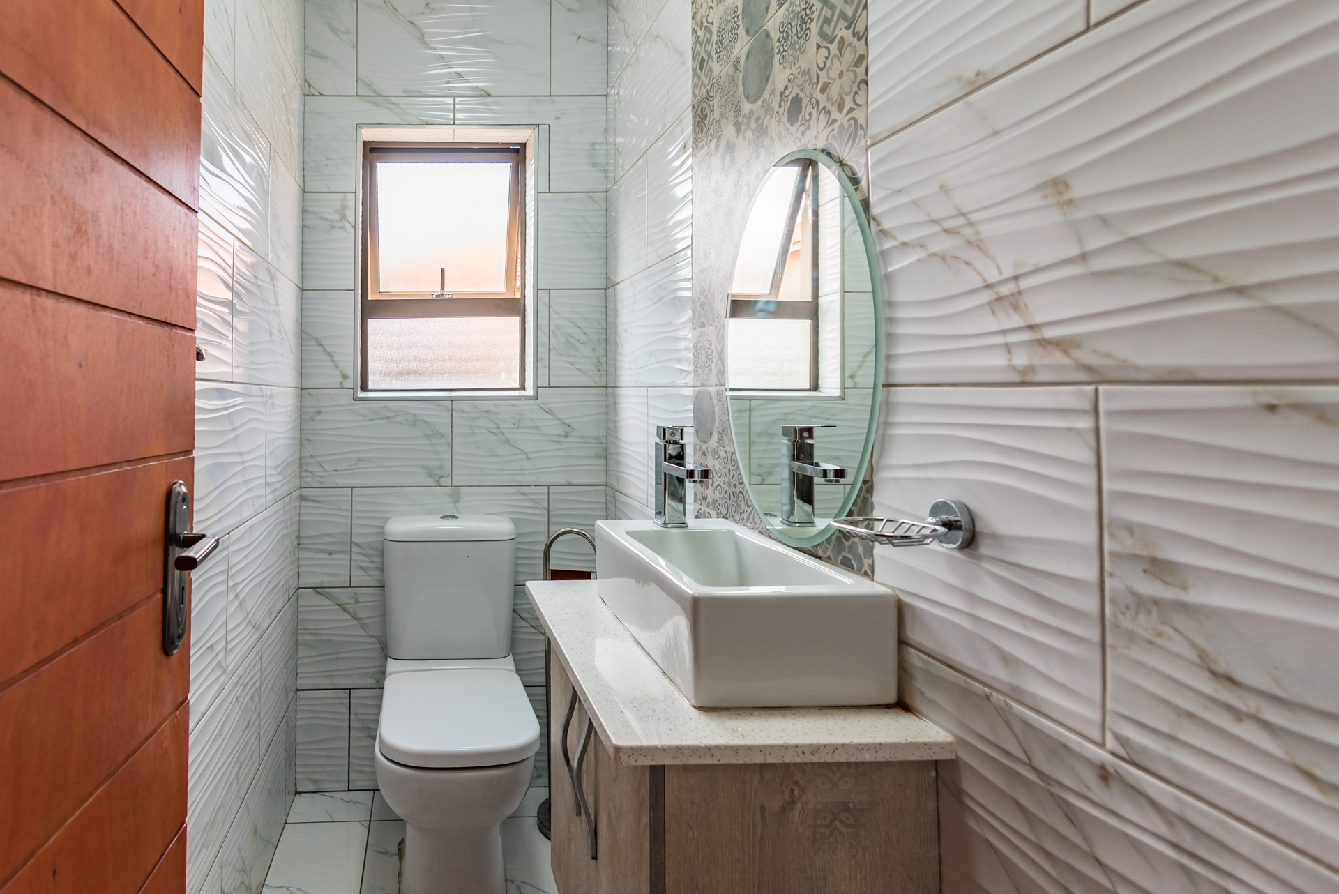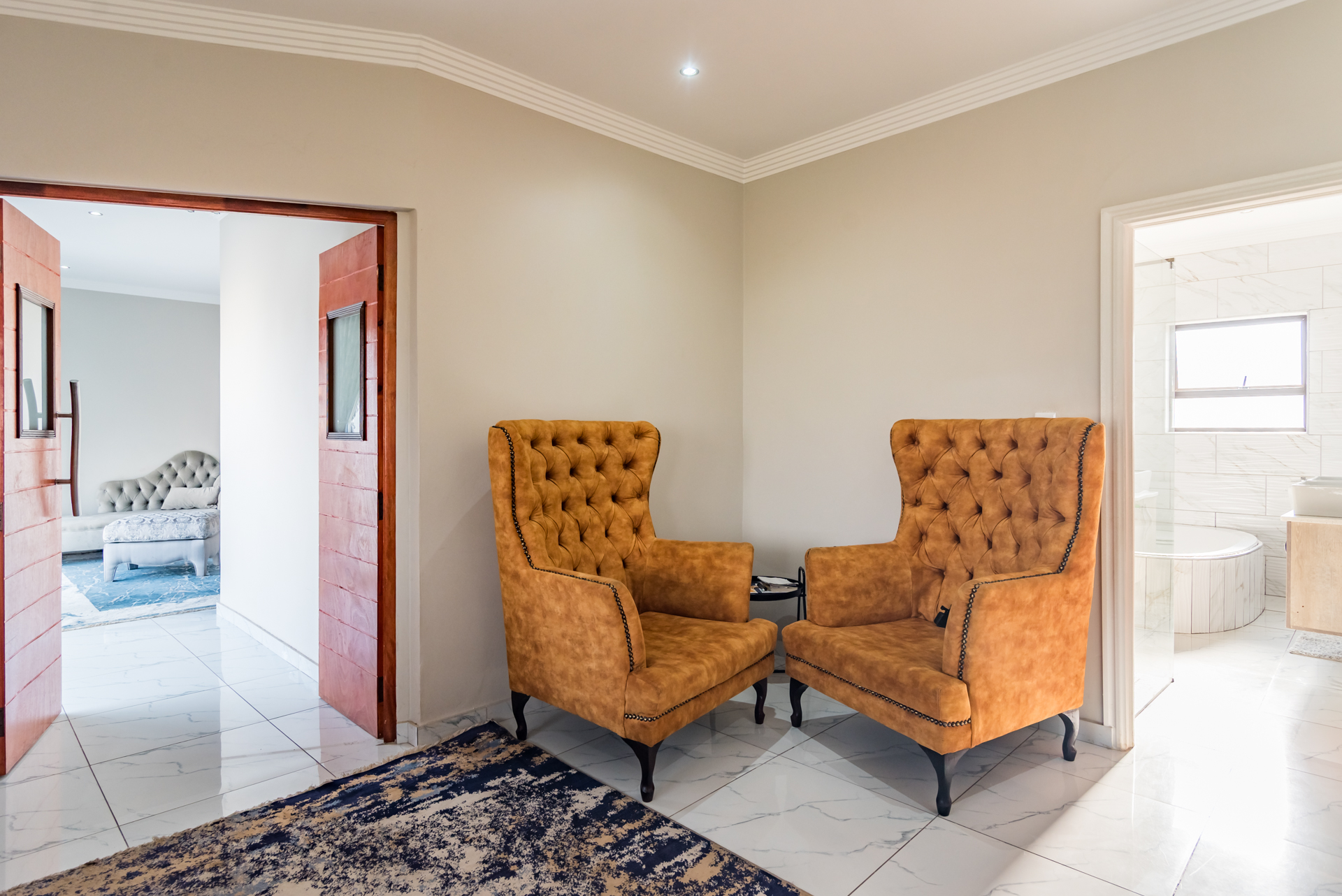 The residence offers three spacious bedrooms, all fitted with built-in cupboards. The main bedroom features an en-suite bathroom, while a full family bathroom—comprising a bathtub, shower, basin, and toilet—services the remaining bedrooms. A separate guest toilet adds further practicality.