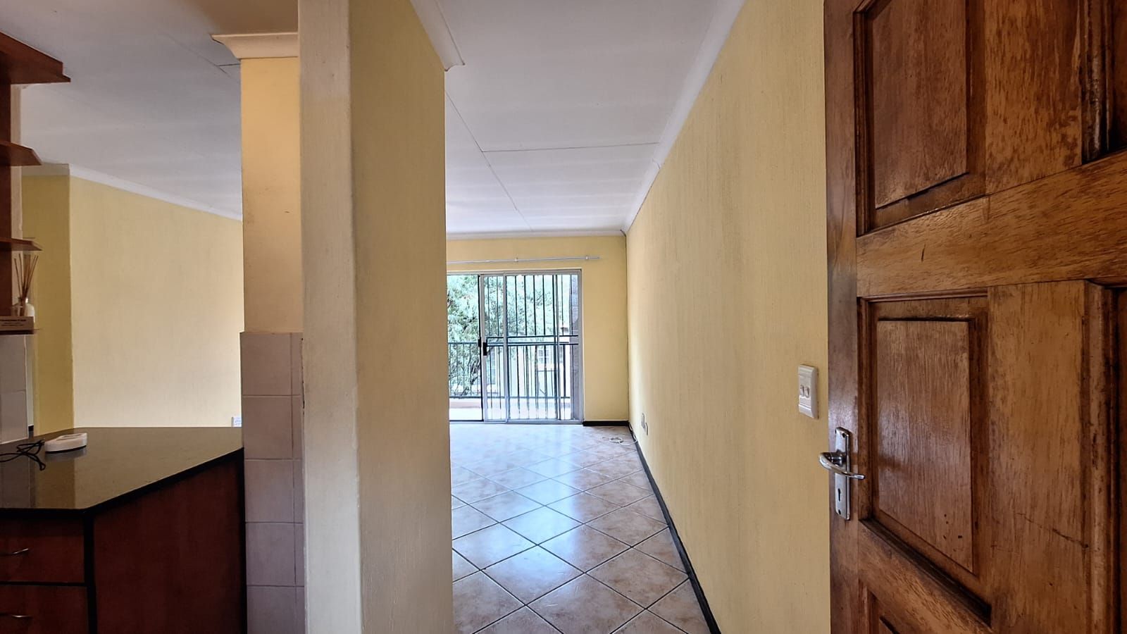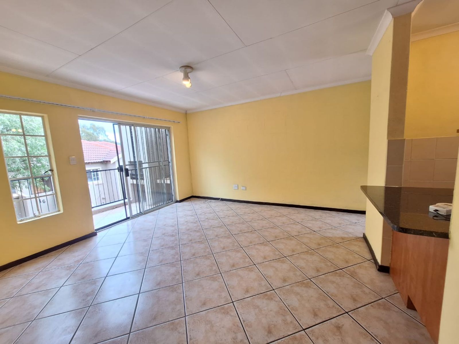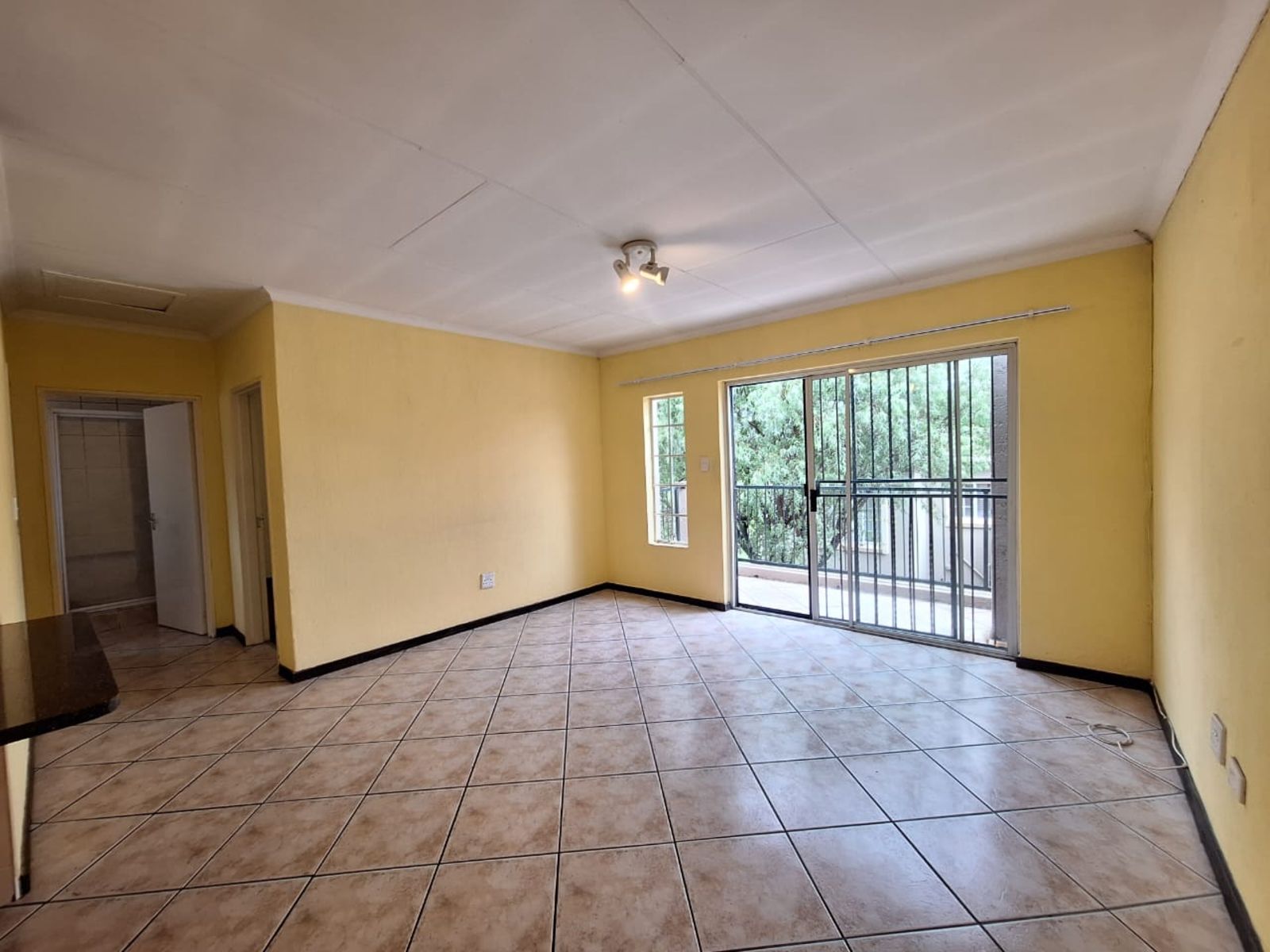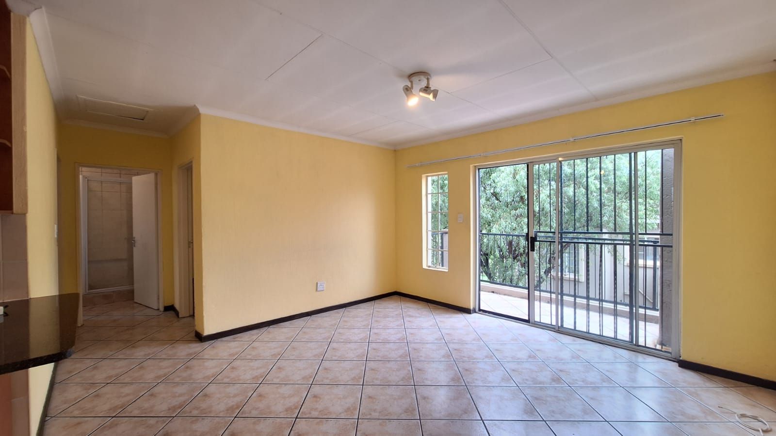 The tiled living area flows toward a sliding door that opens onto a private balcony — complete with a built-in braai and leafy views. Ideal for quiet evenings or weekend unwinding.