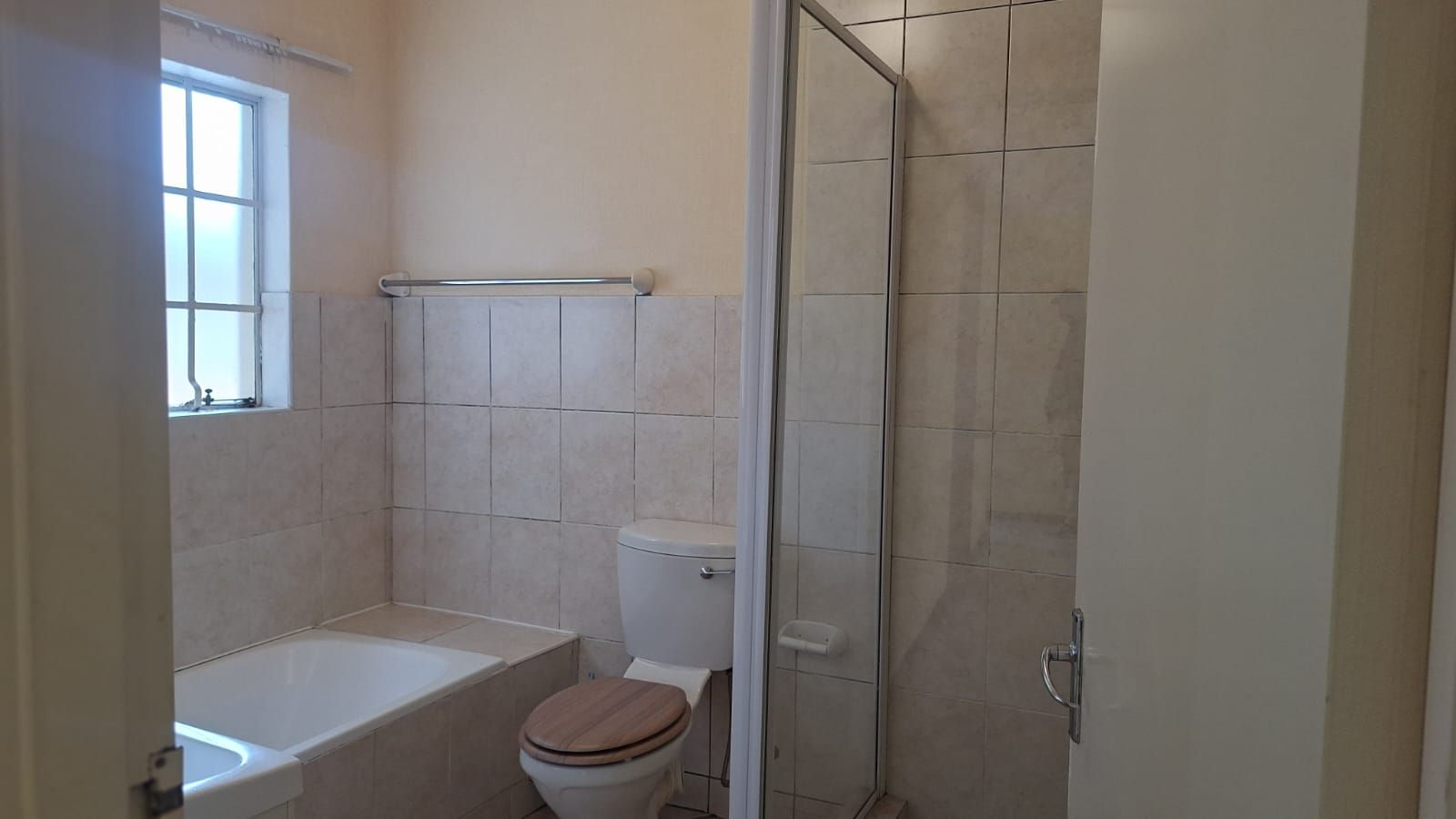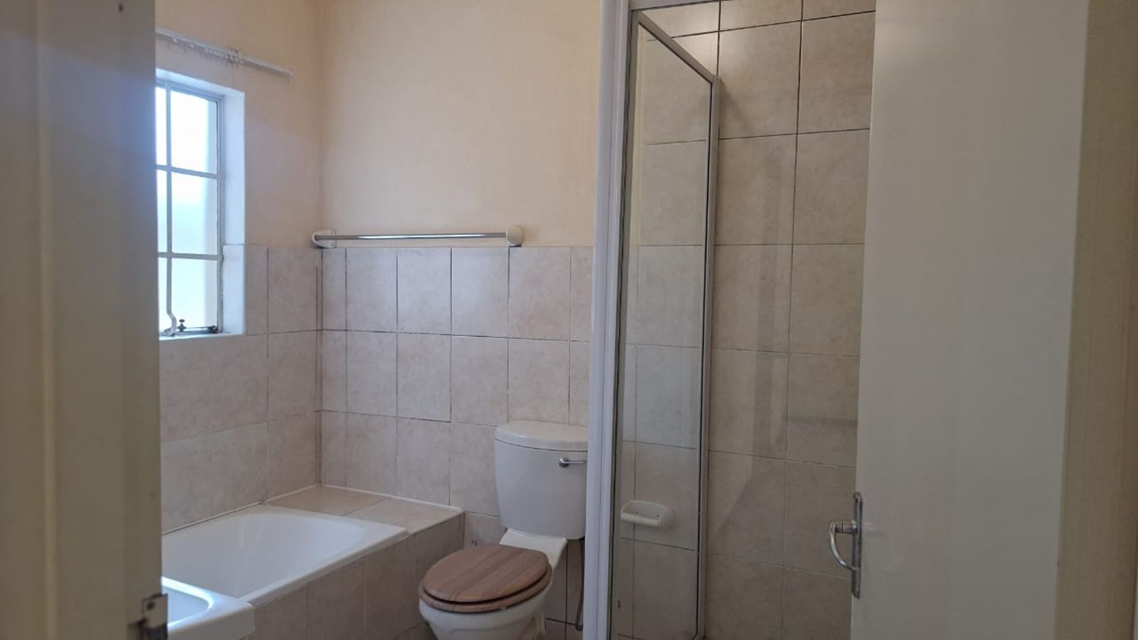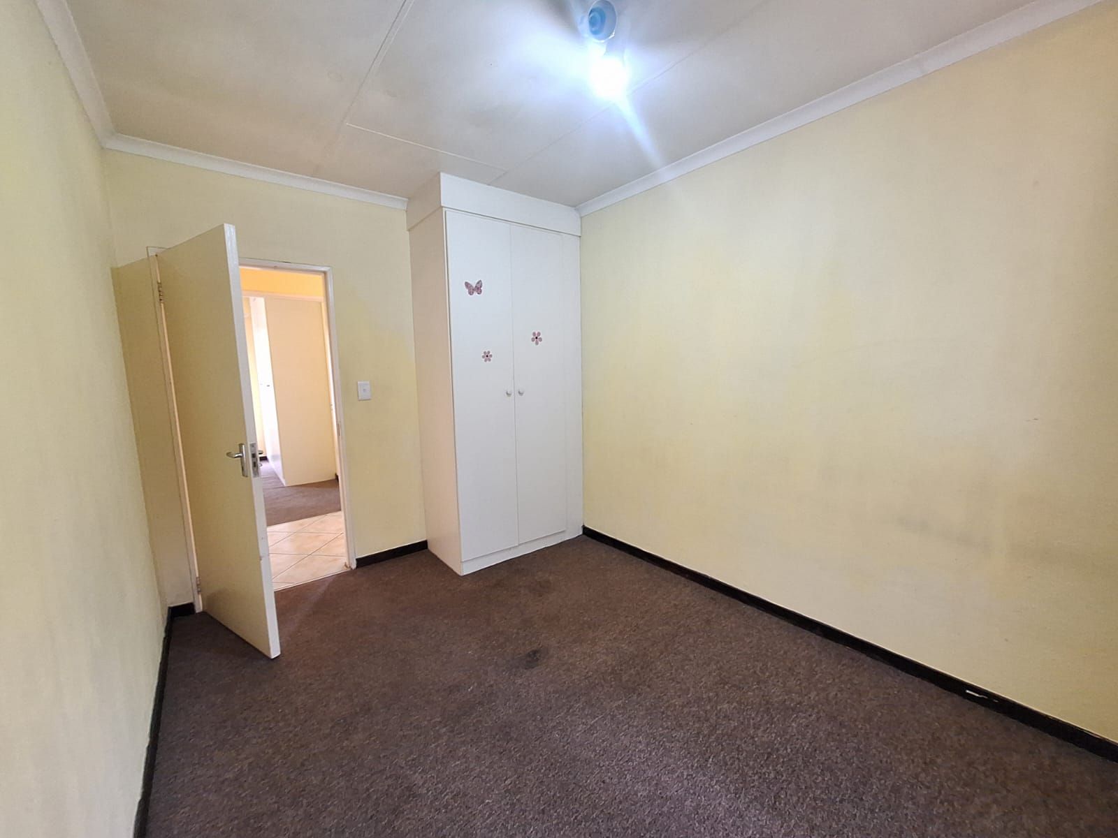 Both bedrooms are carpeted for comfort, with built-in cupboards and soft natural tones. The full bathroom includes a bath, shower, toilet, and basin — clean and functional.
