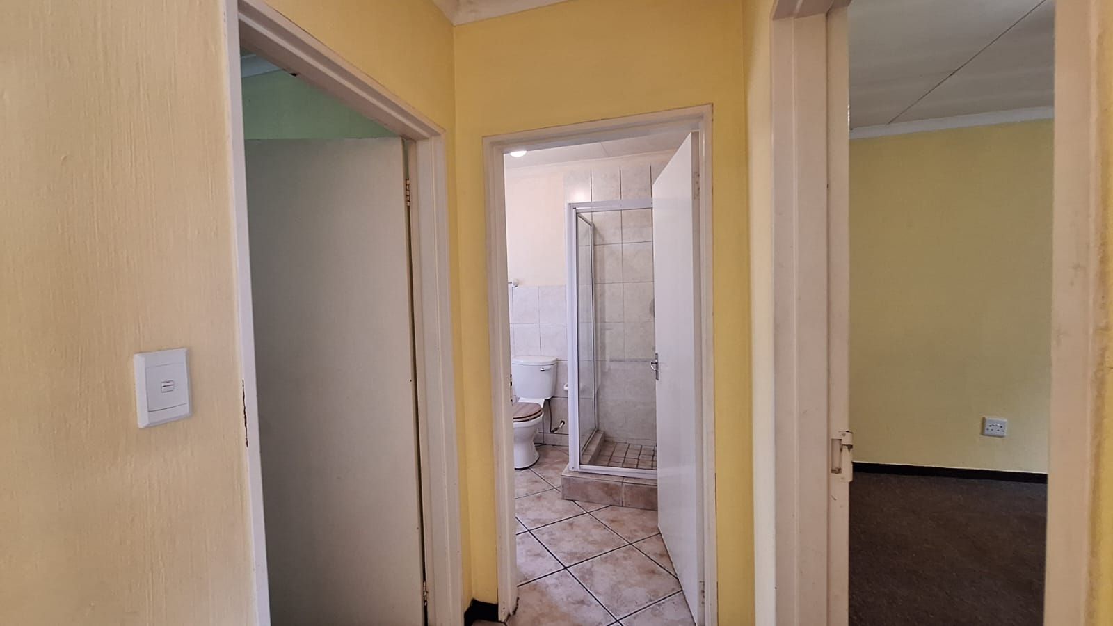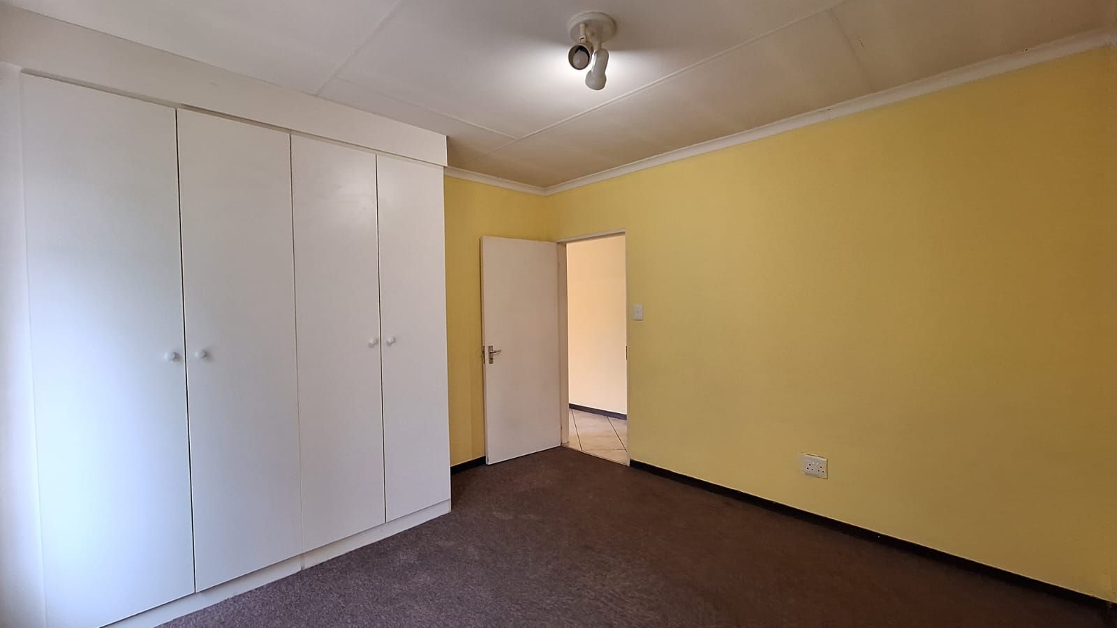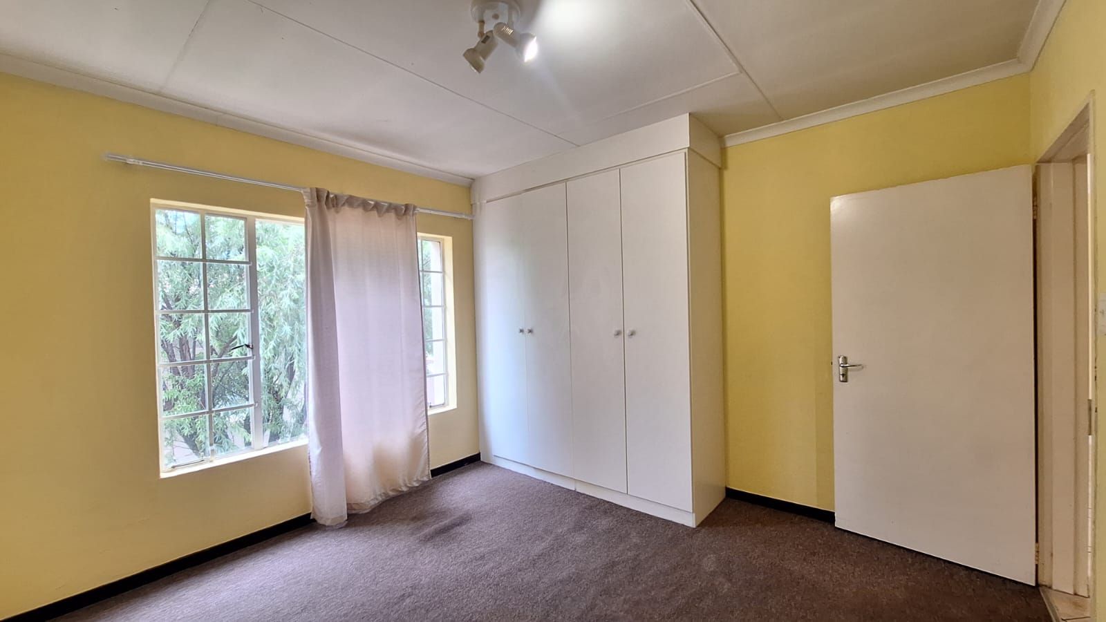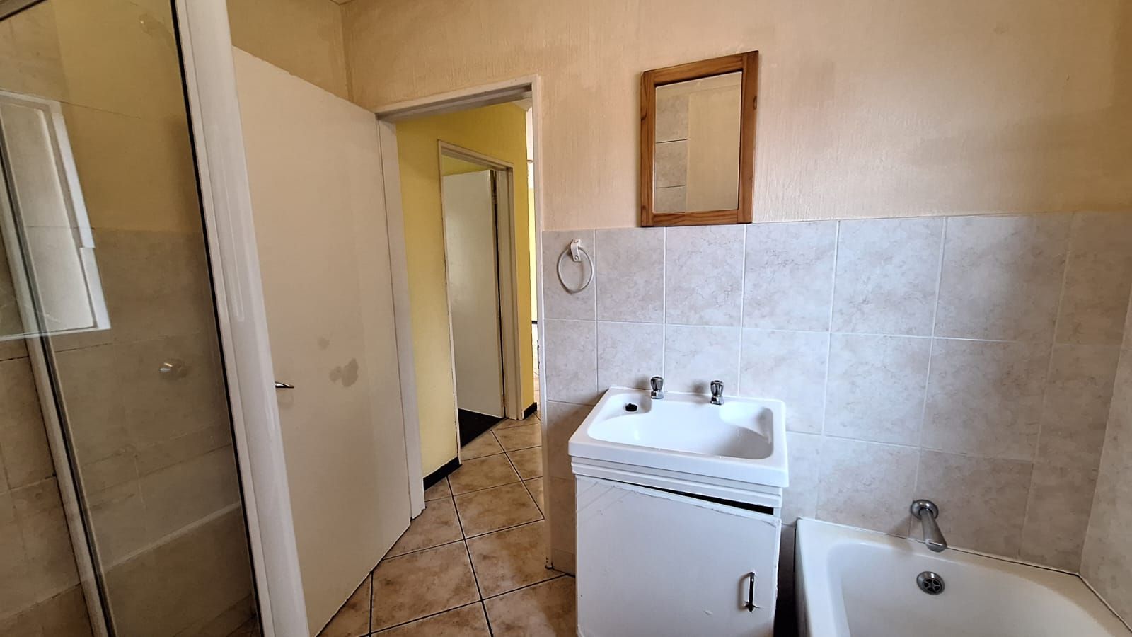 Both bedrooms are carpeted for comfort, with built-in cupboards and soft natural tones. The full bathroom includes a bath, shower, toilet, and basin — clean and functional.