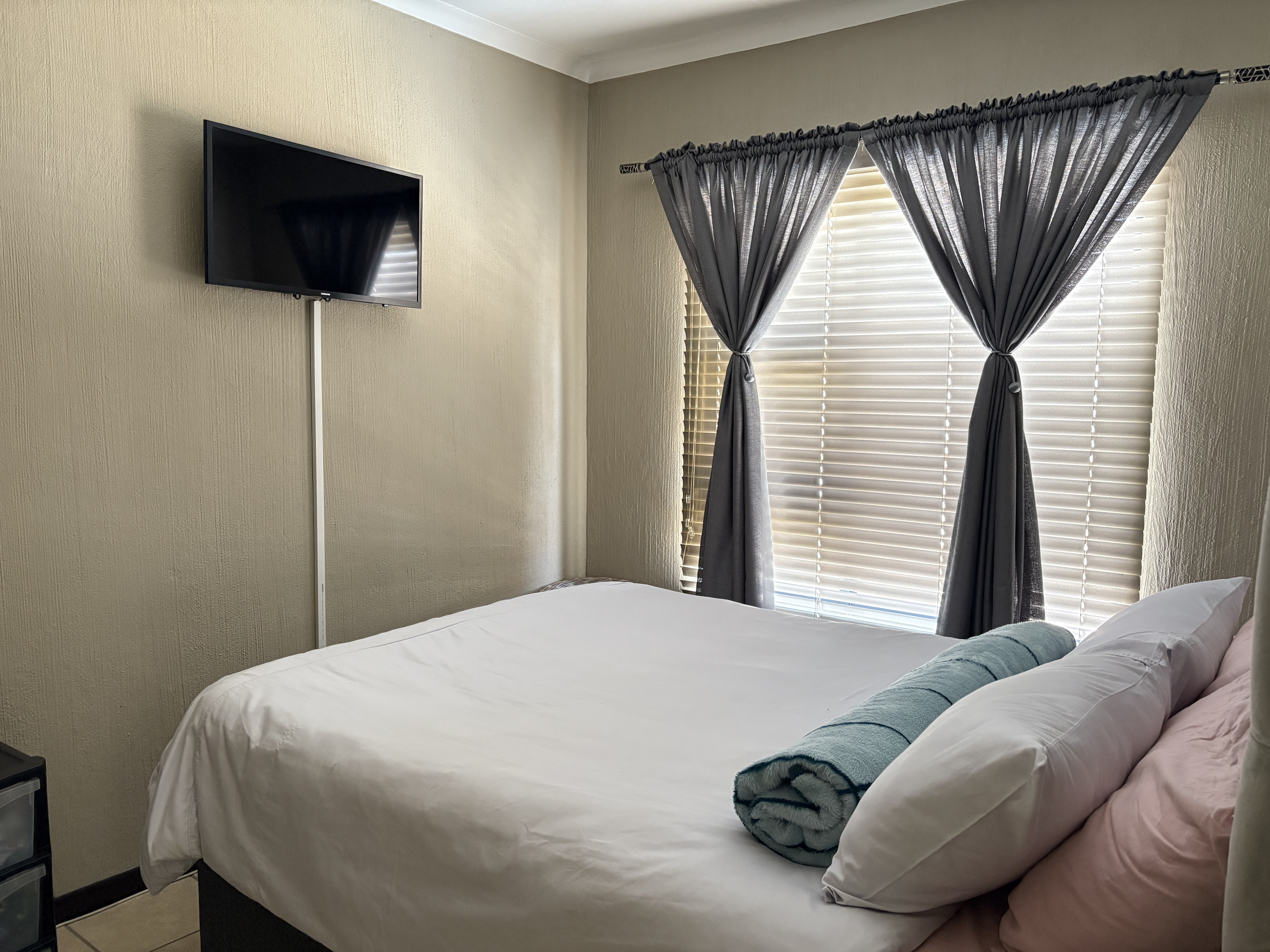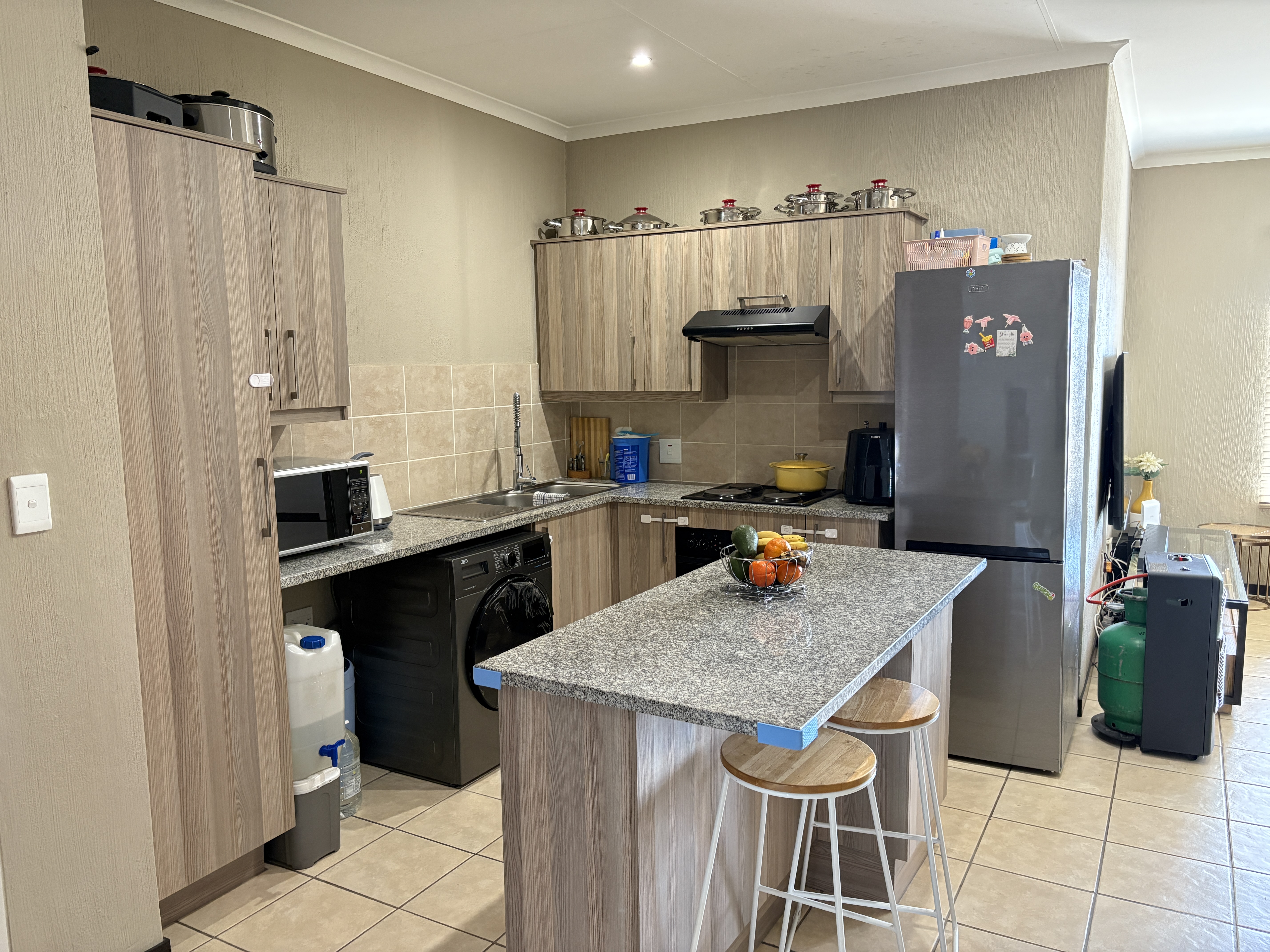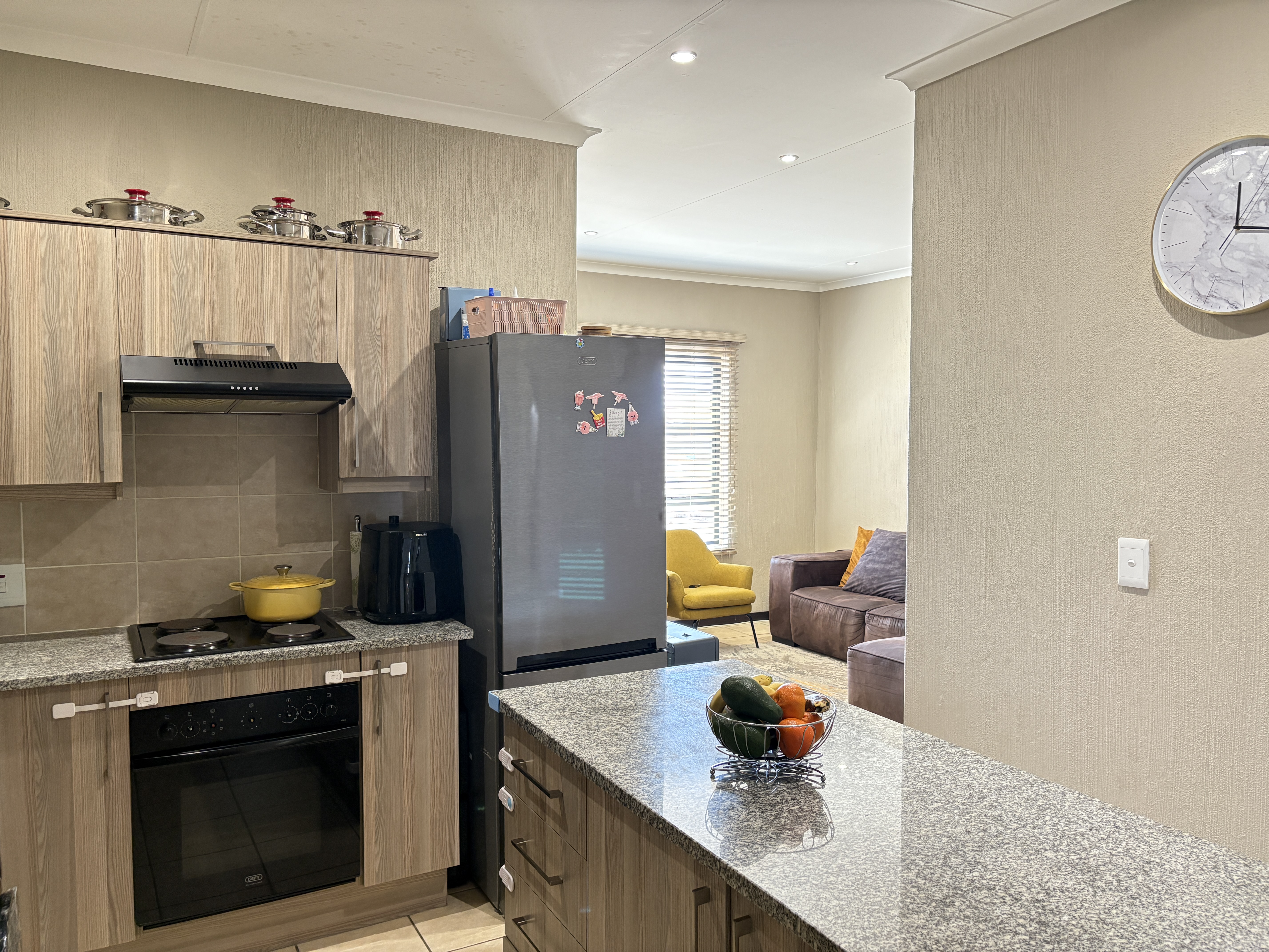This modern apartment features two spacious bedrooms with ample closet space, one bathroom clean and maintained, and an open-plan kitchen with ample counter space, perfectly suited for cooking enthusiasts. The lounge area provides a comfortable space for relaxation and entertainment.