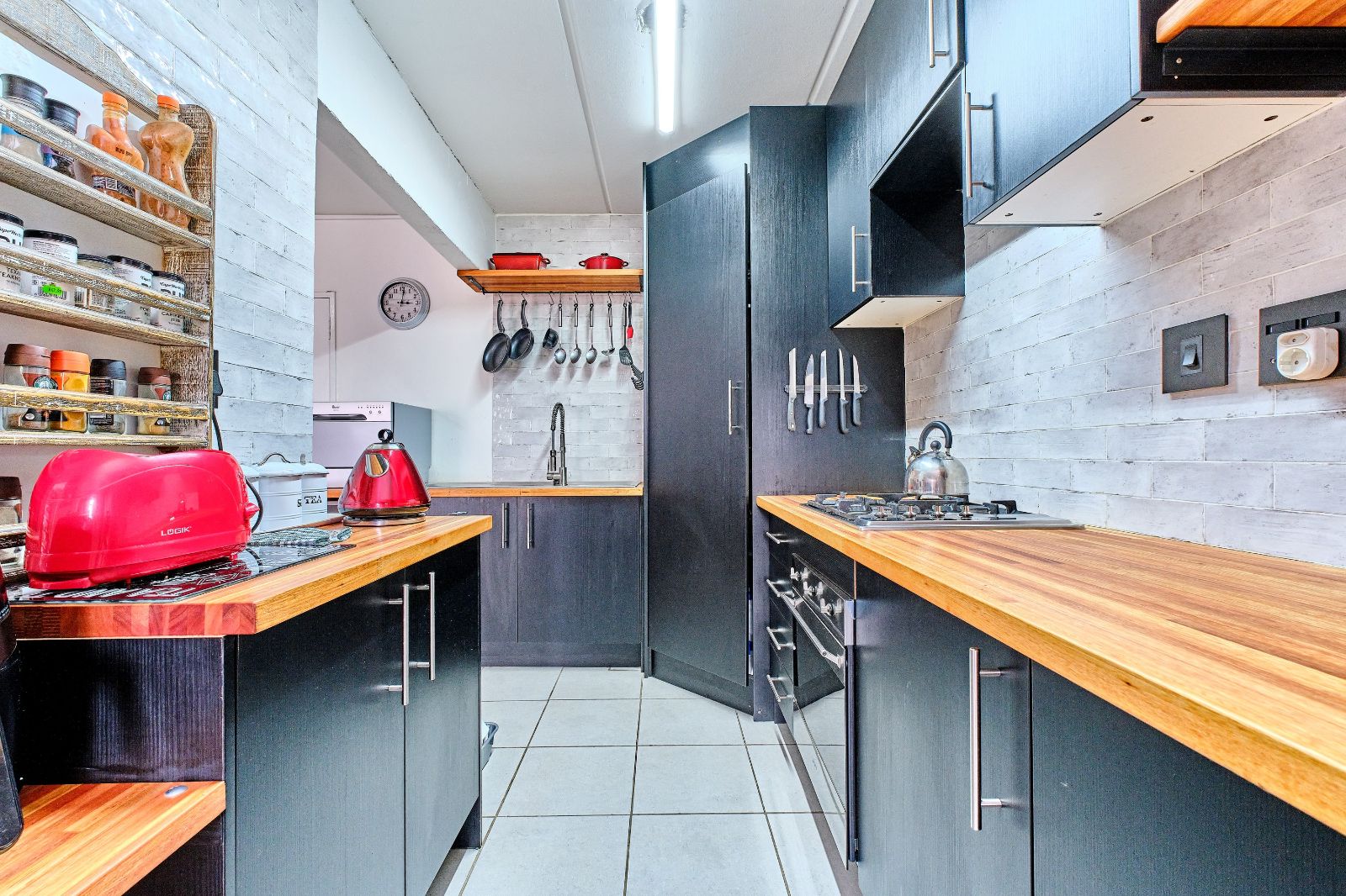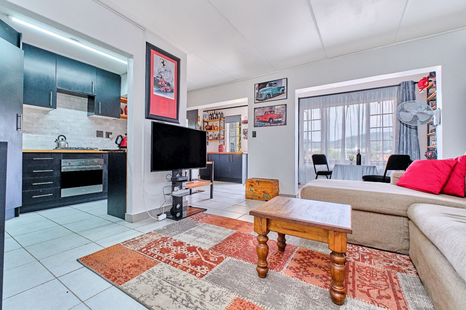 Open-Plan Living & Modern Kitchen - Featuring a countertop SWAN dishwasher, Smeg gas stove, under-counter oven, and ample built-in cupboards