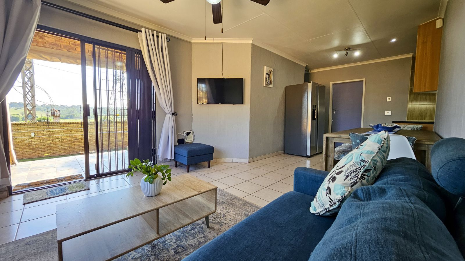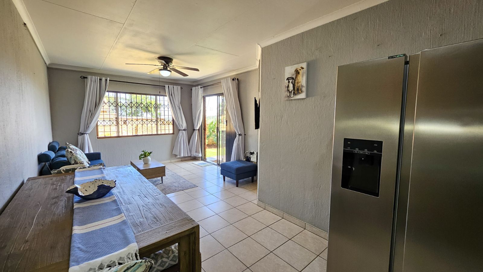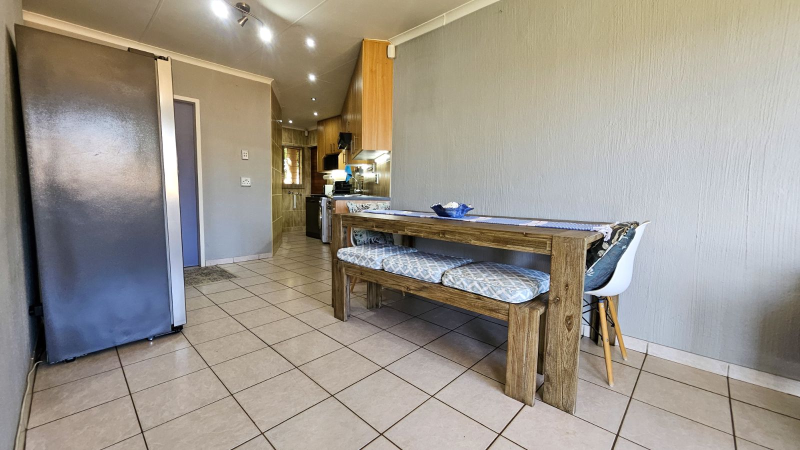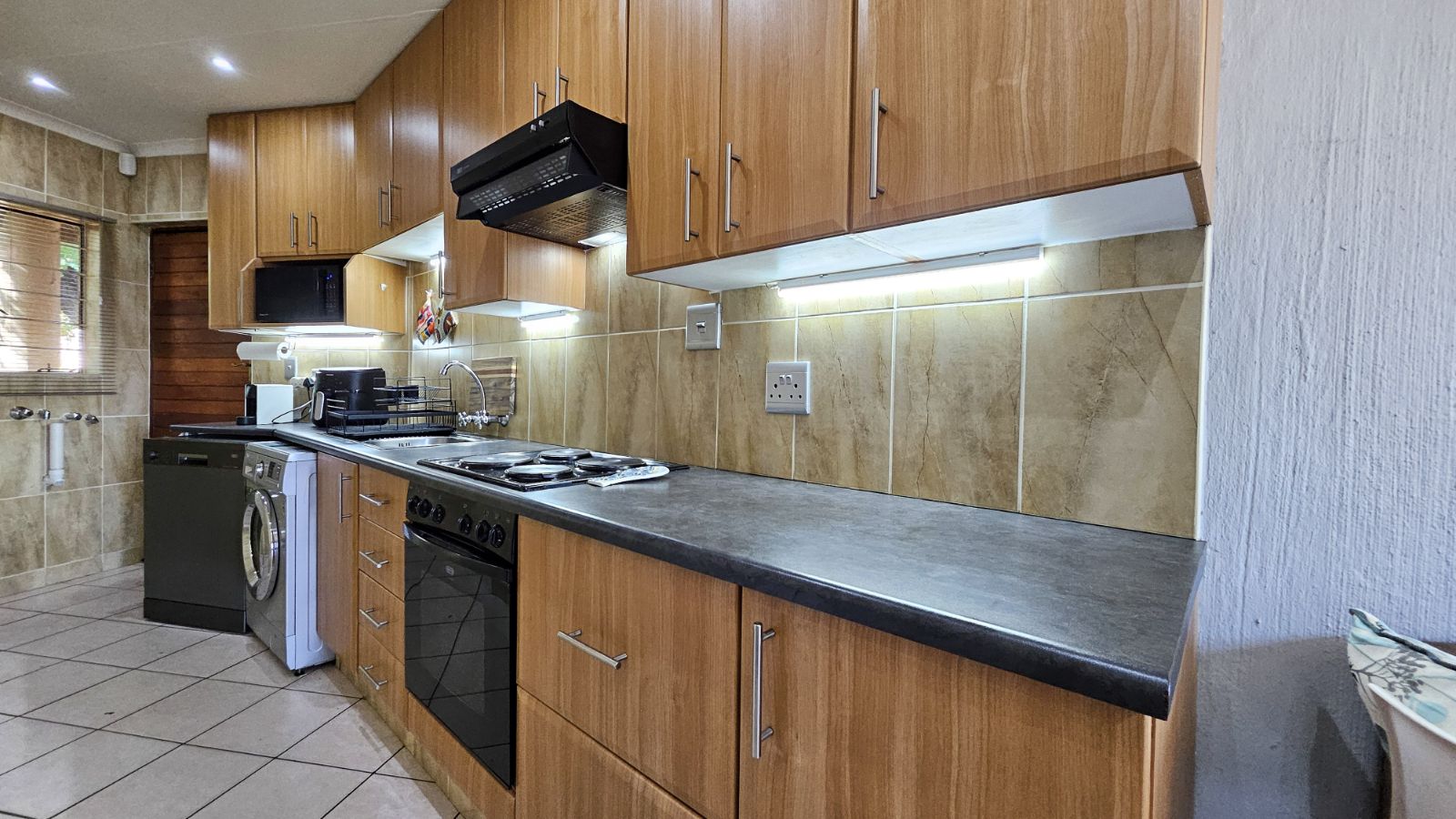 As you walk in you are greeted by a bright, open-plan lounge and dining area that flows effortlessly into a well-appointed kitchen. The kitchen offers ample cupboard space, two under counter appliance connections, space for a single-door fridge, plus an additional dedicated area with a connection for a top-loader washing machine—ideal for everyday convenience.