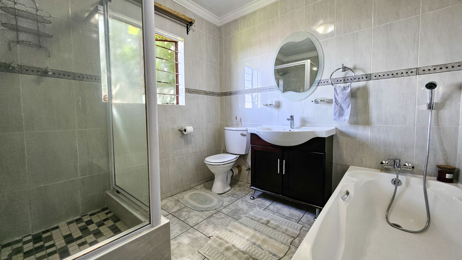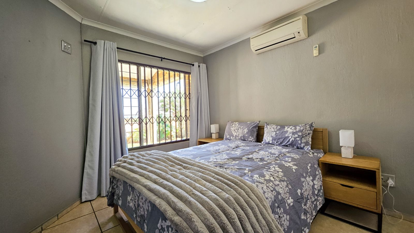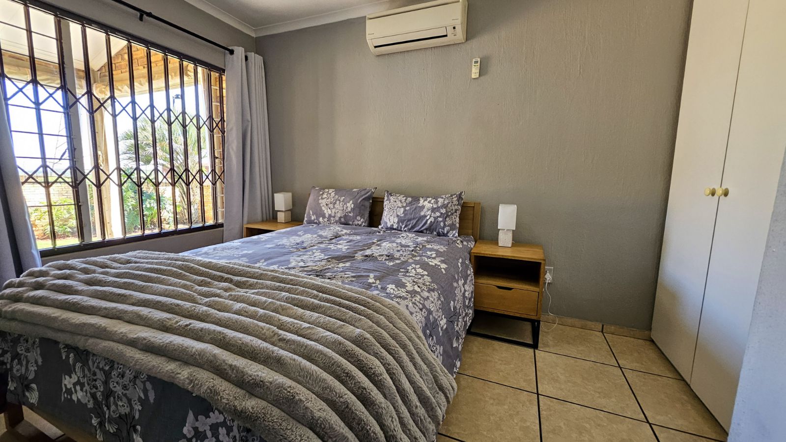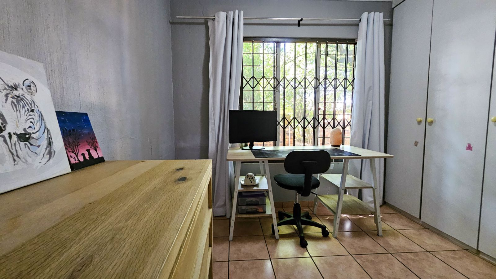 The main bedroom comfortably accommodates a queen bed with bedside tables, includes built-in cupboards, and an air con. The second bedroom, currently used as a study, can fit a single bed and also offers generous built-in cupboards. The bathroom is a neat full bathroom with both a bath and a separate shower.