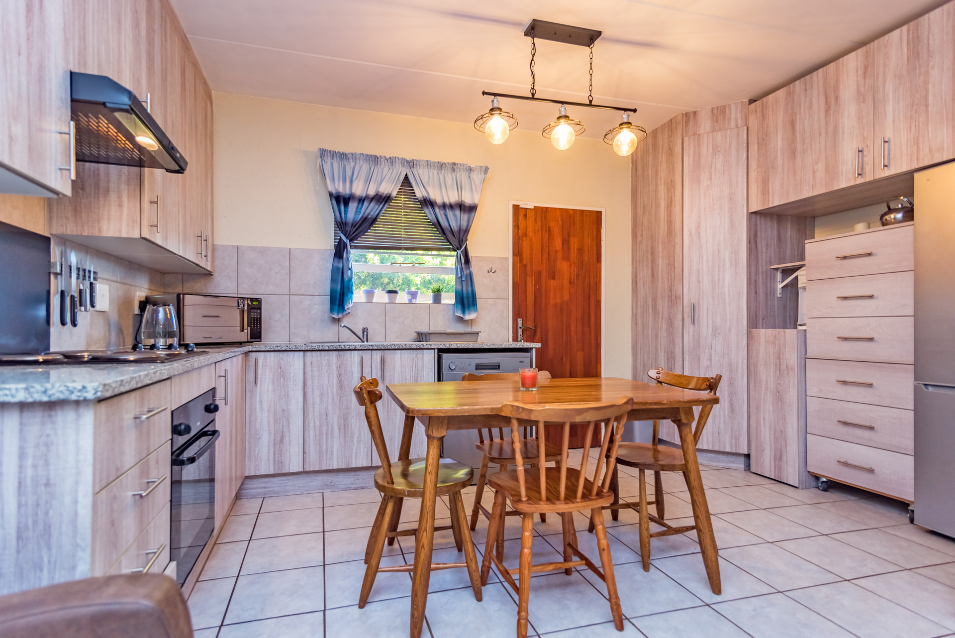 As you enter, you are greeted by the inviting open-plan lounge. The tiled space is filled with natural light thanks to a sliding door that extends to your private garden. The delightful, modern kitchen features elegant granite tops with ample cupboards and space for two appliances.