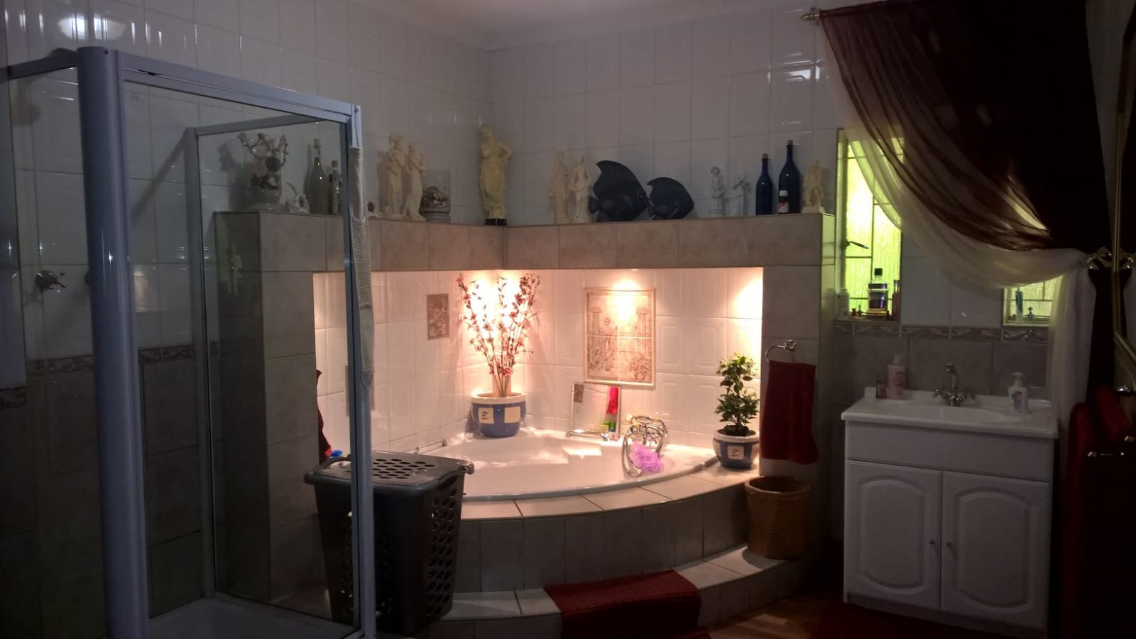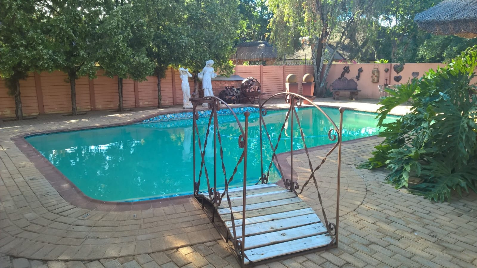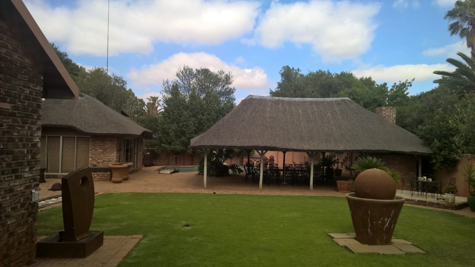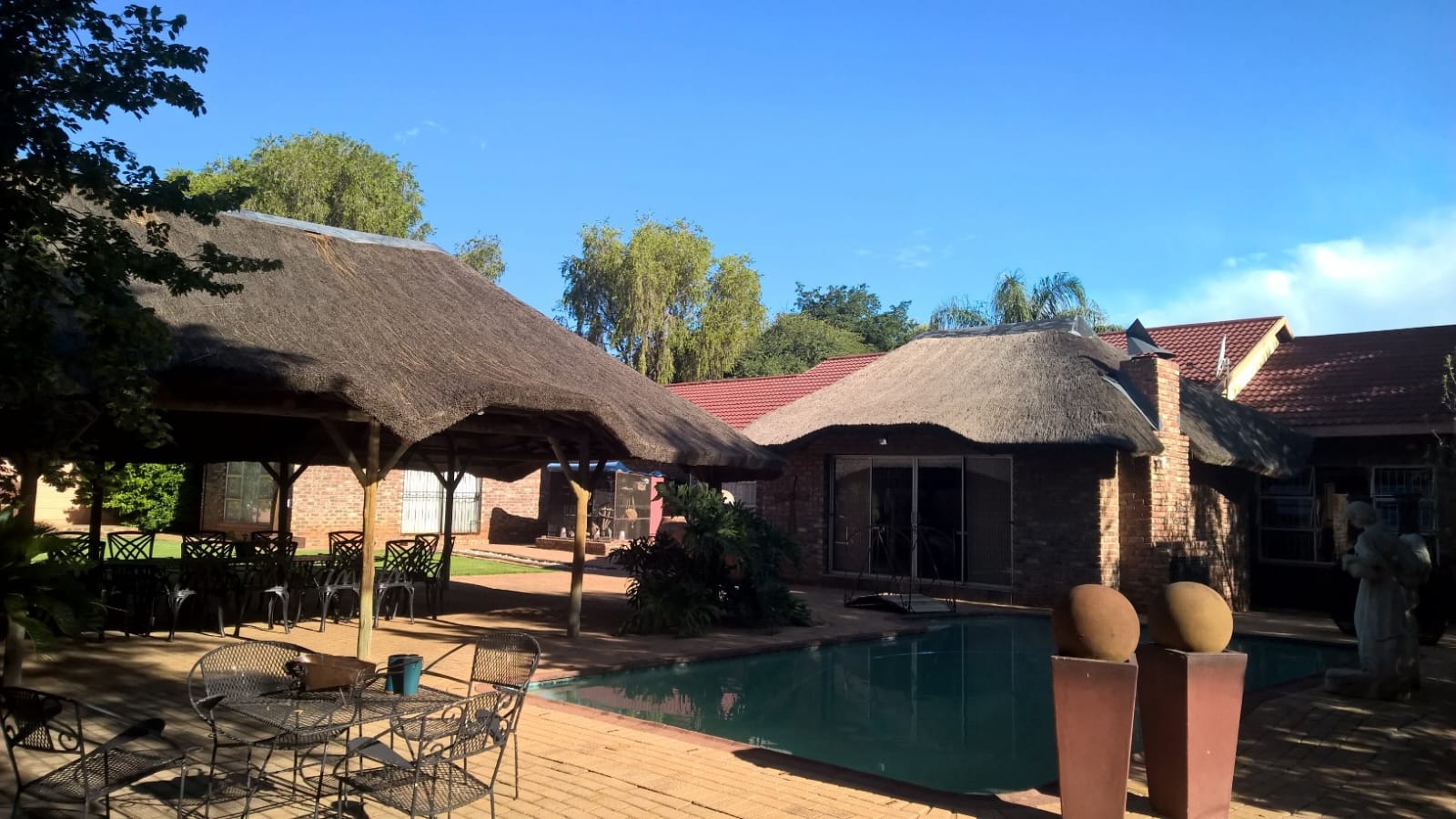 The main house features four spacious bedrooms, two bathrooms, a guest toilet, and multiple living areas, including a lounge, an open-plan kitchen, dining room, and TV room. A separate scullery, study, and laundry room add to the home's practicality. The entertainment areas are exceptional, boasting a lapa with a built-in braai, bar, and jacuzzi, as well as a larger outdoor lapa with another built-in braai. A sparkling swimming pool completes the perfect outdoor setting.
